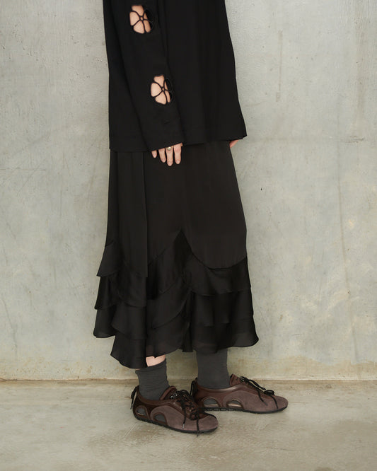 Rei Kawakubo works in degrees — silhouettes almost familiar, volumes just slightly excessive, tailoring softened precisely where it shouldn't be.