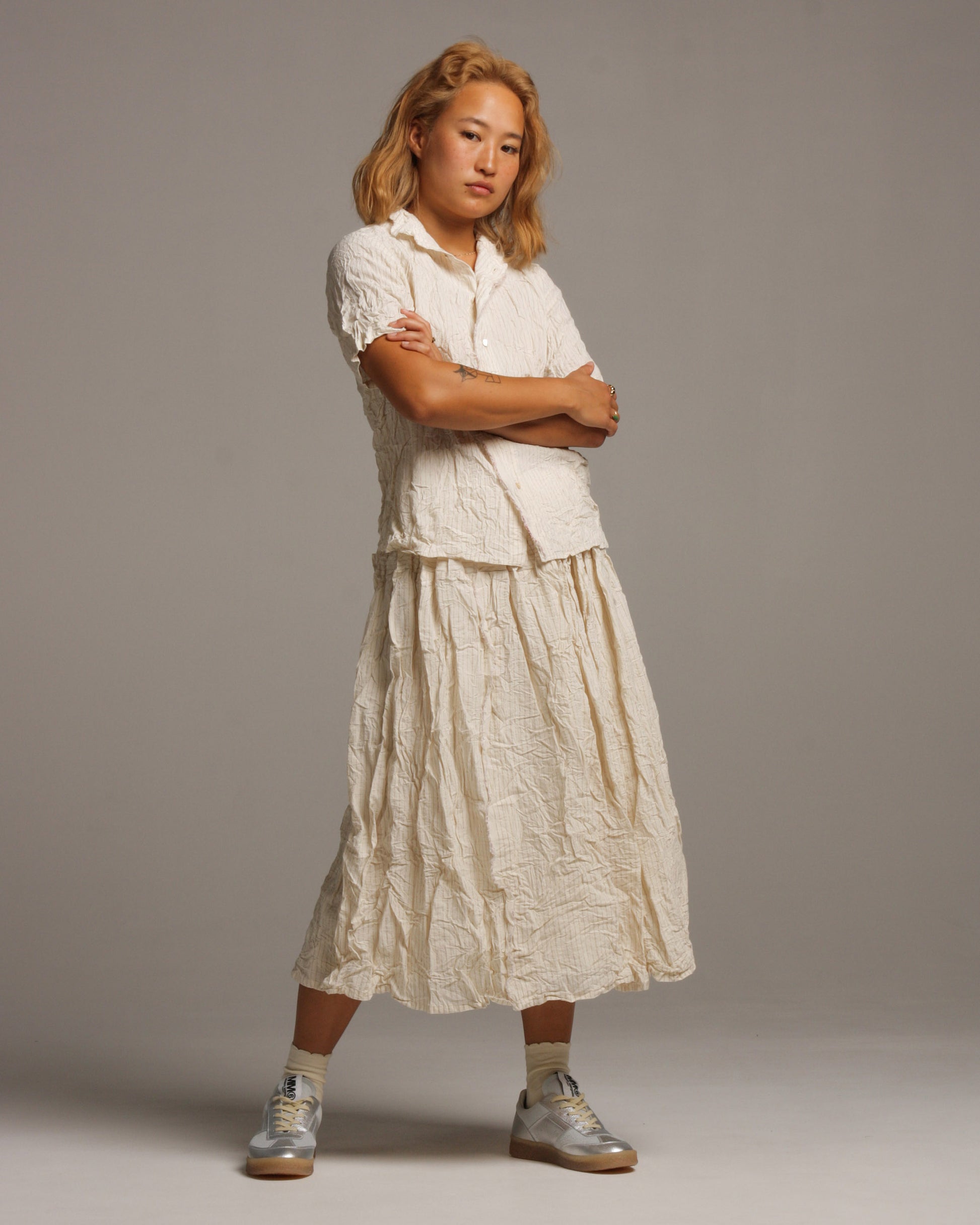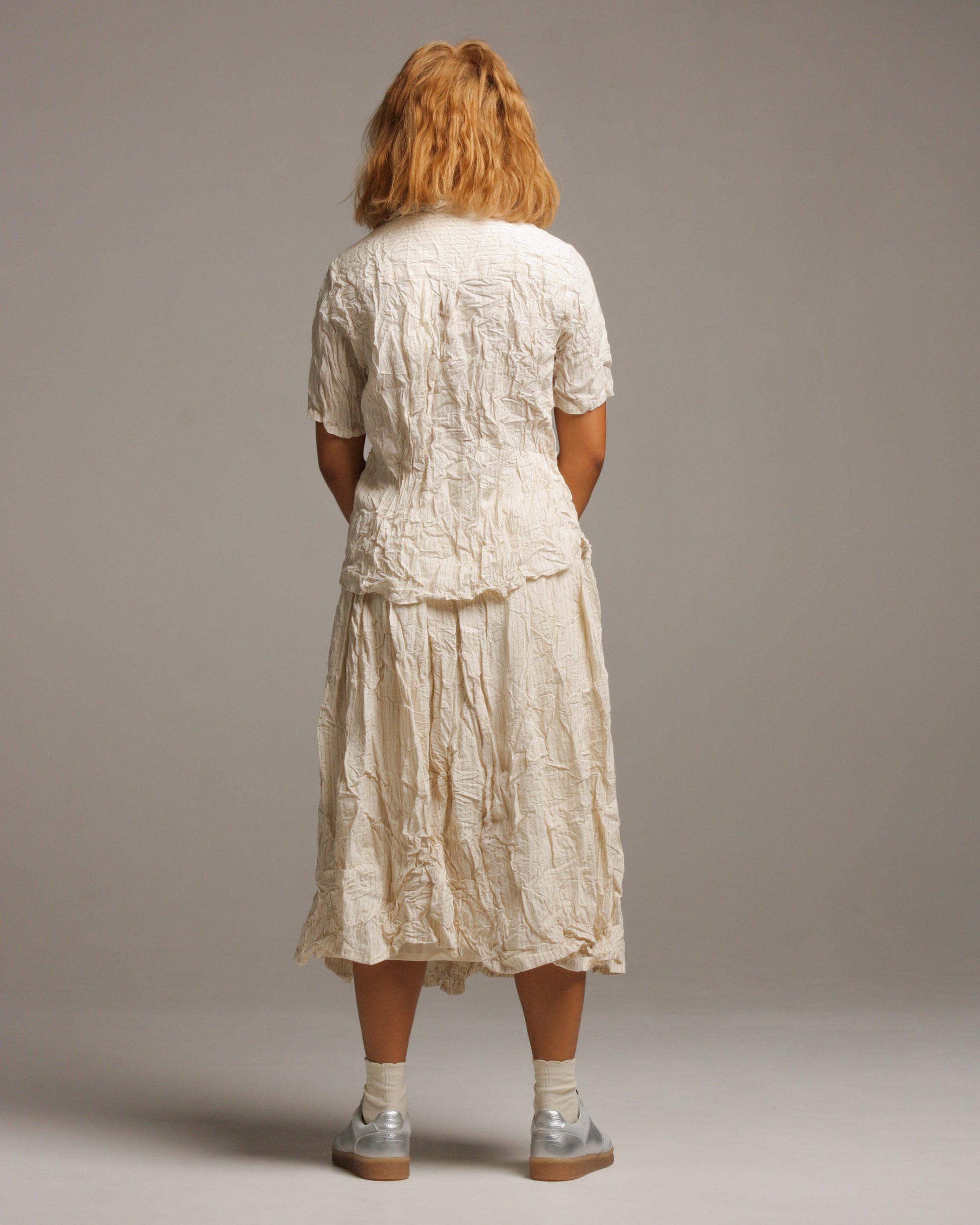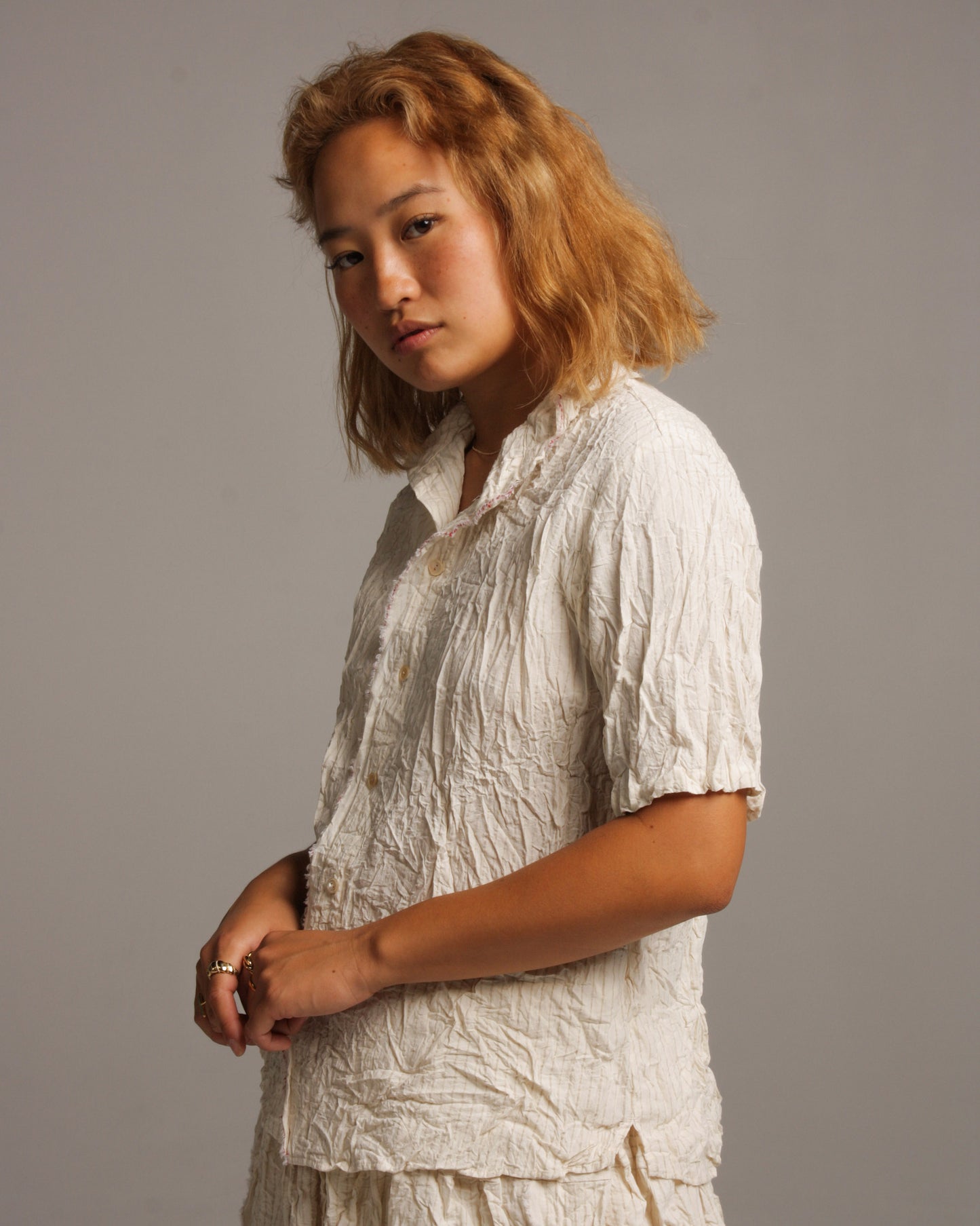 Wrinkled finish shirt by Pas de Calais in natural tone. Short sleeves with narrow pointed collar. Cotton and linen yarn is expressly woven to emulate a striped texture, before the fabric is shrunk to give a wrinkled look. Special frayed selvedge hems at the collar and button placket finishes with artistic flair.