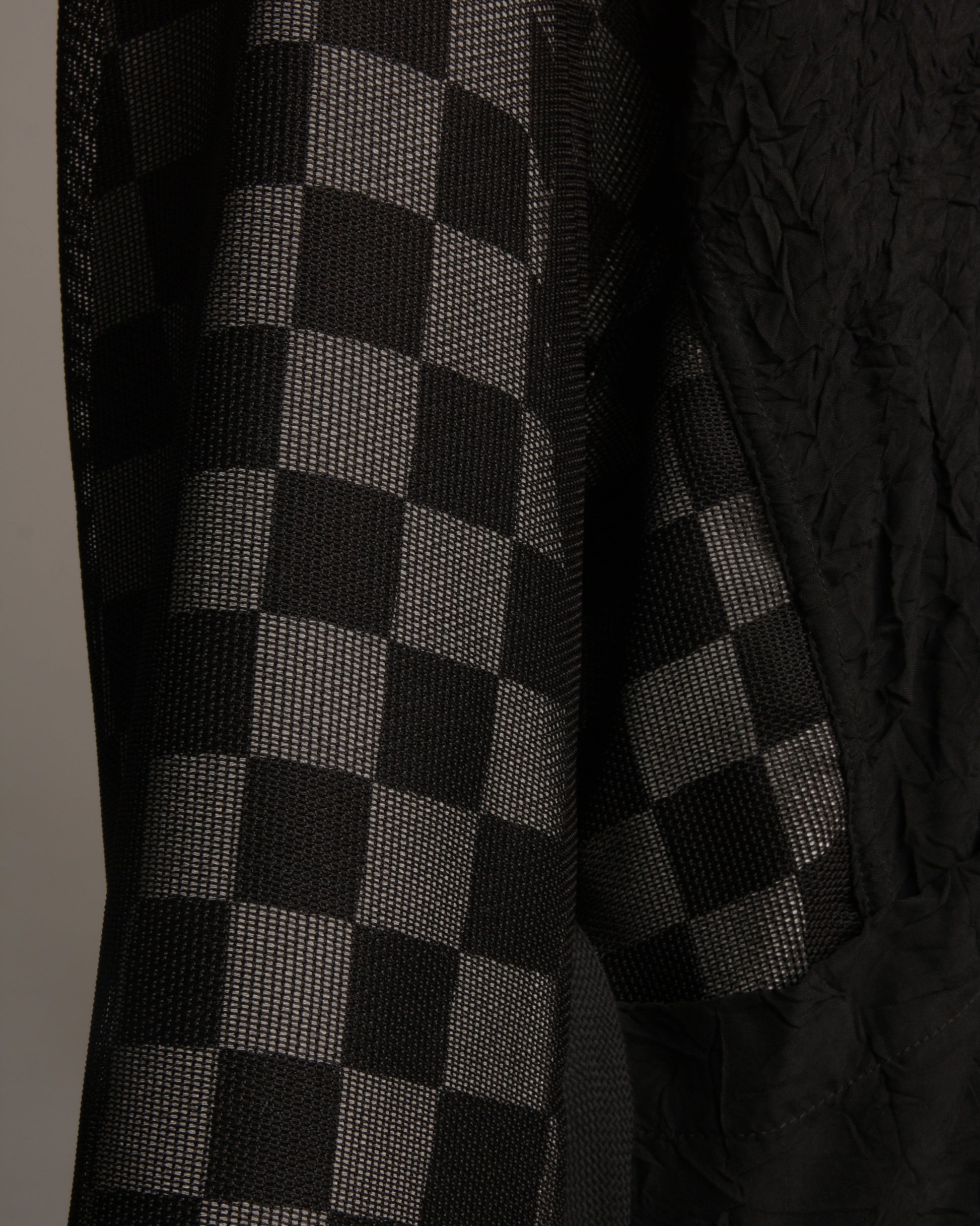 Patch pocket jacket by Song for the Mute. Kimono style jacket with panelled construction offering a cacophony of textures. Mesh covered checkerboard contrasts with teal gingham and crinkled black viscose. Featuring a wrap-front with cinch tie at the waist, notched lapels and large patch pockets.