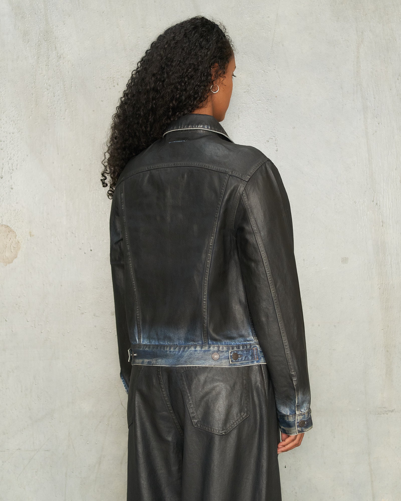 Coated denim jacket by Acne Studios in black. Classic denim jacket silhouette reimagined in washed indigo with a pressed black leather coating. Subtle gradient at the hem reveals the coating process. Finished with full button fastening and chest pockets.