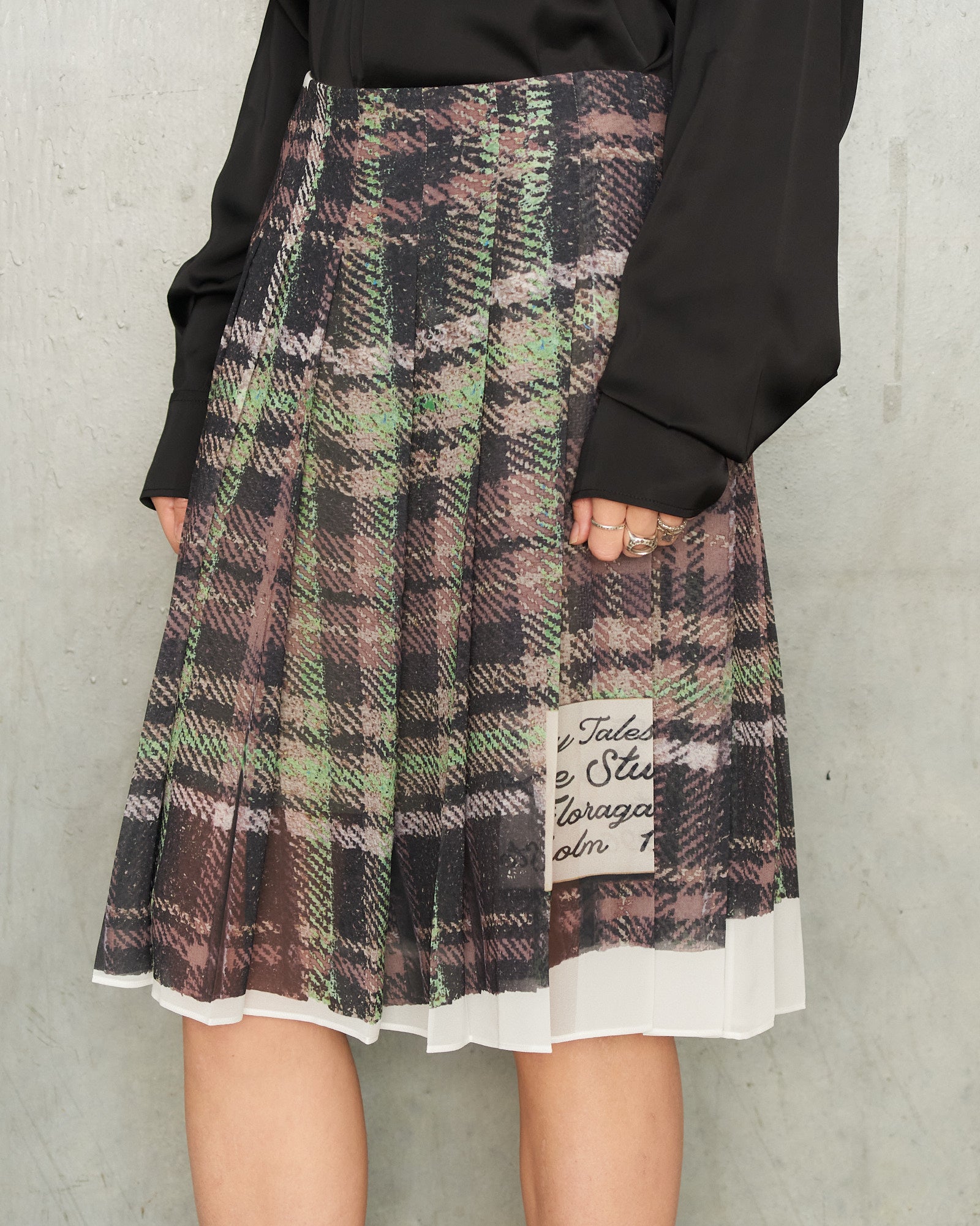 Pleated check skirt by Acne Studios in green. Short pleated skirt in a lightweight, structured polyester. Trompe-l’œil check print is scattered across the folds, playfully distorting the classic silhouette with an ever-shifting edge. Novelty logo tab at the hem and side zip fastening.