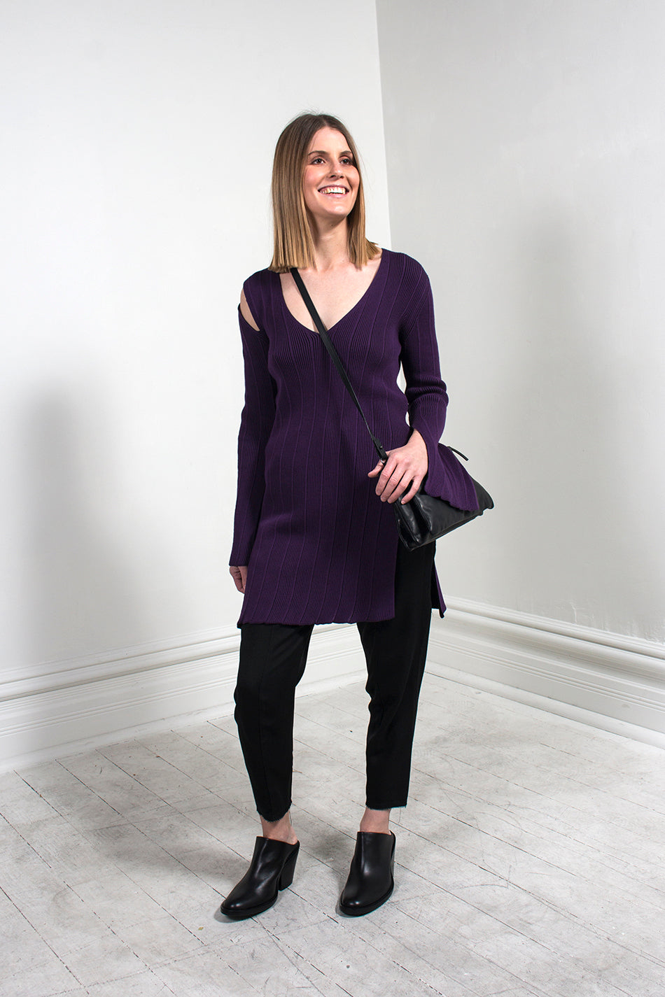 'Medan' fine ribbed sweater by Ann Demeuelemeester. Features slits in the right shoulder seam and a high split in the left side seam. Long in the body. Delicate handwash or dryclean.