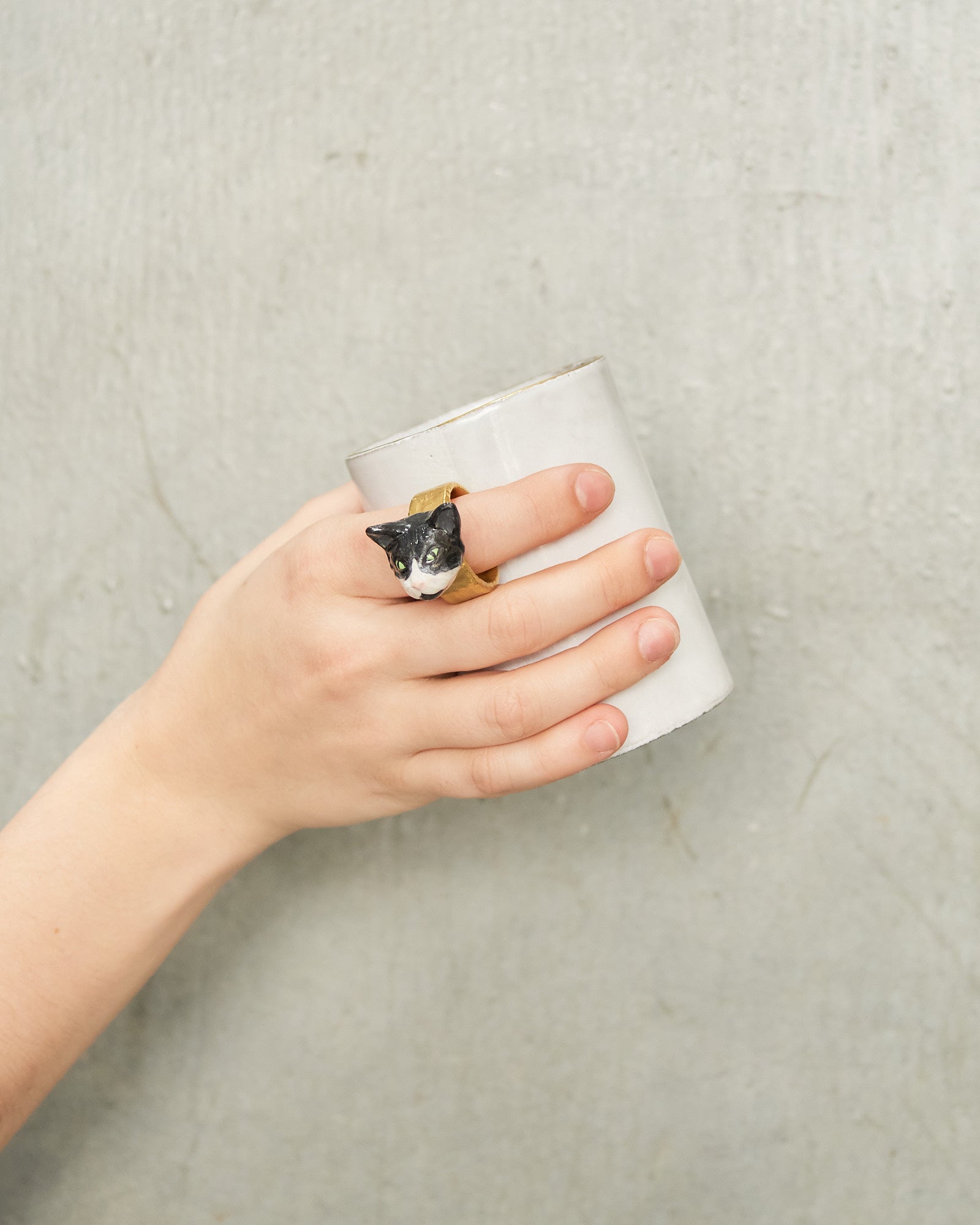 Cat Ring Cup by Astier de Villatte. A handmade ceramic cup featuring a golden ring handle, accented with a sculpted, hand-painted cat head for a subtle, whimsical touch.