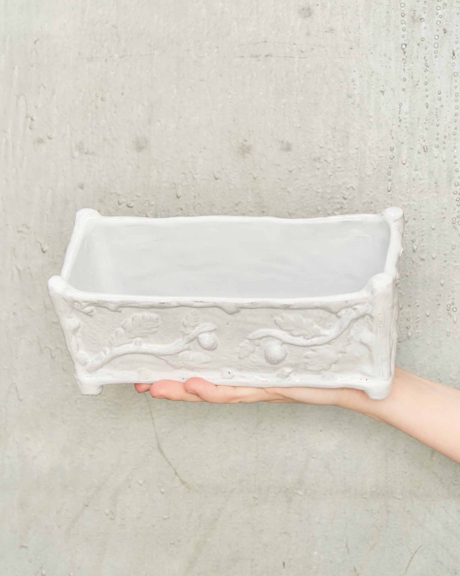 Edmond Window Box by Astier de Villatte. A distinctive vessel where form meets function, featuring a box design adorned with sculpted oak leaves and branches—a striking addition to any tableware collection.
