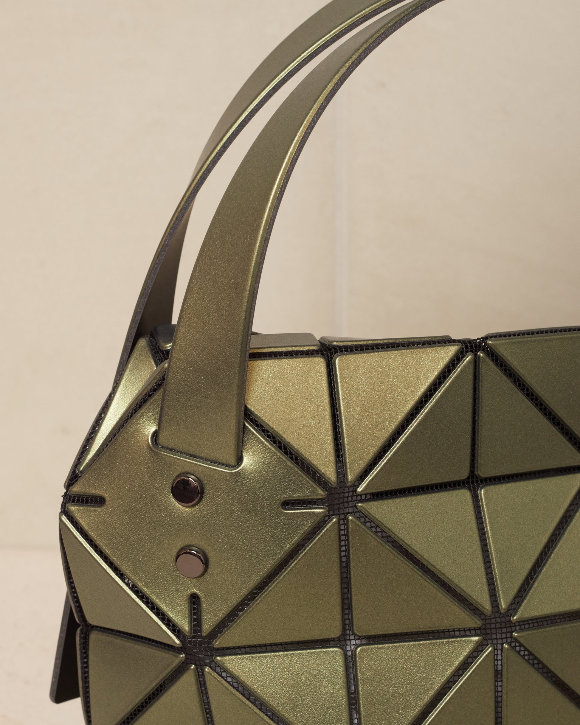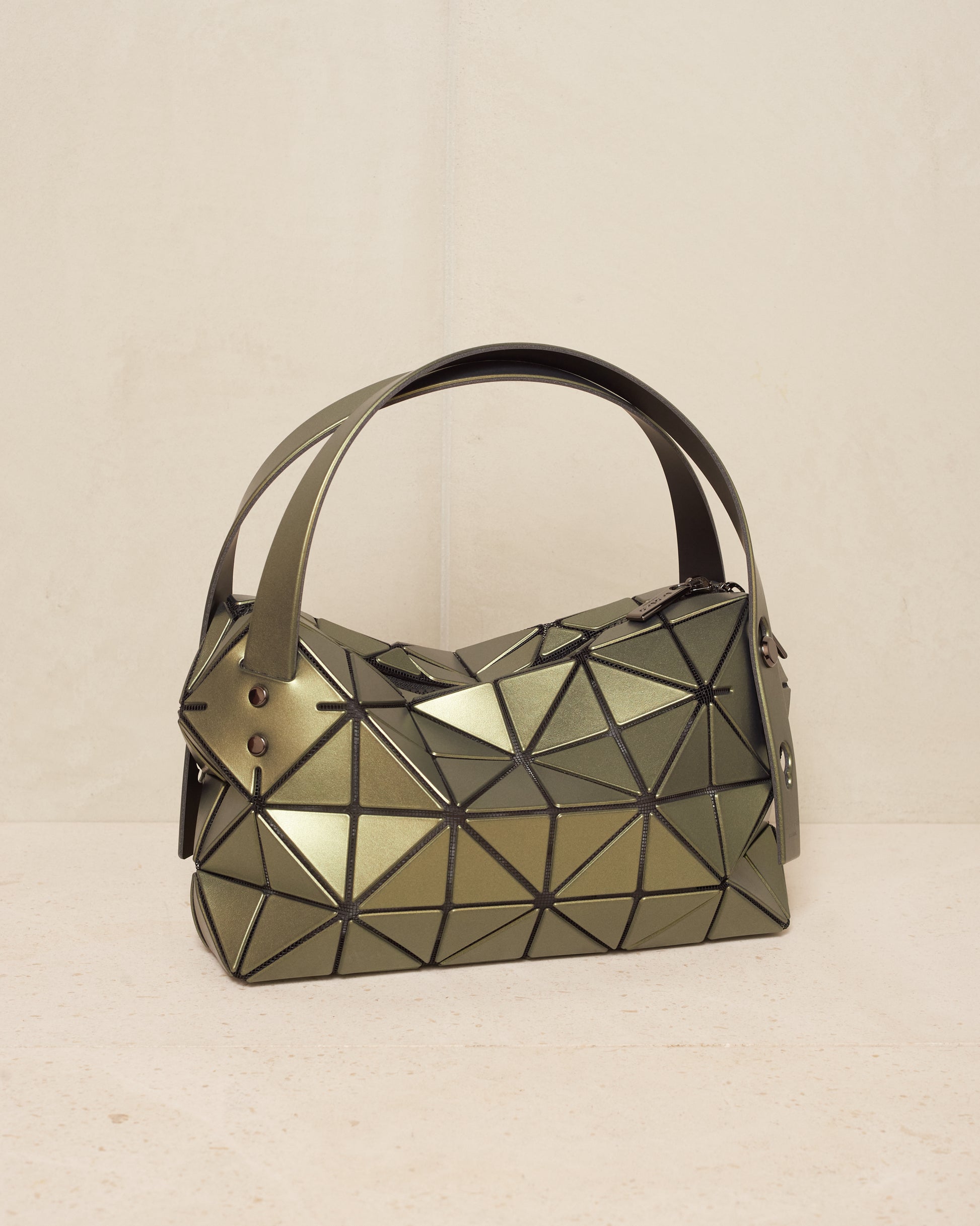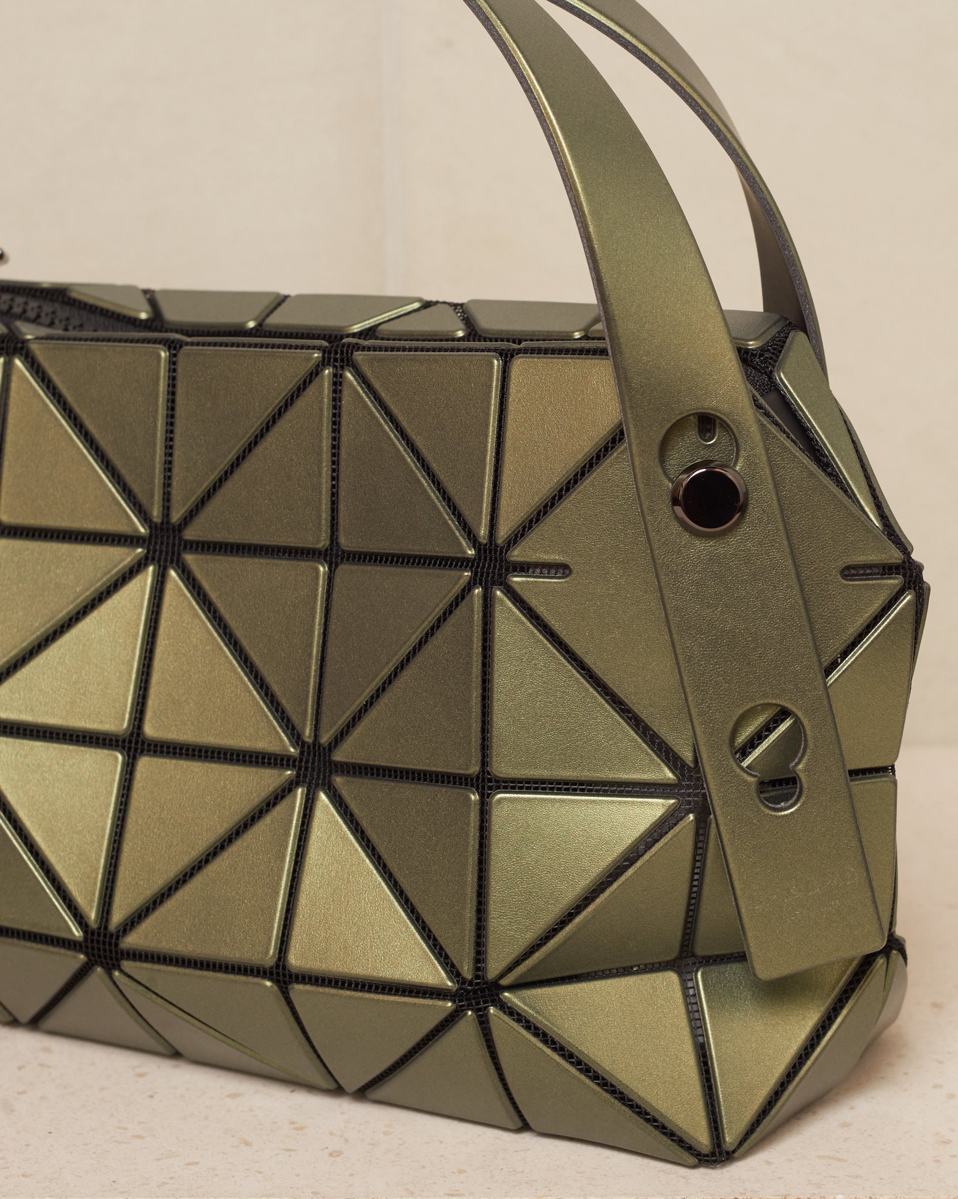 Boston bag by Bao Bao Issey Miyake in khaki green. Classic hand or shoulder bag with twin adjustable straps. Handy size with sturdy base and studded feet. Compact rectanguar shape offers a deceivingly spacious capacity, while the signature triangular motif has a reflective leather-like finish.