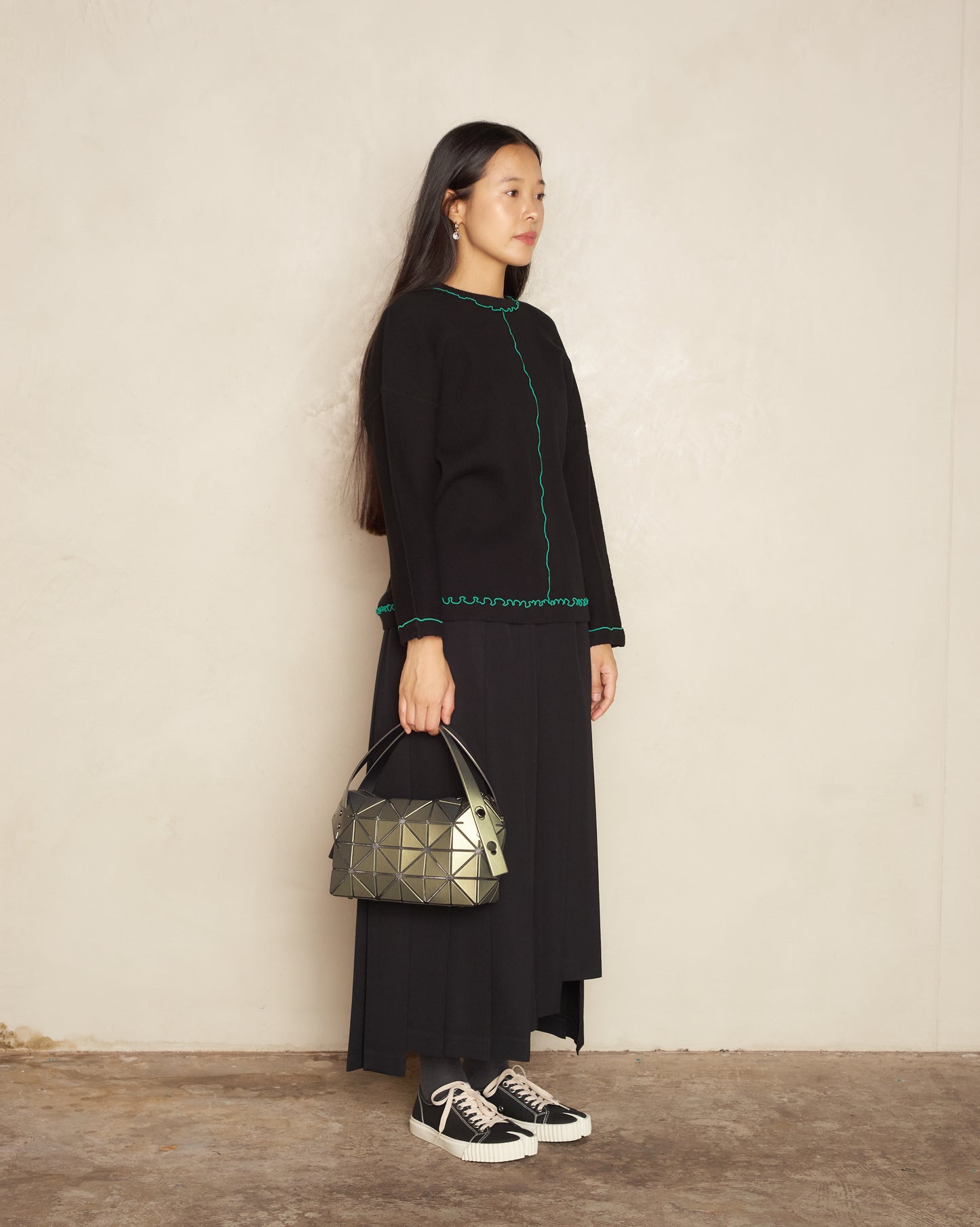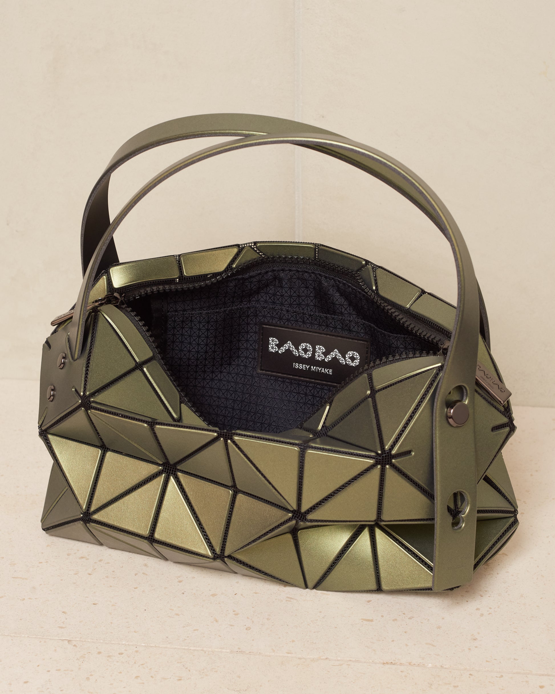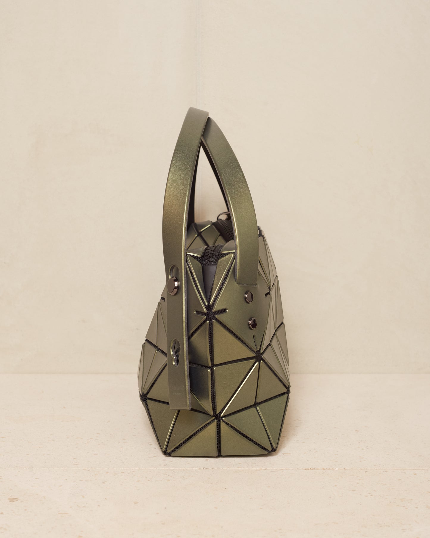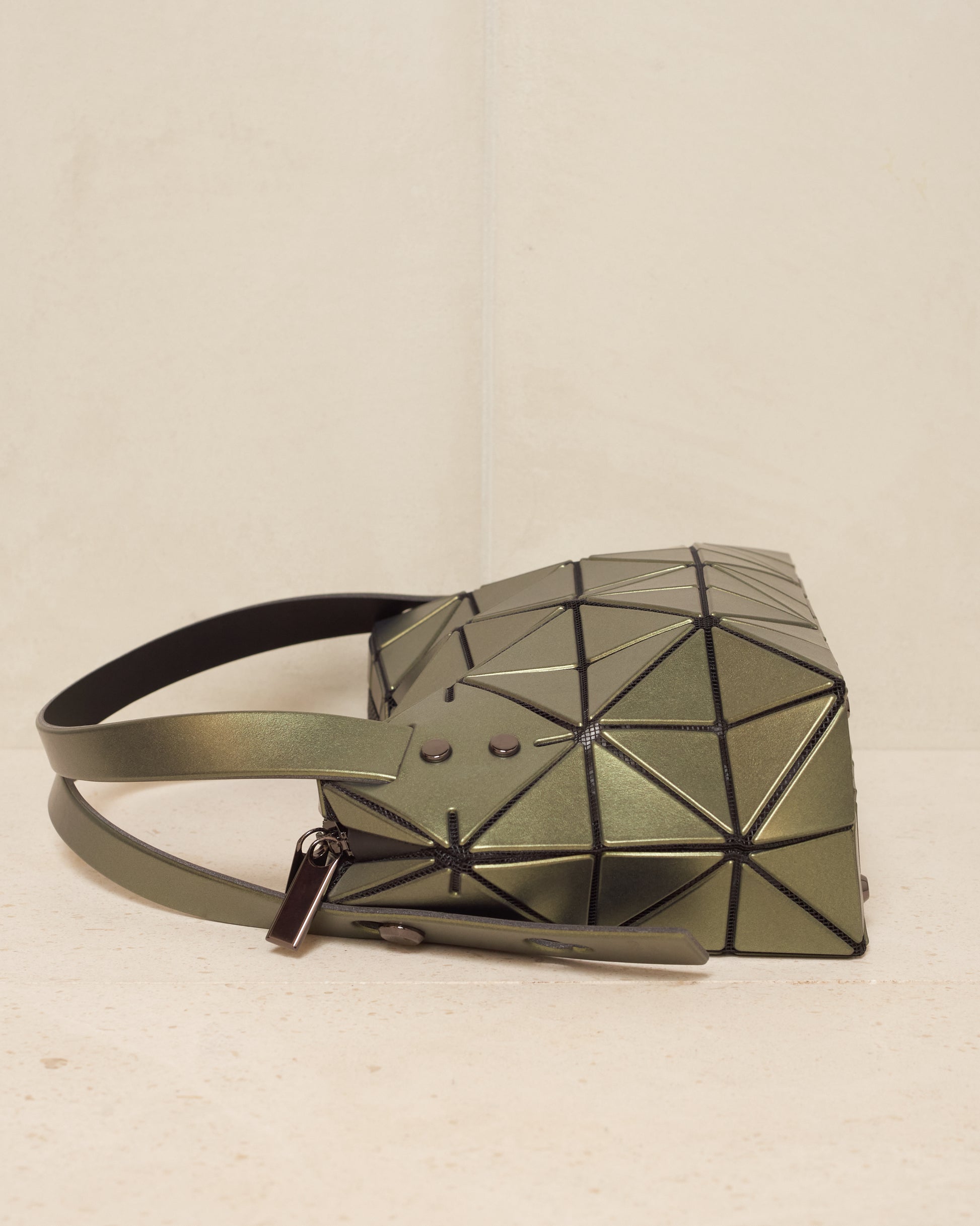 Boston bag by Bao Bao Issey Miyake in khaki green. Classic hand or shoulder bag with twin adjustable straps. Handy size with sturdy base and studded feet. Compact rectanguar shape offers a deceivingly spacious capacity, while the signature triangular motif has a reflective leather-like finish.