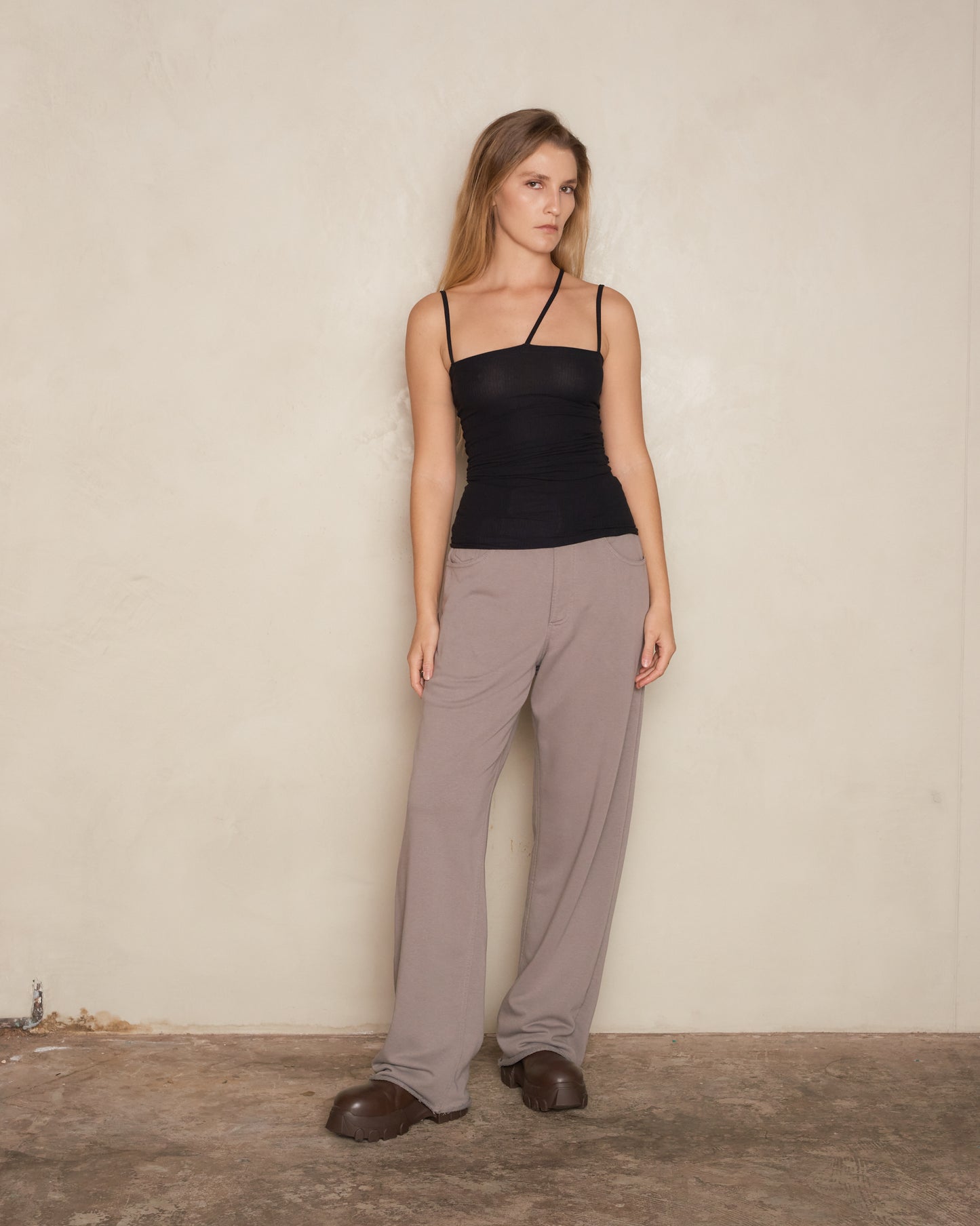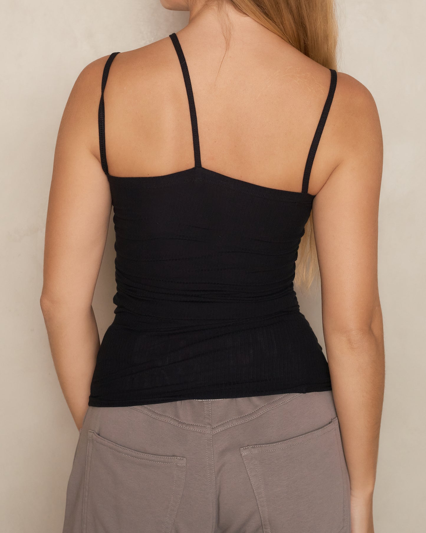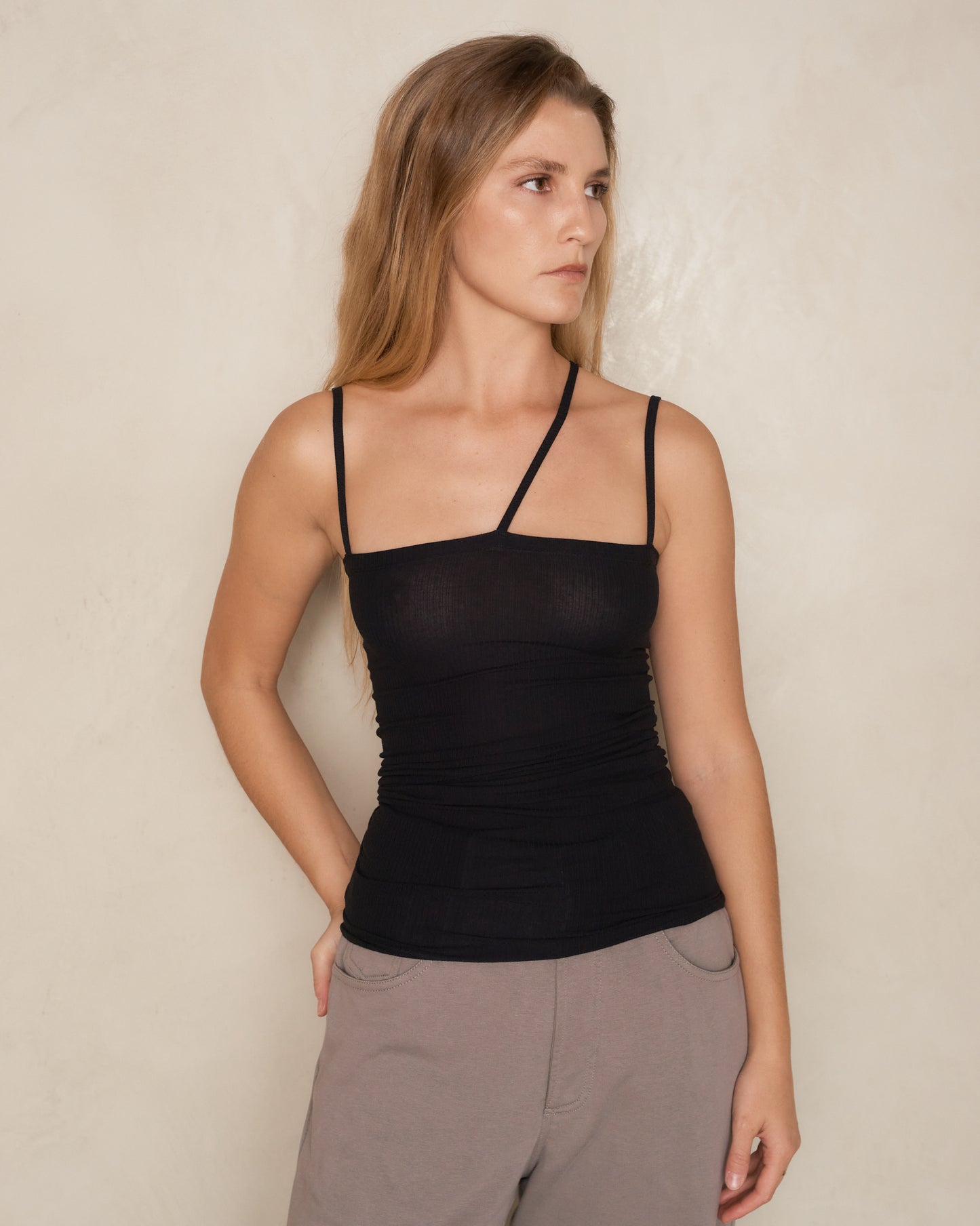 Nida tank by Baserange in black. Thin elasticated straps straddle the shoulders while a third asymmetric strap clinches the neck. Crafted from a comfortable and softly fitting fine ribbed organic cotton blend. An everyday essential with a subtle twist.
