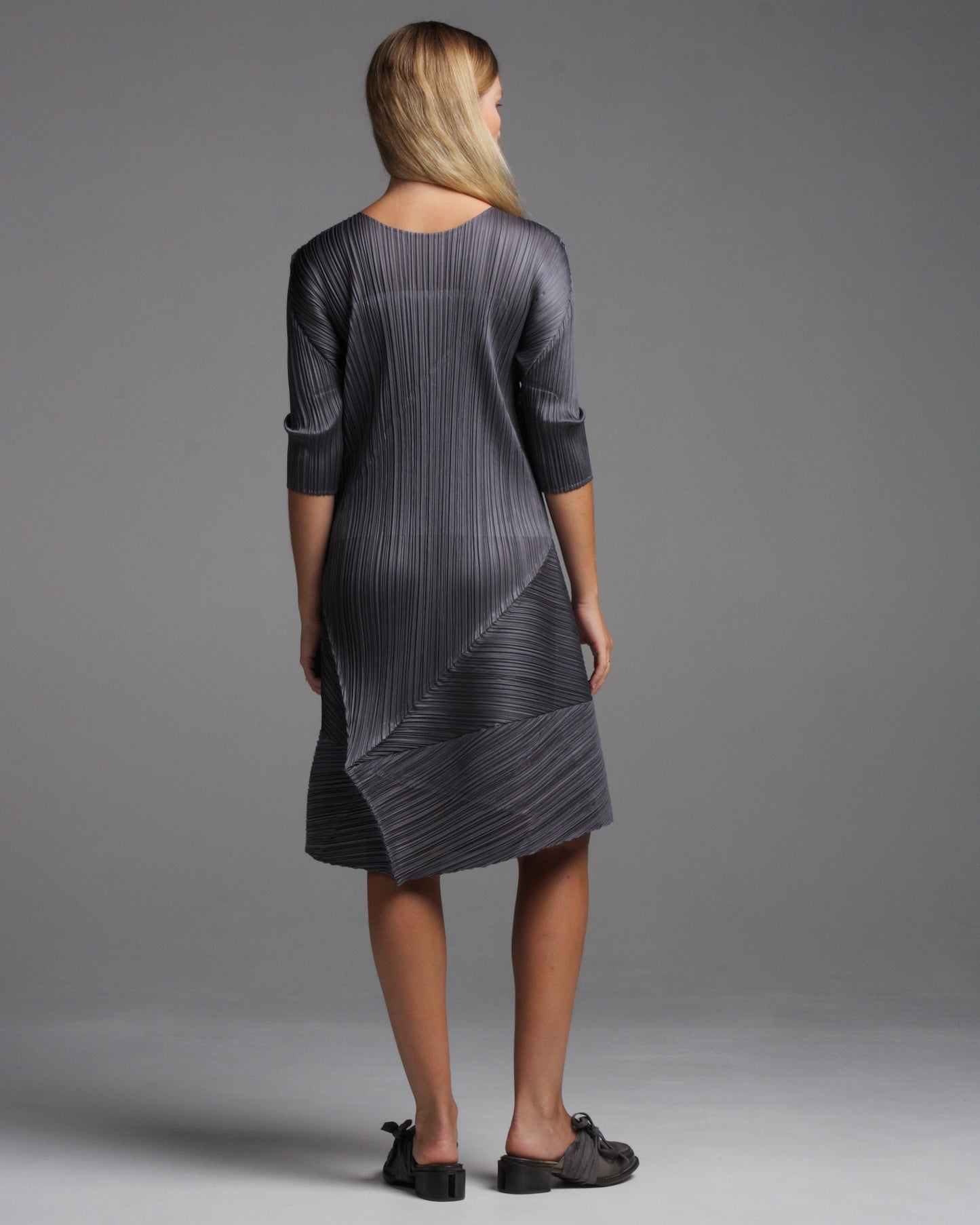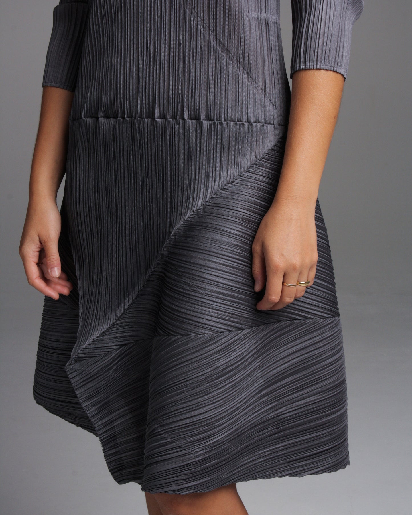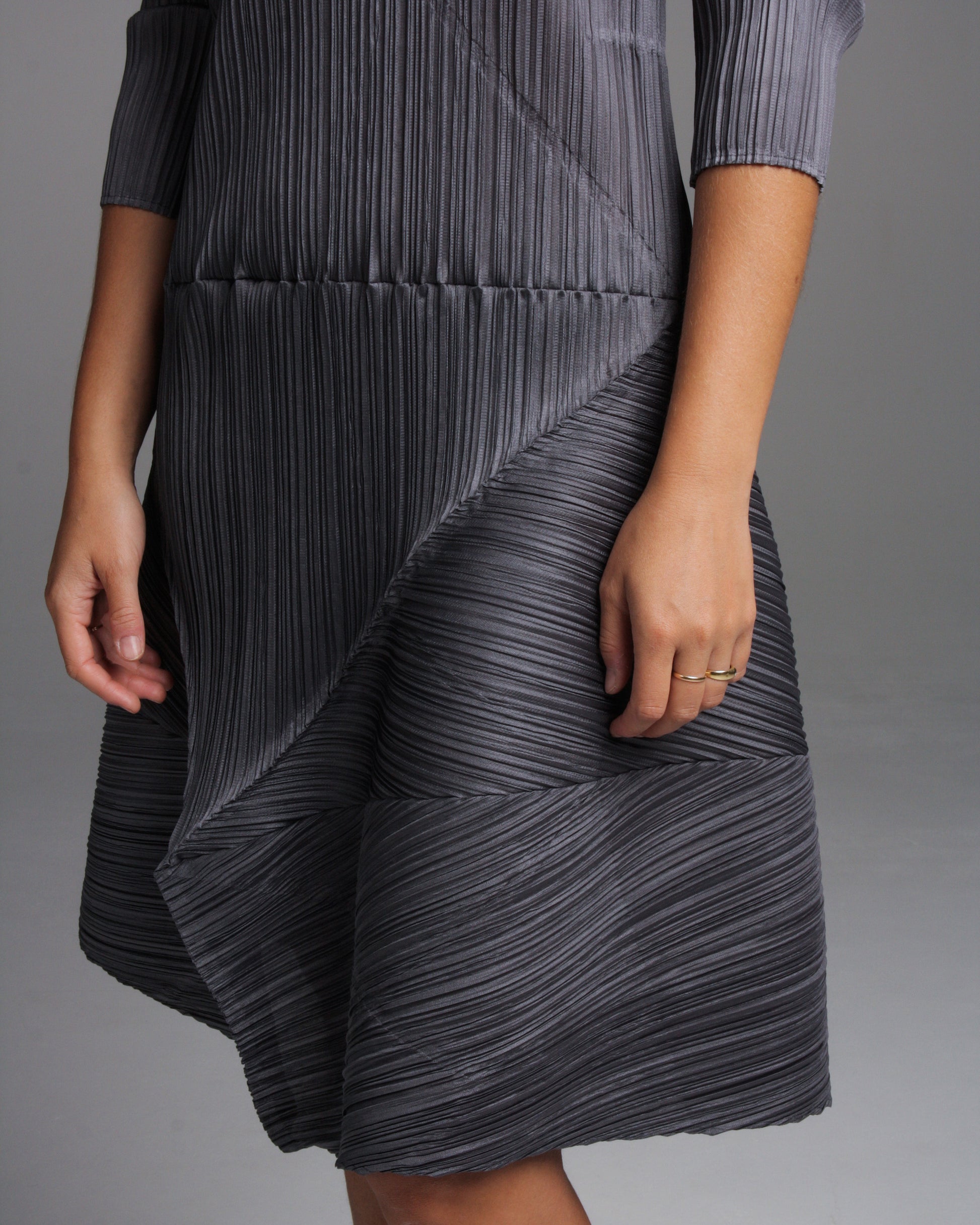 Truss mid sleeve dress by Pleats Please Issey Miyake in grey. Round neck dress with crisp pleating. The garment is folded at multiple angles before the pleating process, opening up to reveal a dramatic geometric volume and A-line silhouette. Can be folded completely flat for easy storage and travel.