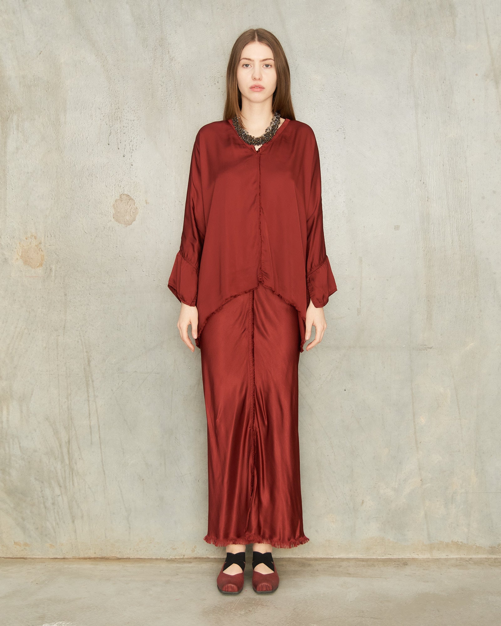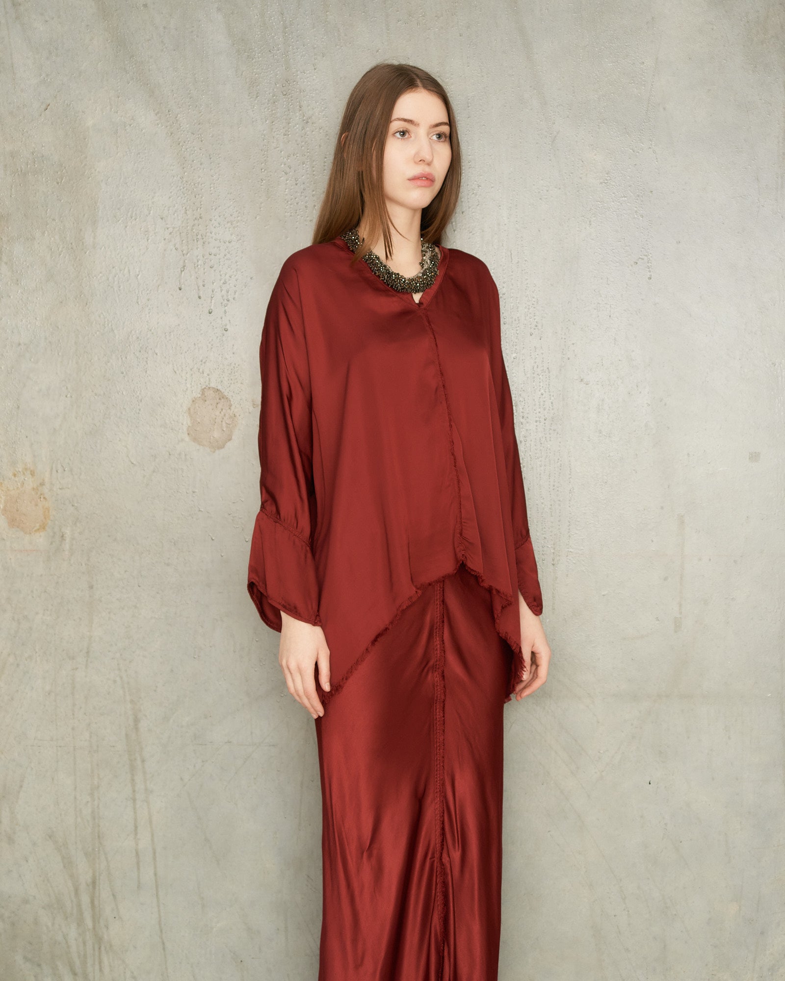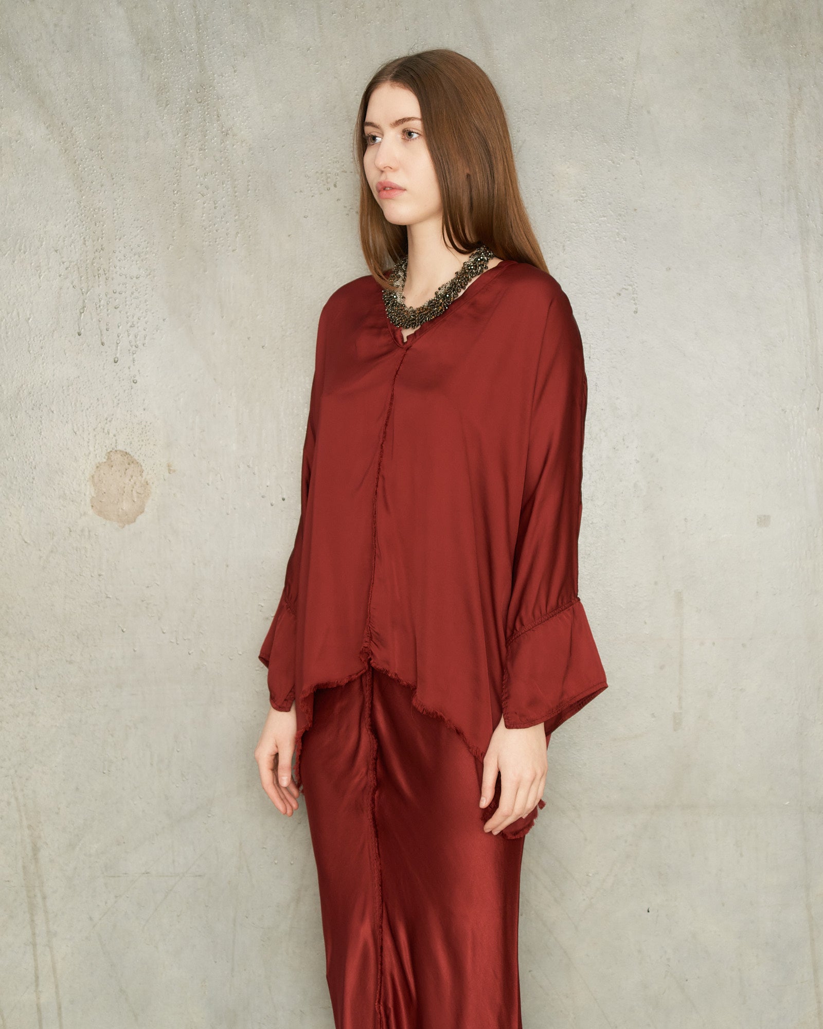 Layla blouse by Jaga in burgundy. Simply handcrafted blouse in lustrous rayon. A wide V-neckline takes a slice out of bias cut panels, converging with a clean central seam and opening up to an inverse V-hemline. Dropped shoulders complete the relaxed silhouette with draped sleeves finished and open cuffs.