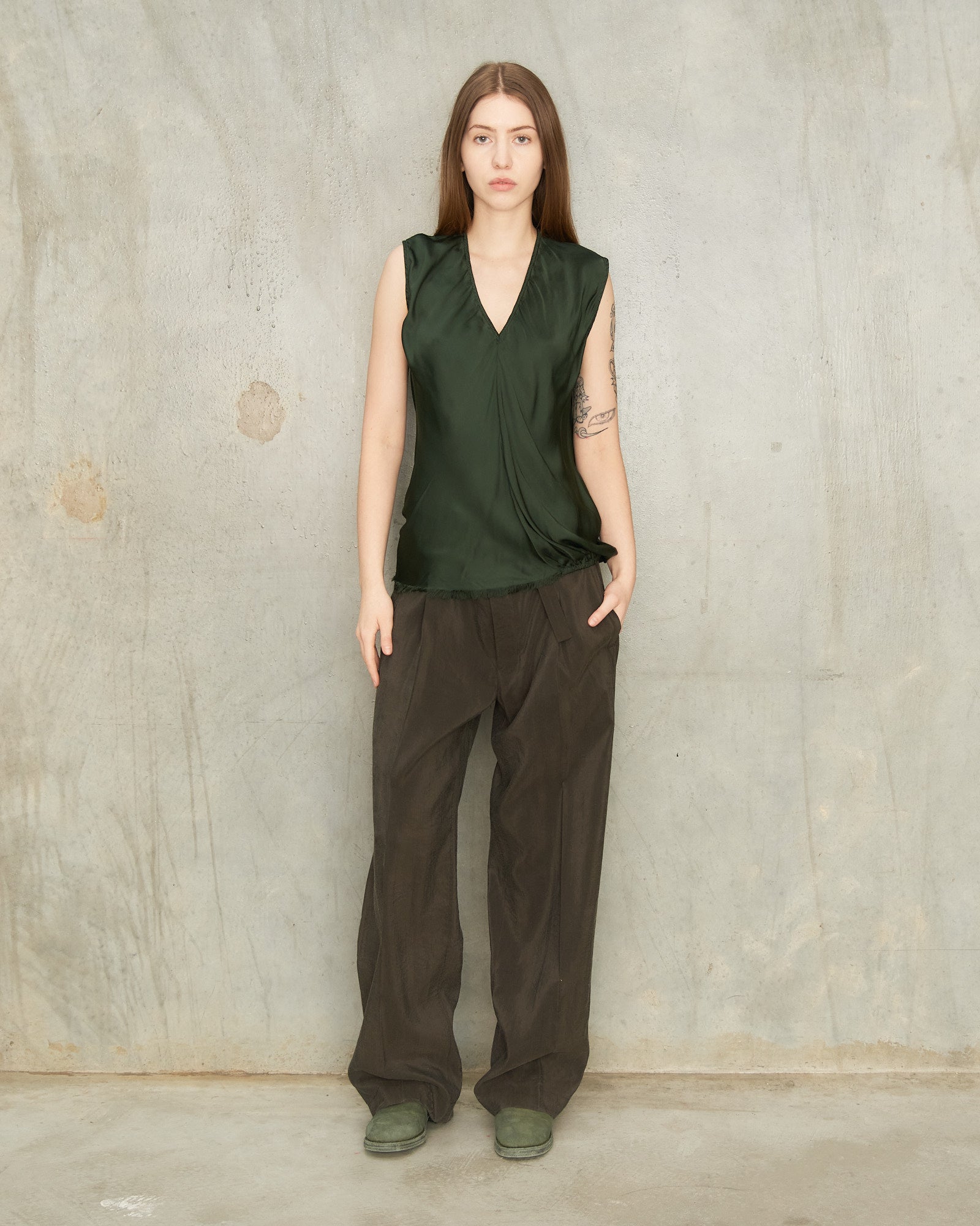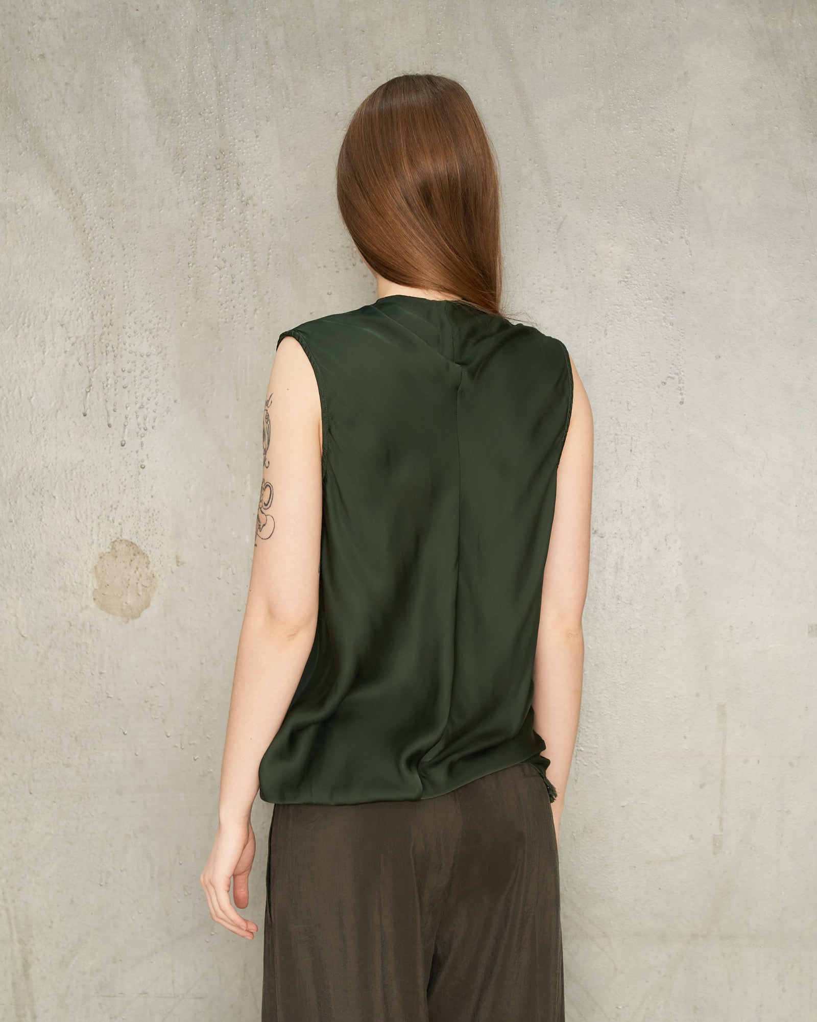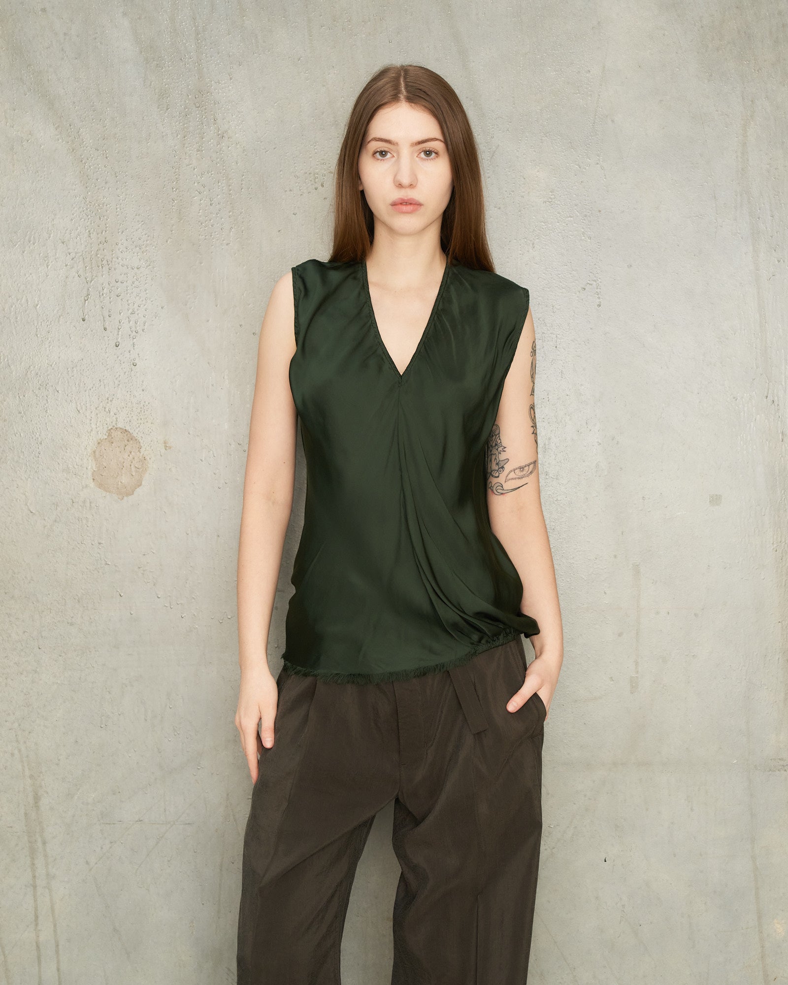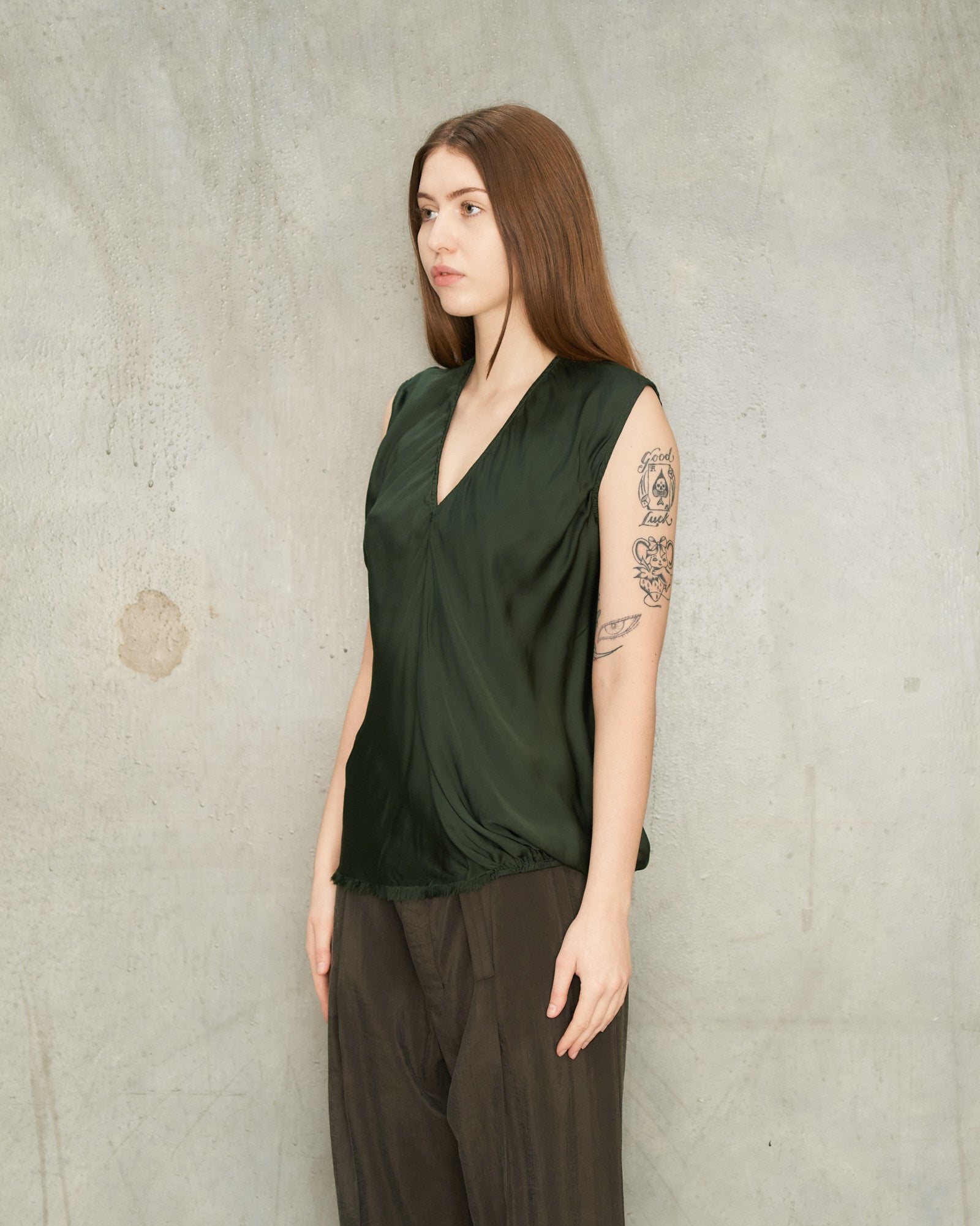 Boca top by Jaga in jade. Cut from lustrous satin in a vivid jade hue, this V-neck top is defined by bias-cut panels converging in discreet central seams. An elasticated band gathers at the left waist, artfully hiking the silhouette into an asymmetric drape that feels both sculpted and fluid.
