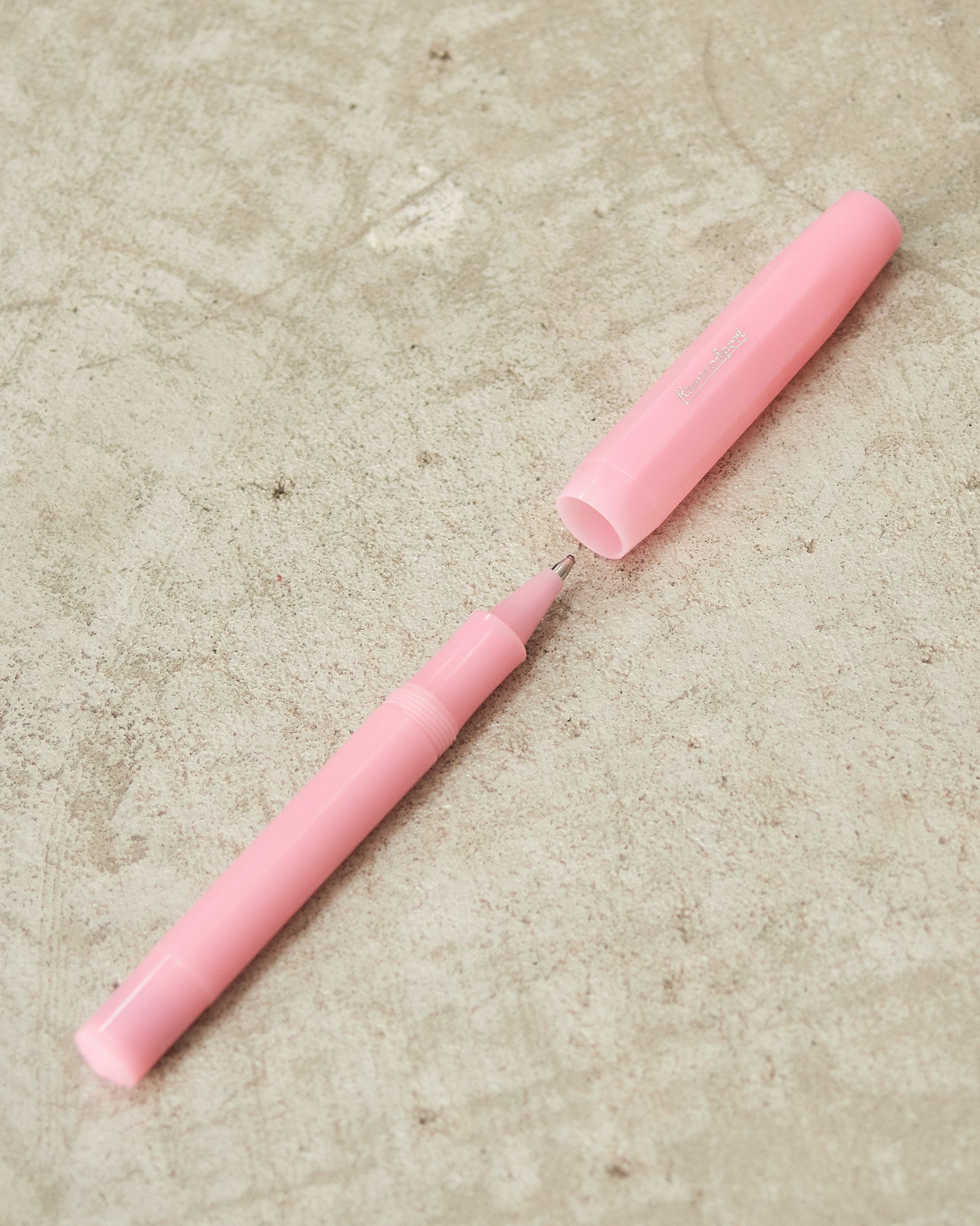 Kaweco Sport rollerball pen in blush. Pocket-sized design originating in 1911, crafted from durable plastic with a light pink finish. Features a smooth ceramic rollerball tip with continuous ink flow, ensuring an exceptionally soft writing experience. Measures 10.5 cm closed and extends to 13 cm with the cap attached. Compatible with the Kaweco slide-on clip in silver for added functionality.