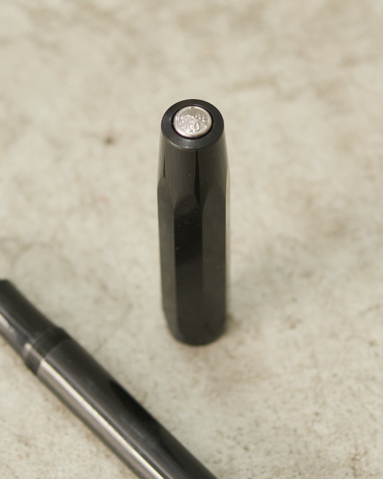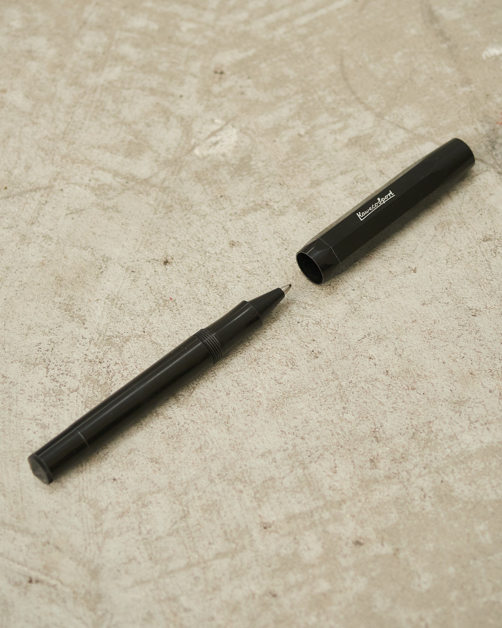 Kaweco Sport rollerball pen in black. Pocket-sized design originating in 1911, crafted from durable plastic with a high shine finish. Features a smooth ceramic rollerball tip with continuous ink flow, ensuring an exceptionally soft writing experience. Measures 10.5 cm closed and extends to 13 cm with the cap attached. Compatible with the Kaweco slide-on clip in silver for added functionality.