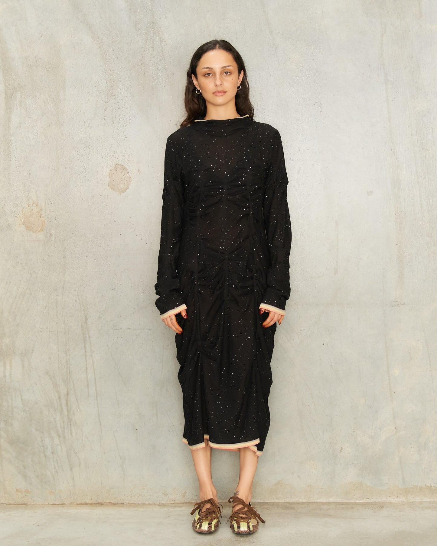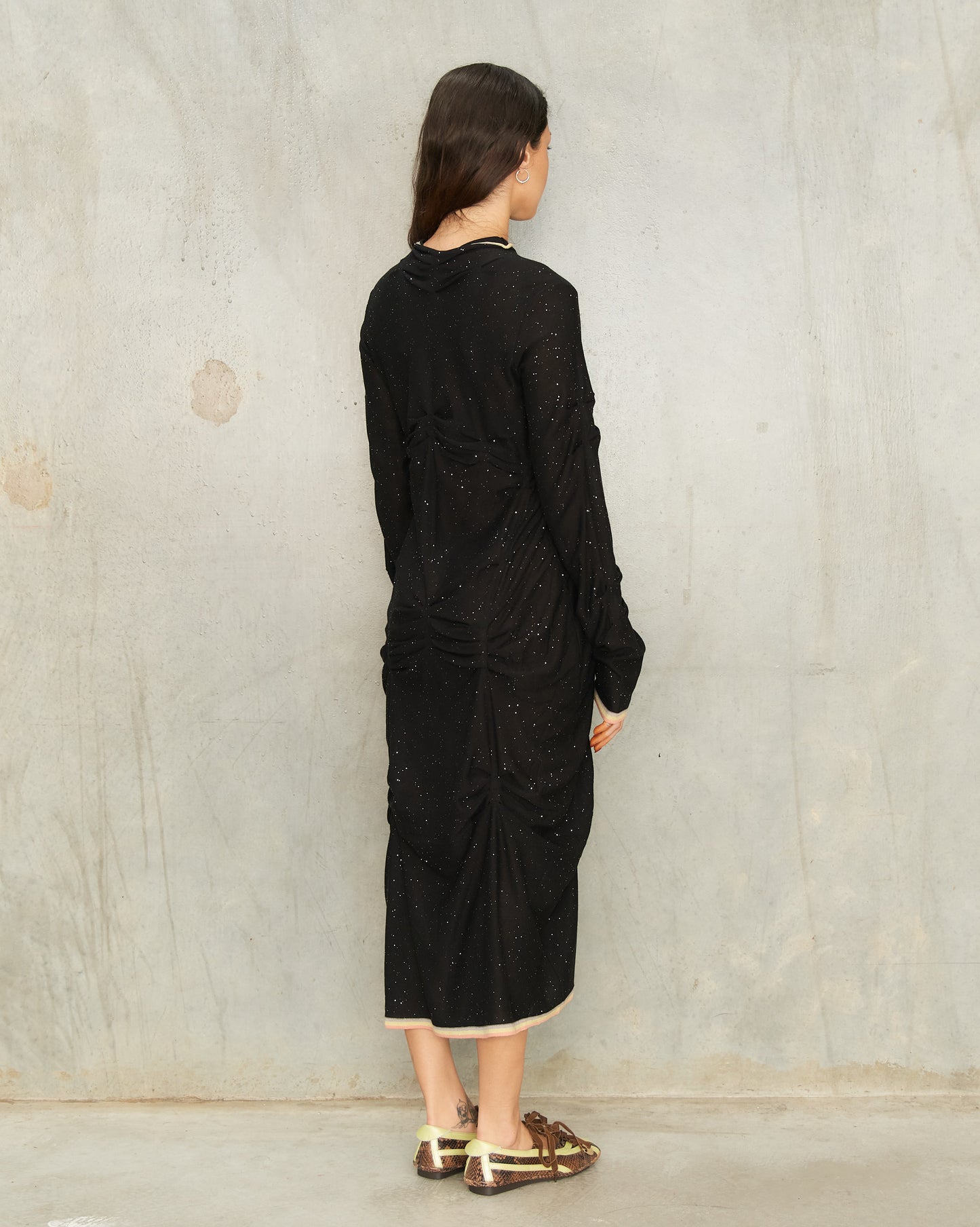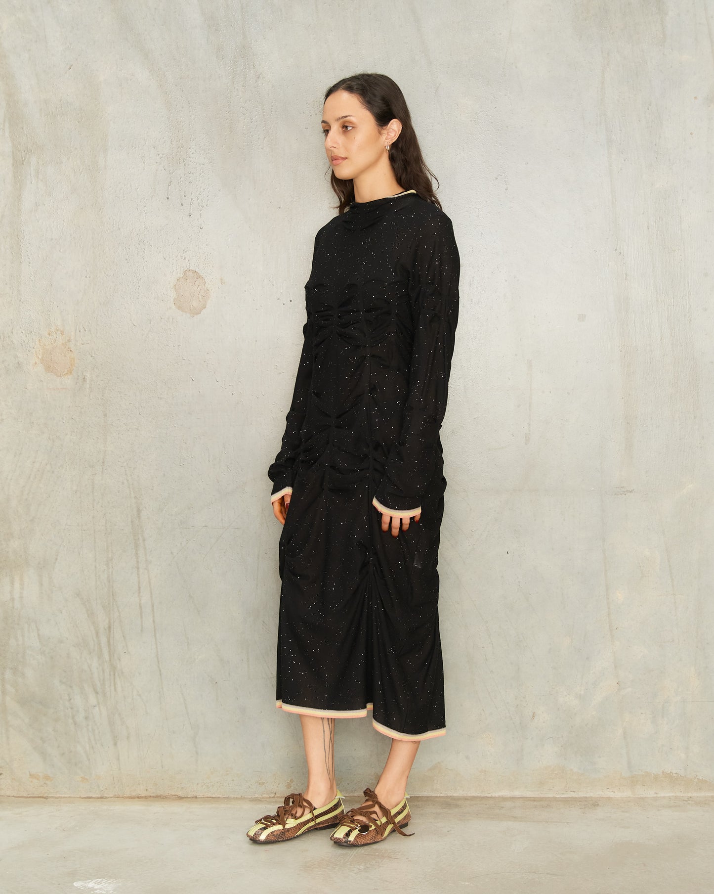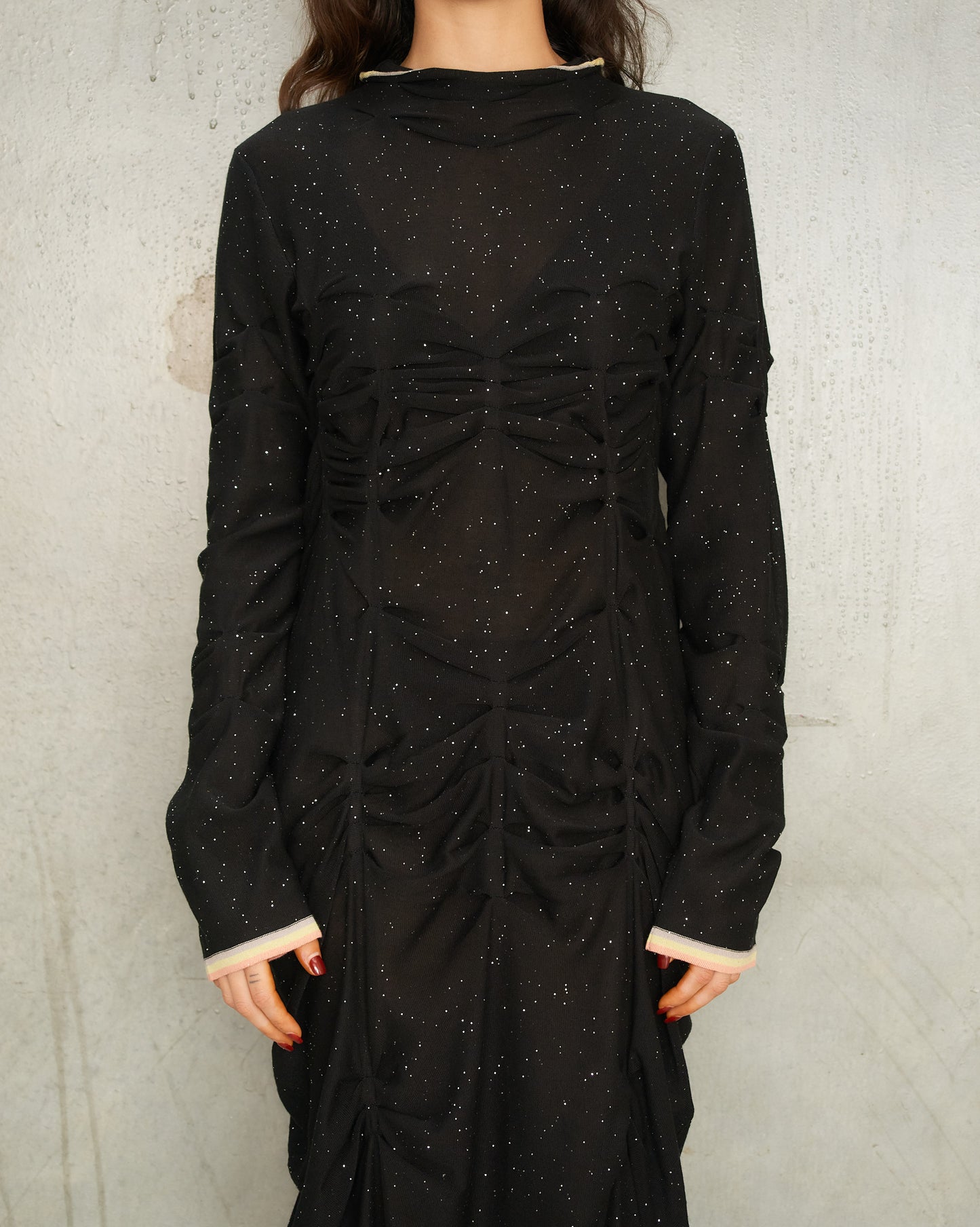 The Zabriskie dress by Kiko Kostadinov in black. Long-sleeve, calf-length knit crafted from a soft-touch fabric. It features inverted box pleats throughout, creating a structured yet fluid silhouette. Pastel-striped trim accents the neckline, cuffs, and hem, while delicate fine sequins add a subtle shimmer.