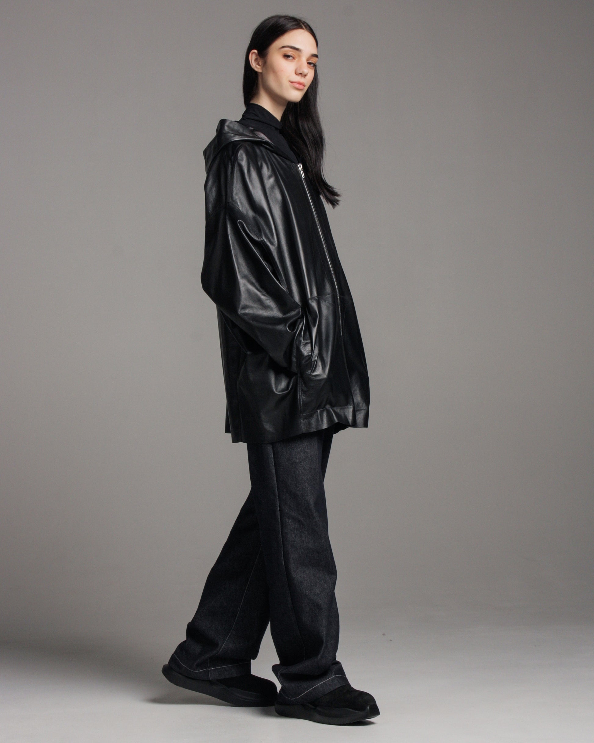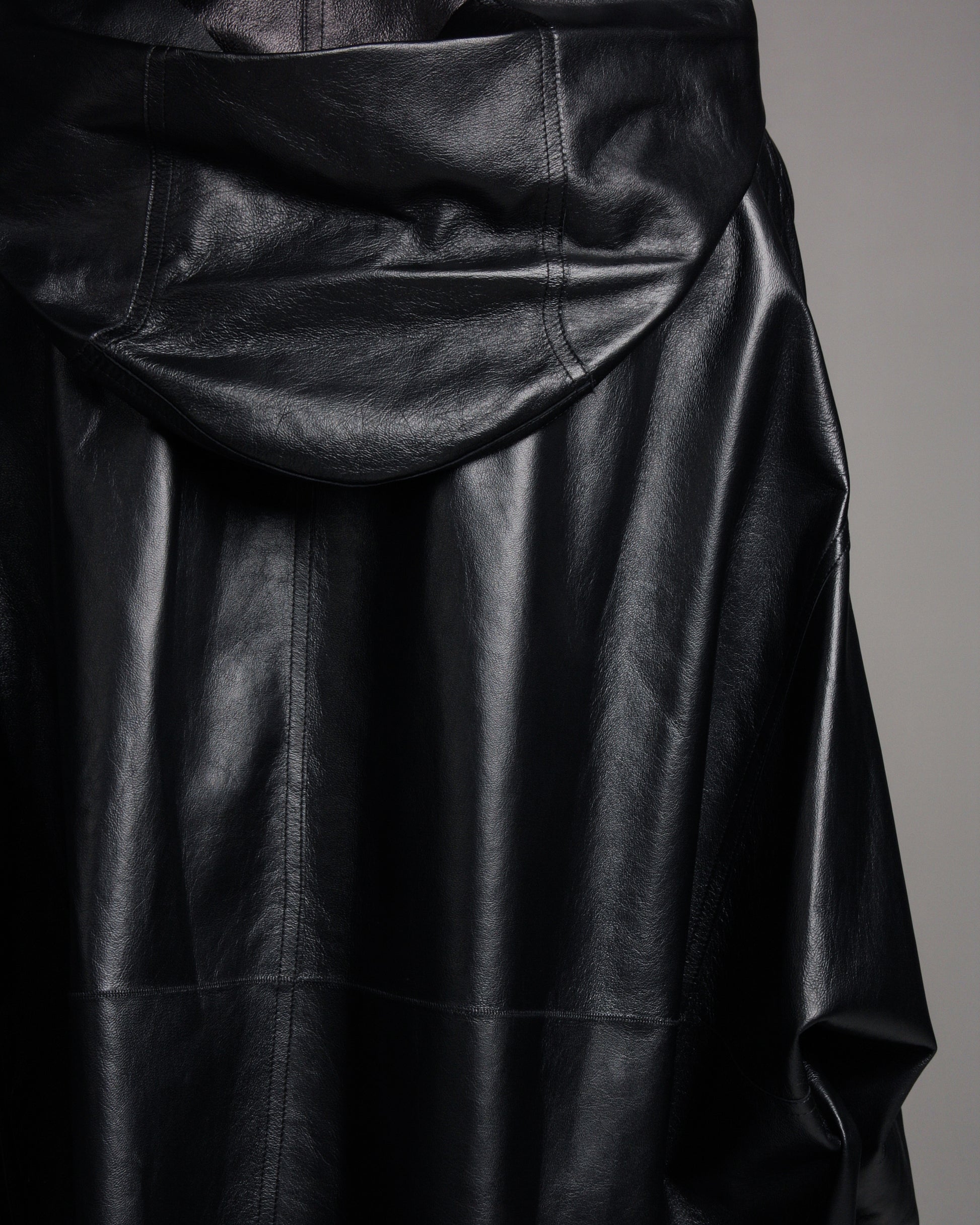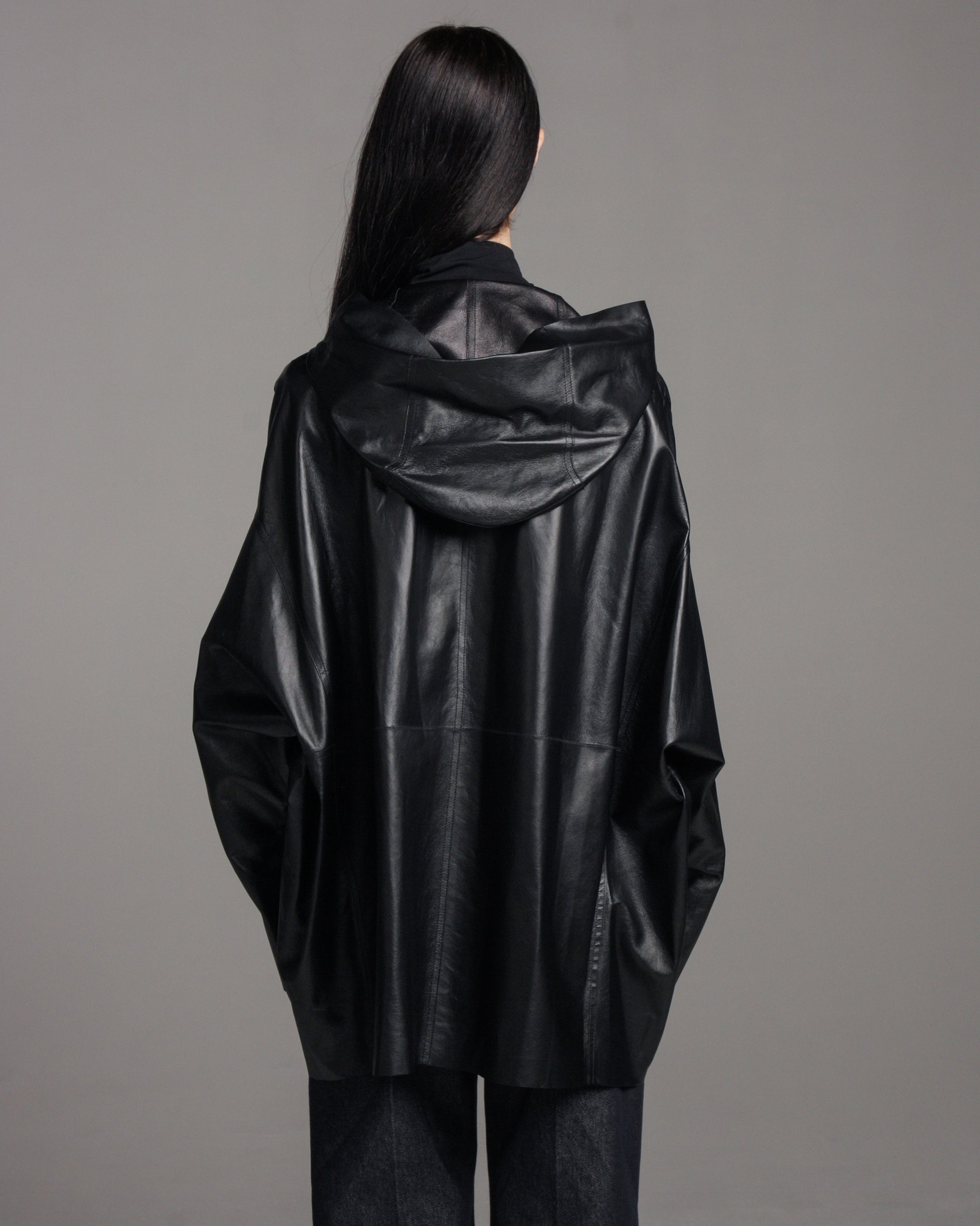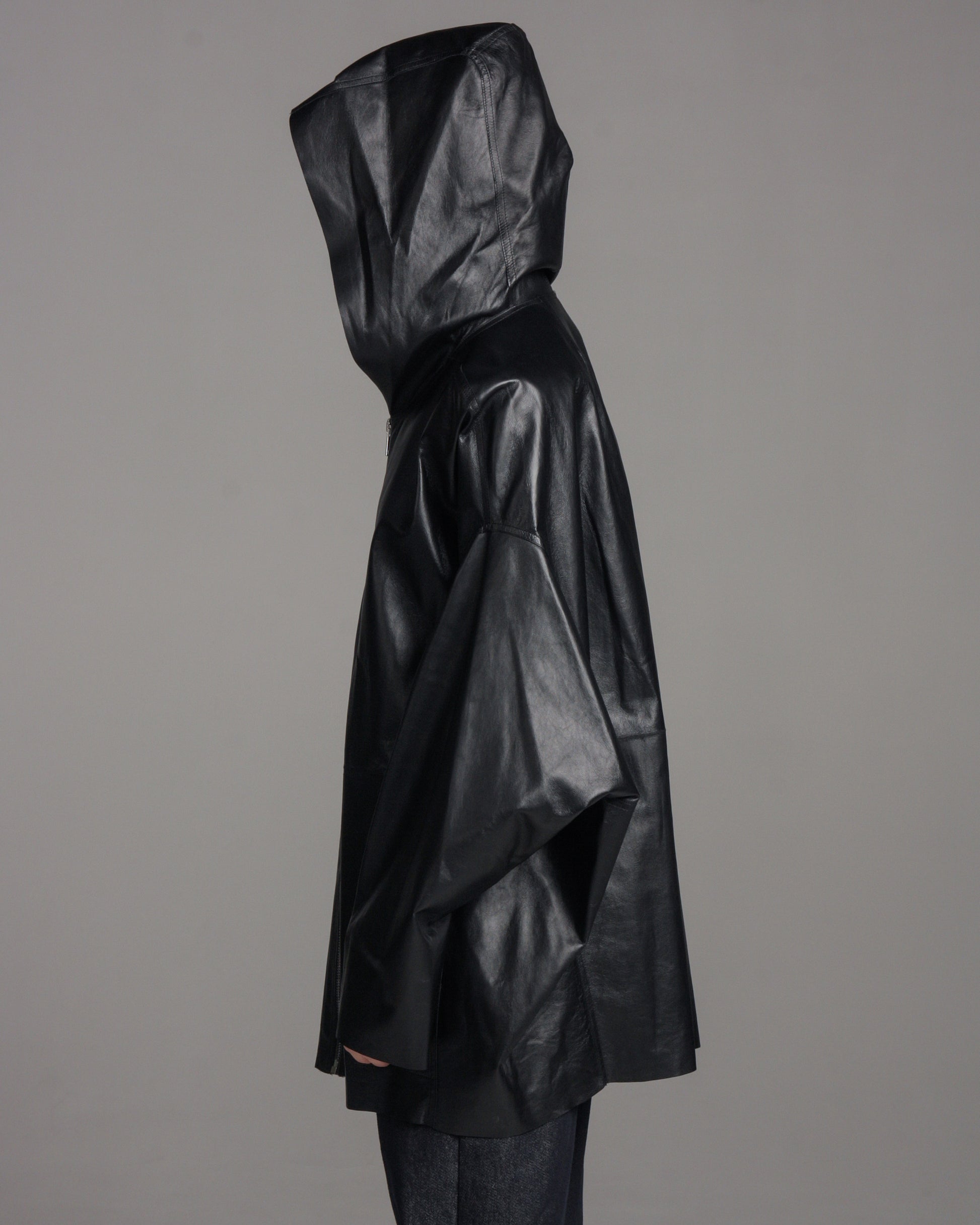 Leather Peter jacket by Rick Owens. Fine and supple grained lambskin crafted into an oversized hooded jacket. Dropped shoulders create batwing-like sleeves. Intricate cutting and seamwork throughout, with a fully zipped front and deep side pockets. A devilish mix of grunge and luxury.