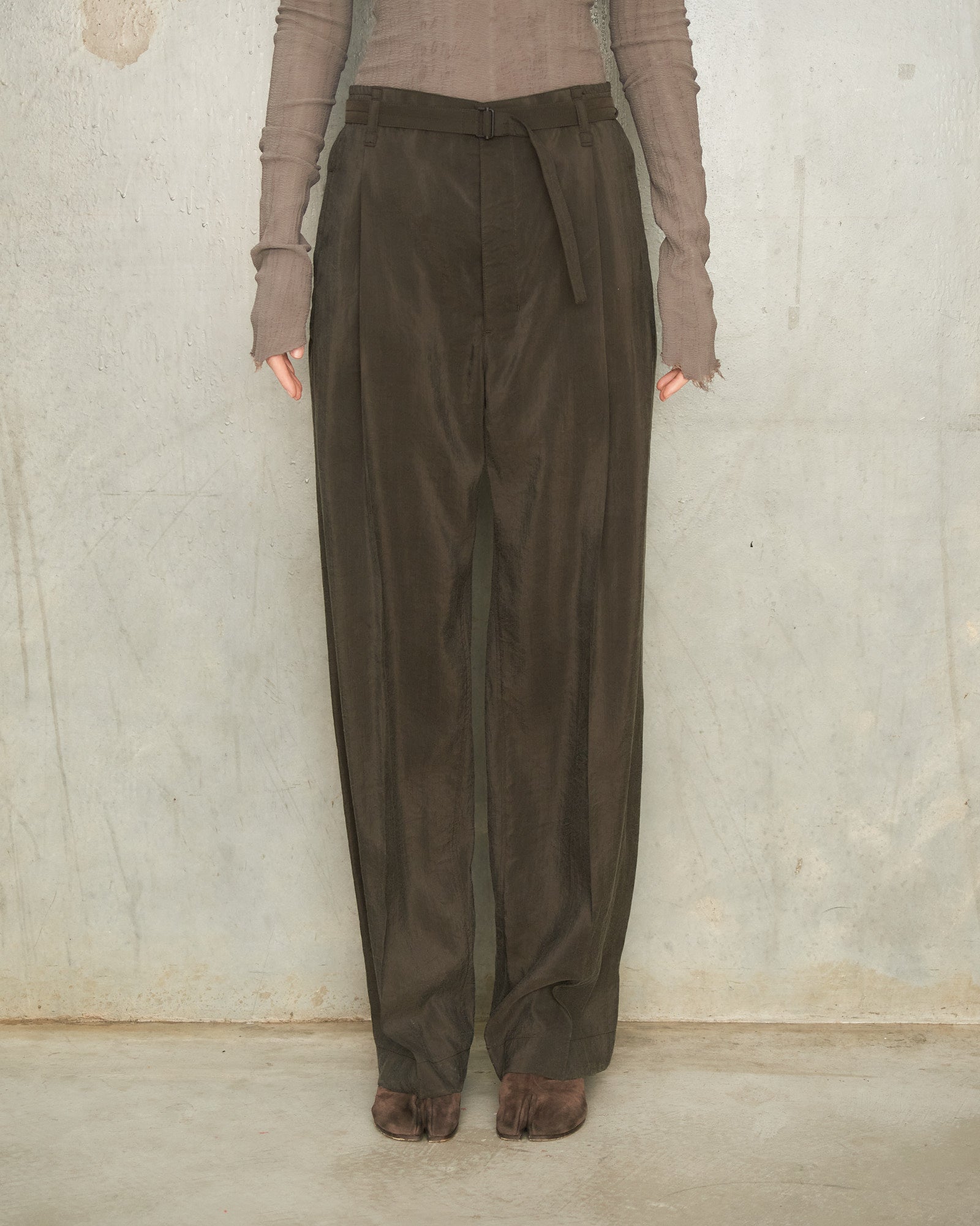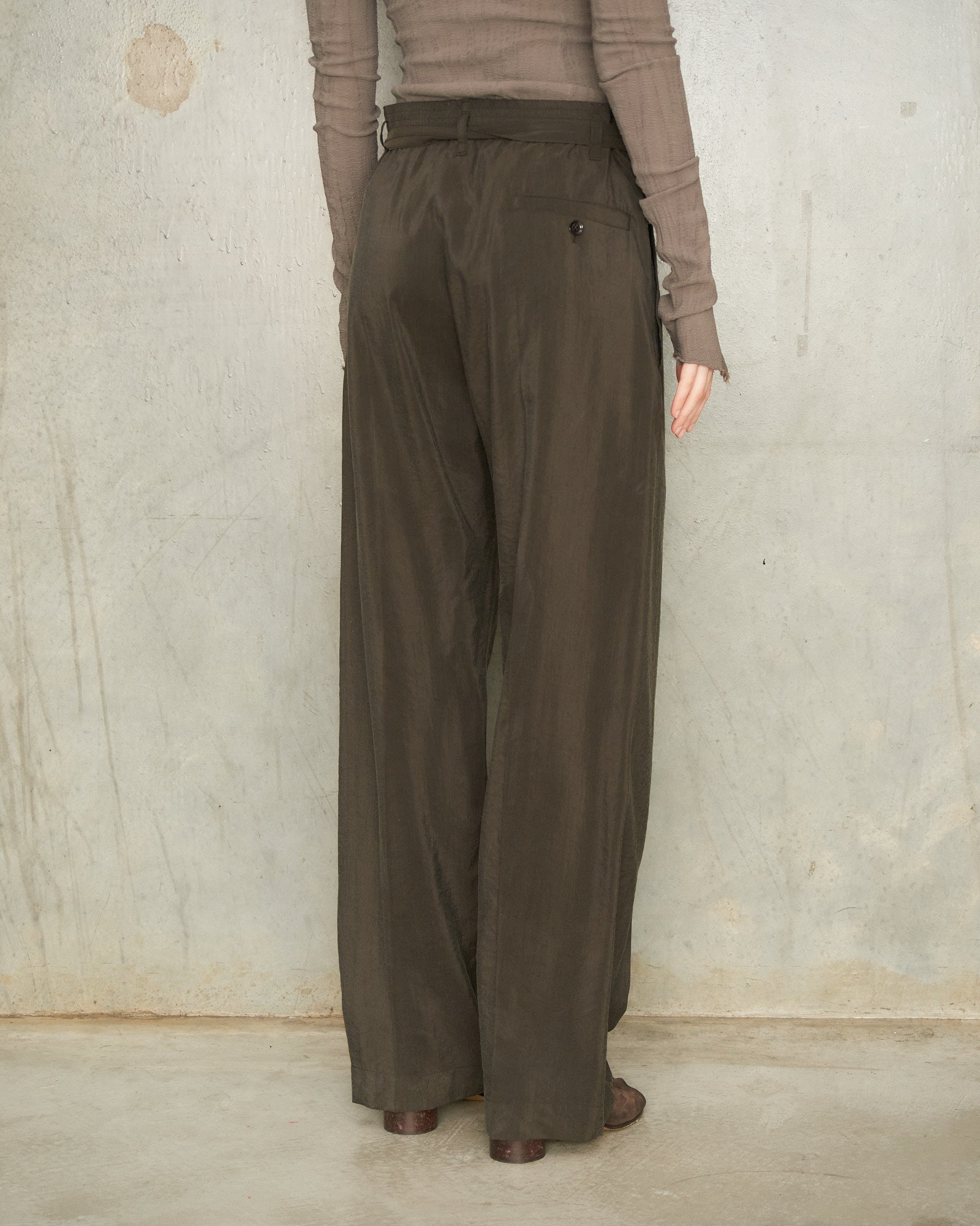 Belted pants by Lemaire in dark espresso. Crafted from dry silk with a textured feel and satin-like sheen, featuring a central pleats and a relaxed fit. Finished with a thin waist belt and single buttoned welt pocket at the back.