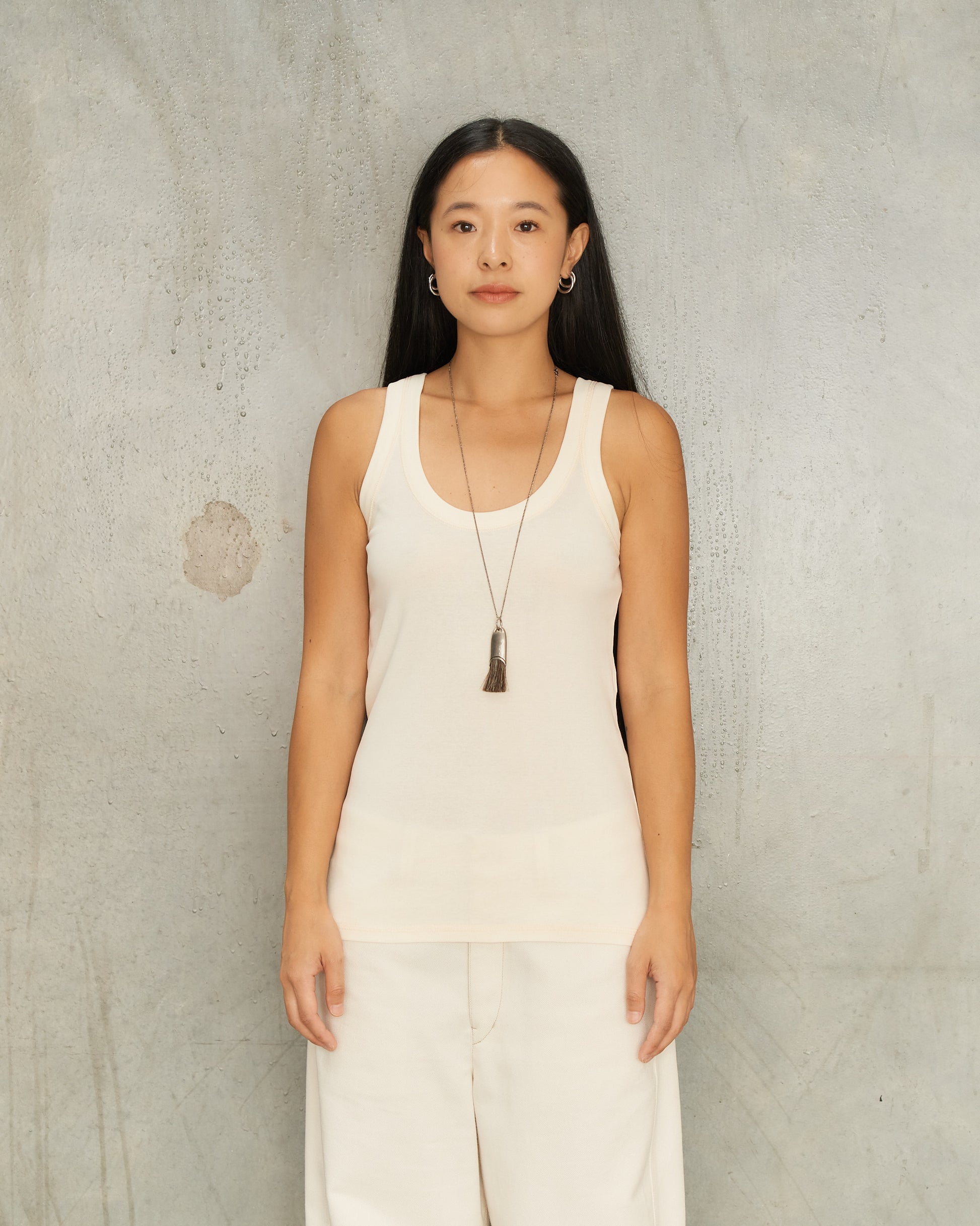 Rib tank by Lemaire in light cream. Staple tank crafted from a mid-weight cotton jersey with flexible ribbed texture. The fitted silhouette features straps that narrow together on the back to reveal the shoulder blades.