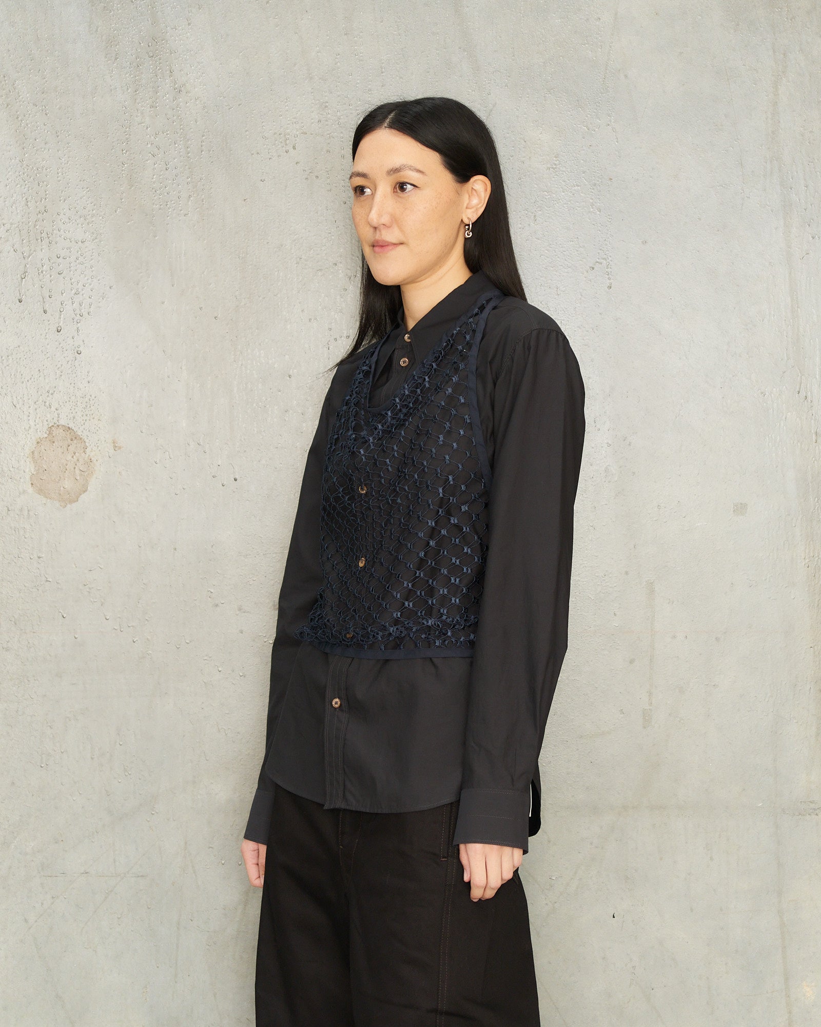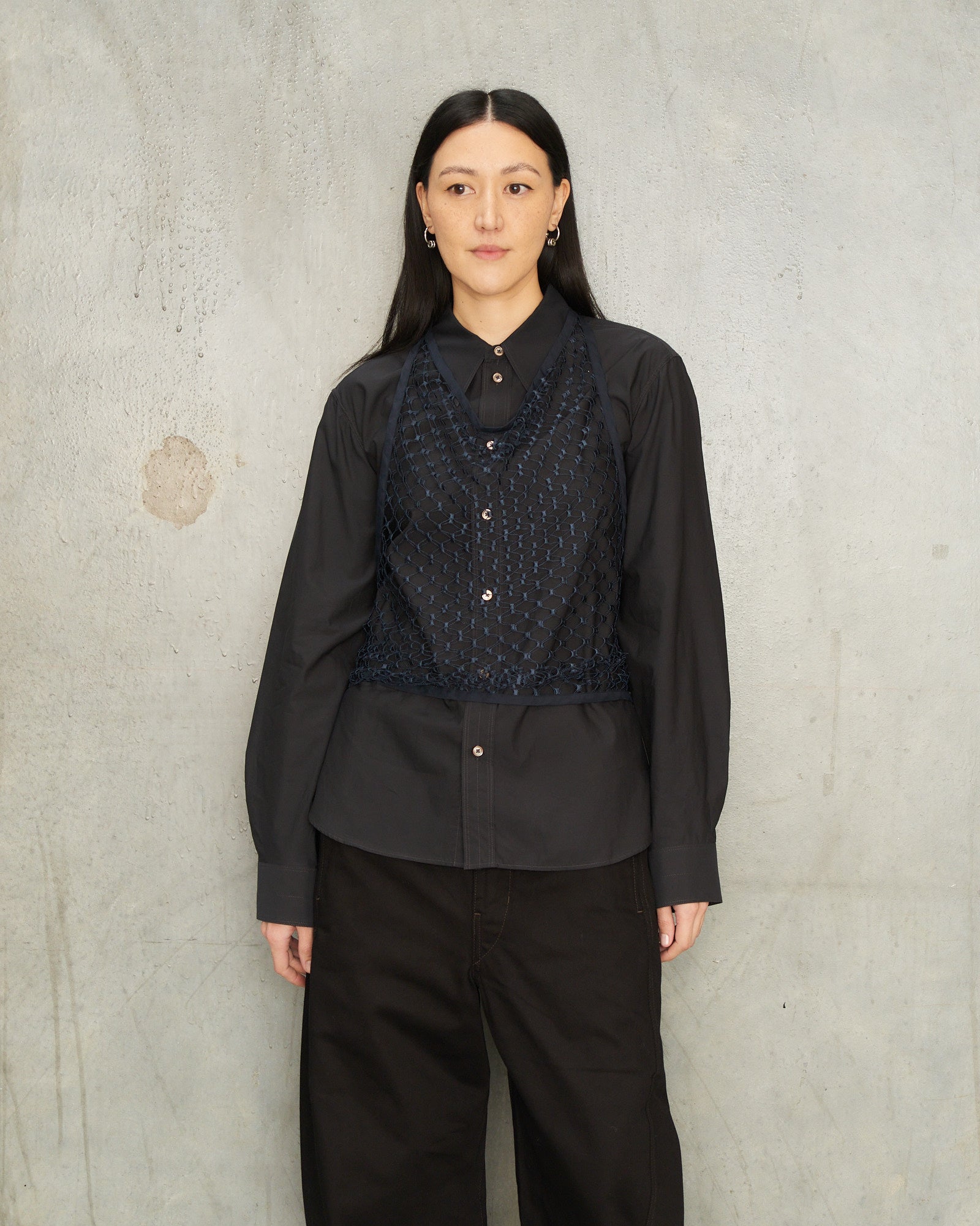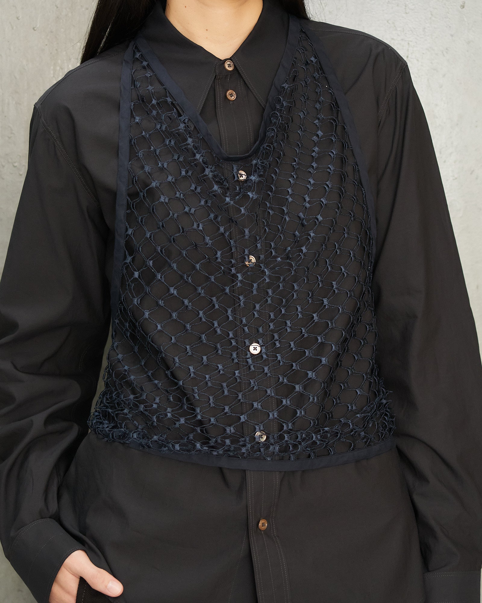 Fishnet halter top by Lemaire in storm blue. Halter-style vest inspired by Lemaire’s signature fishnet accessories, crafted as a sculptural accent to elevate and transform any silhouette.