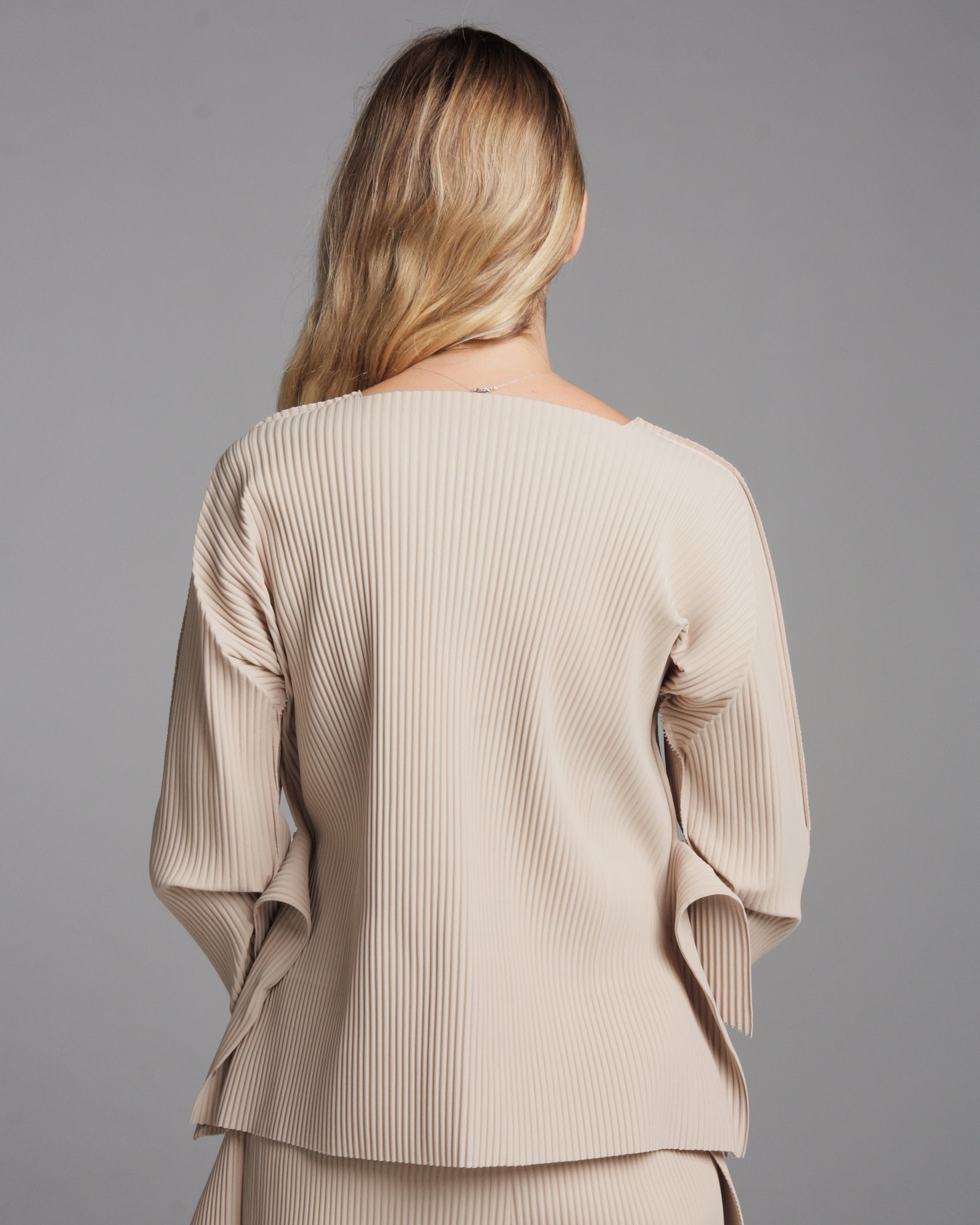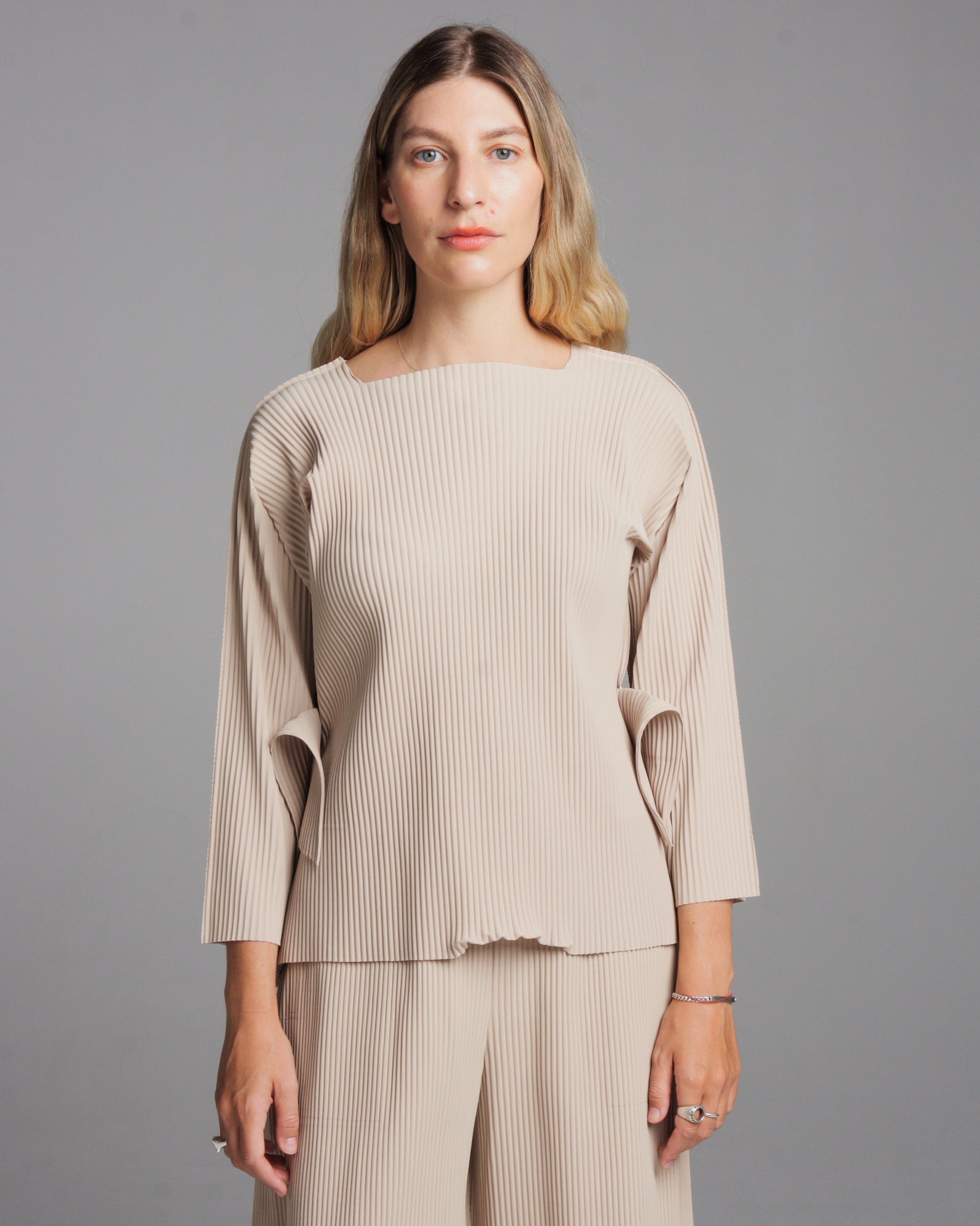 Step pleats top by Issey Miyake ME in light beige. Square neckline top in regular soft ribbed pleating. A relaxed silhouette flounced with extraneous side panels cut to peel away from the waist ornamentally.