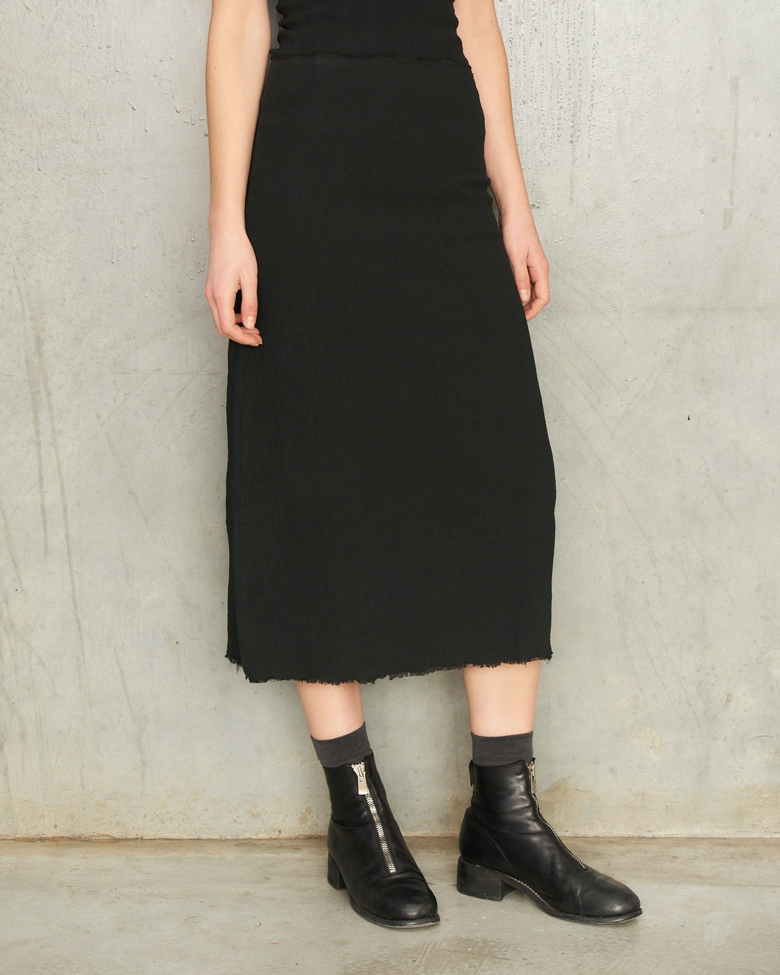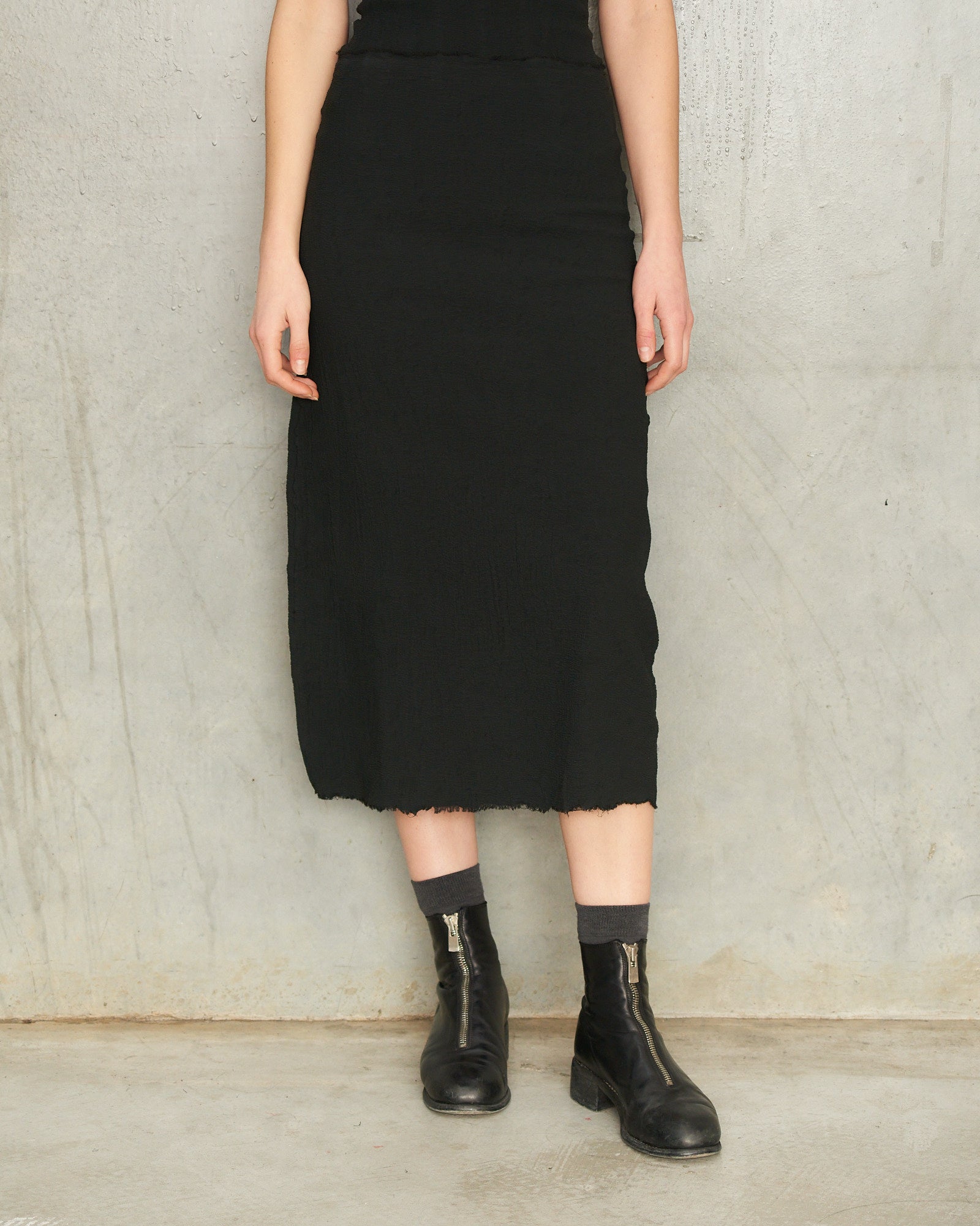 Stretch skirt by Marc Le Bihan in noir. Sculpted pencil skirt in crinkled silk crepe de chine, its natural stretch embracing the body with ease. Finished with a raw, irregular hem that reveals the artisan’s hand in every detail.