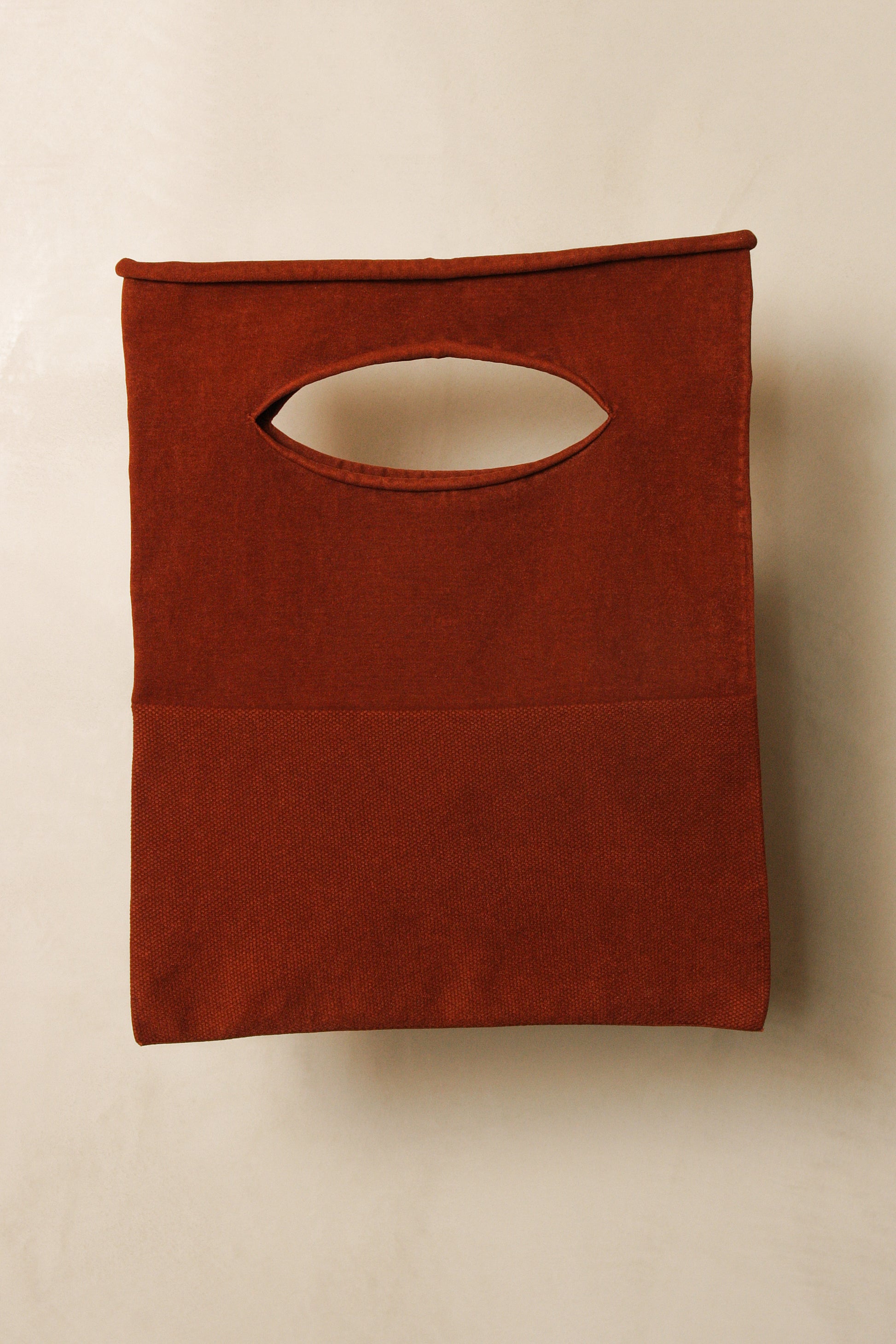 Konbu mini tote bag by Issey Miyake ME in rust. Square shape with a softened carry hole, the bag is constructed with a lightweight yet sturdy feel to contain the perfect amount of possessions for daily use.