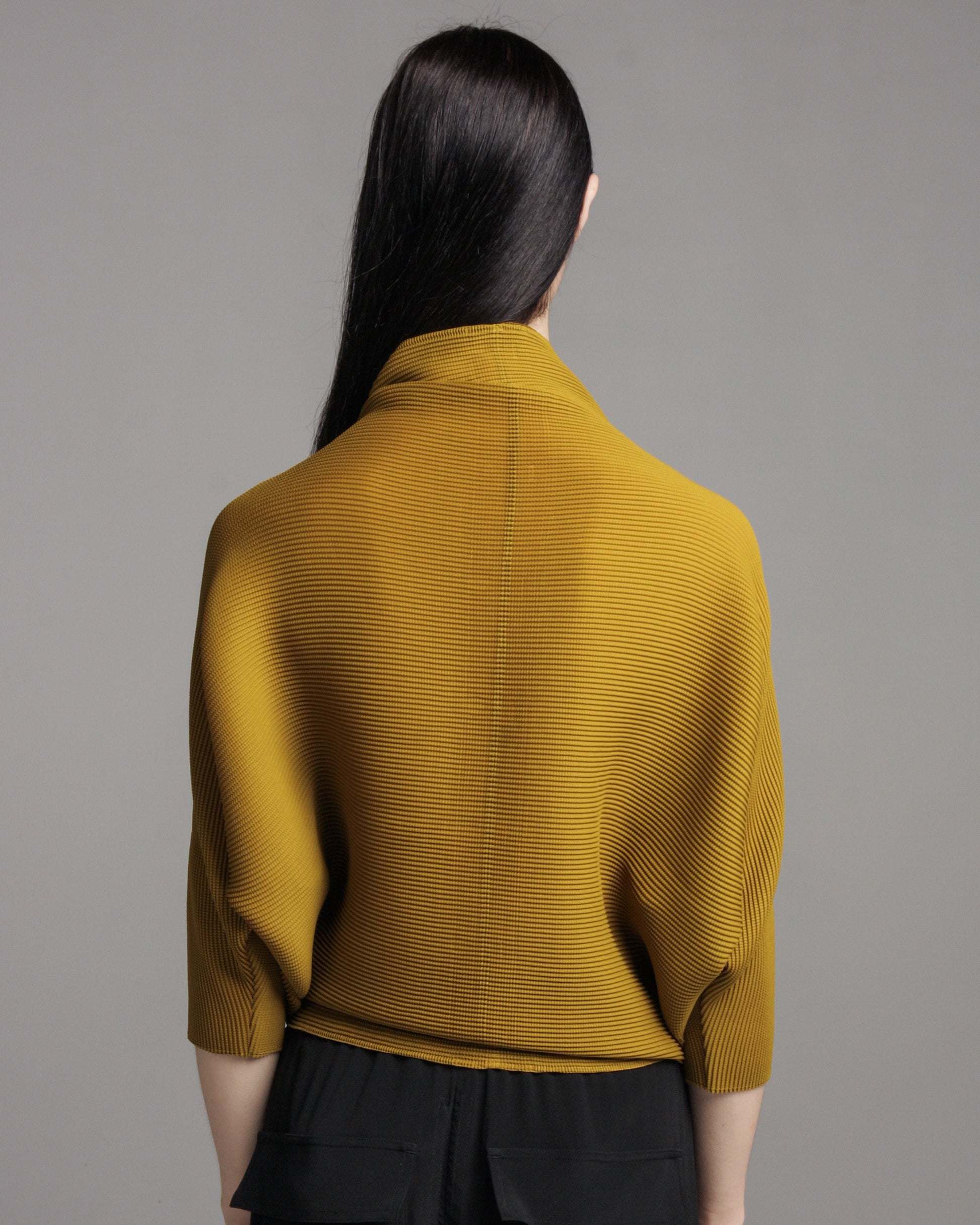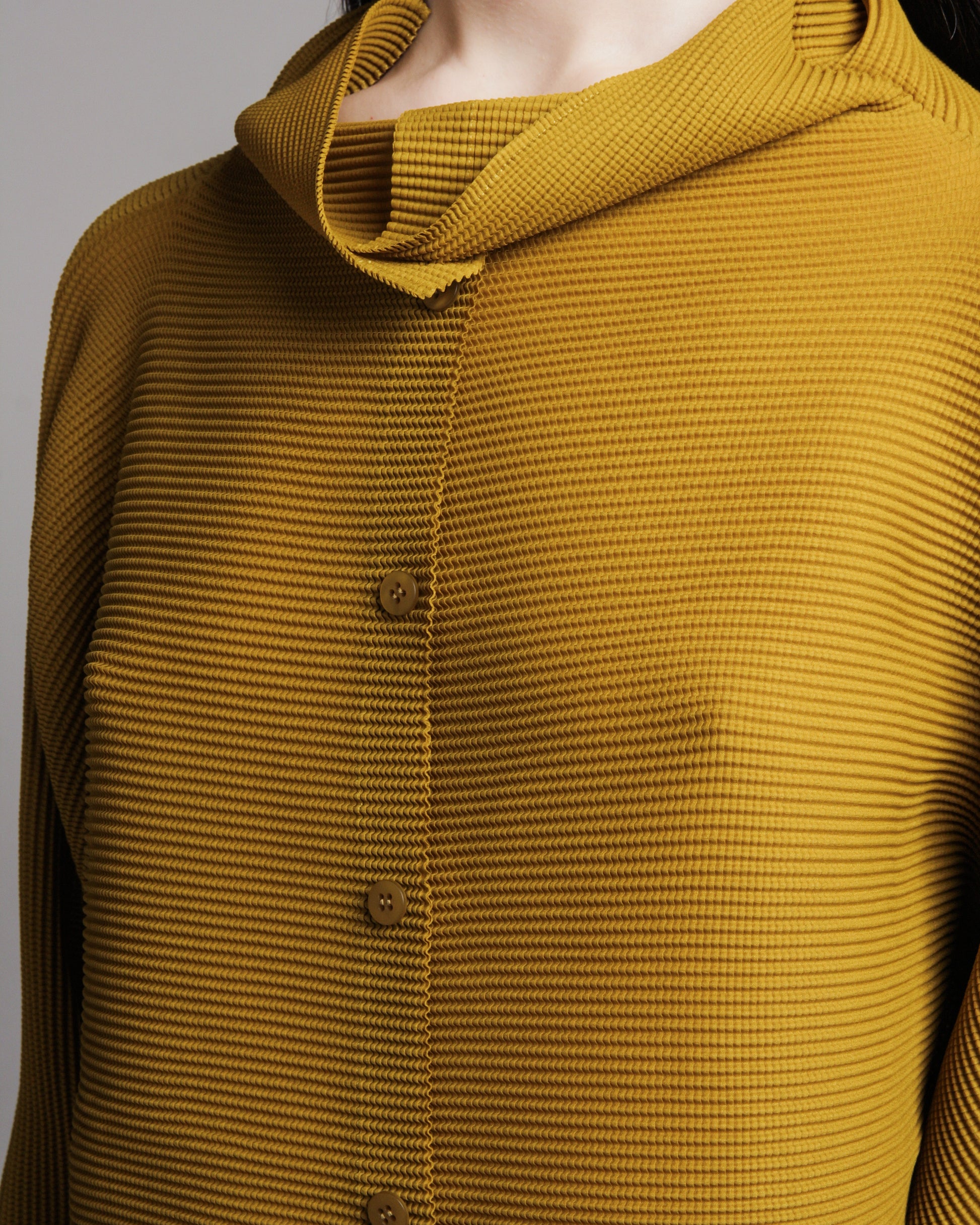 Dolman stretch cardigan by Issey Miyake ME in mustard. Relaxed micropleated fabric with stretch in all directions. Draped high neck and batwing sleeves offer a cosy, slouched feeling. Distinct shade of mustard with olive undertones.