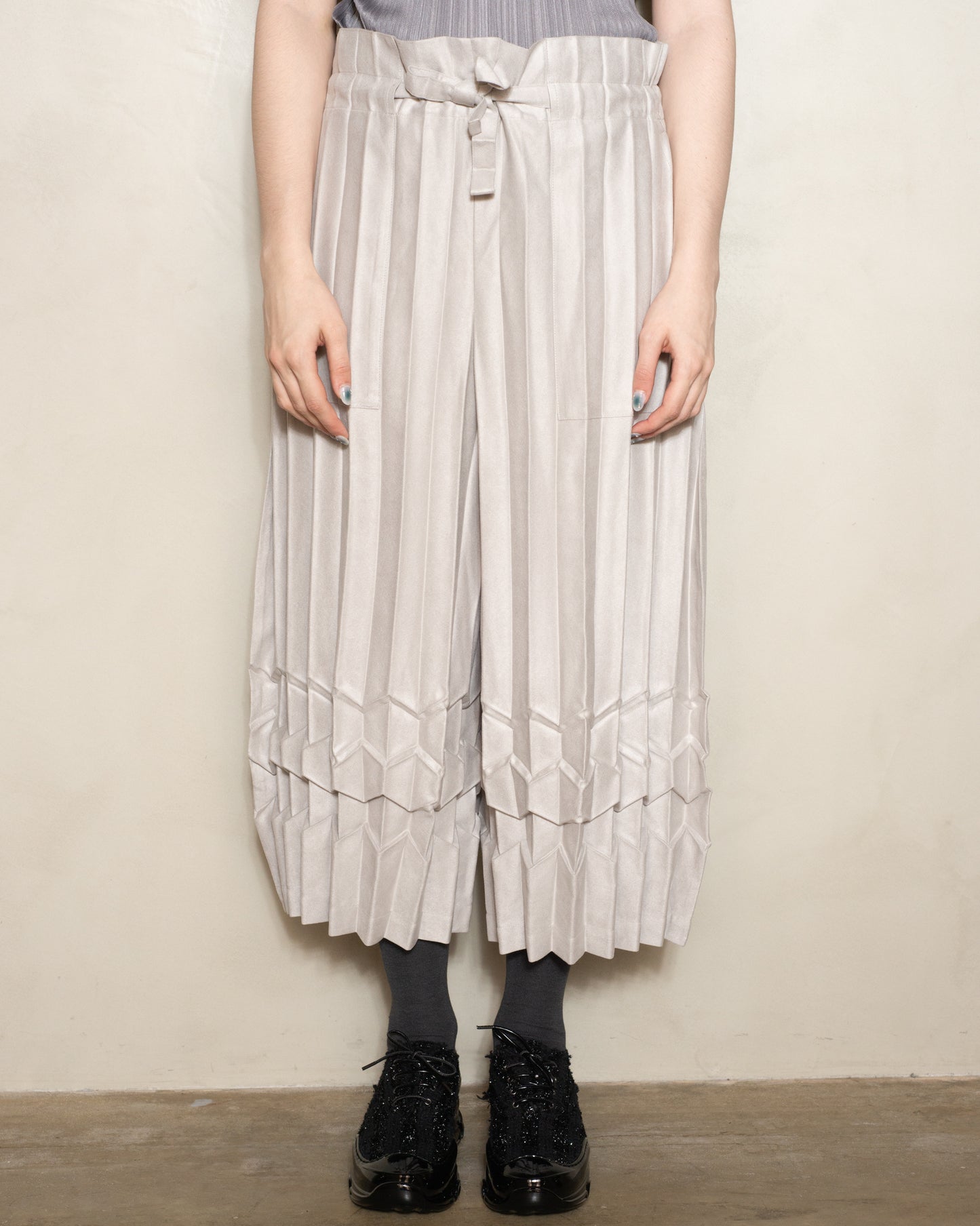 Cube pleat trousers by Issey Miyake ME in light grey. Wide fitting cropped pants in a distinctly raised suede-like material. Characteristic accordion pleated shape with geometric patterning at the hem enabling compact folding along its pleats. Adjustable cord waist tie and pockets on both sides.