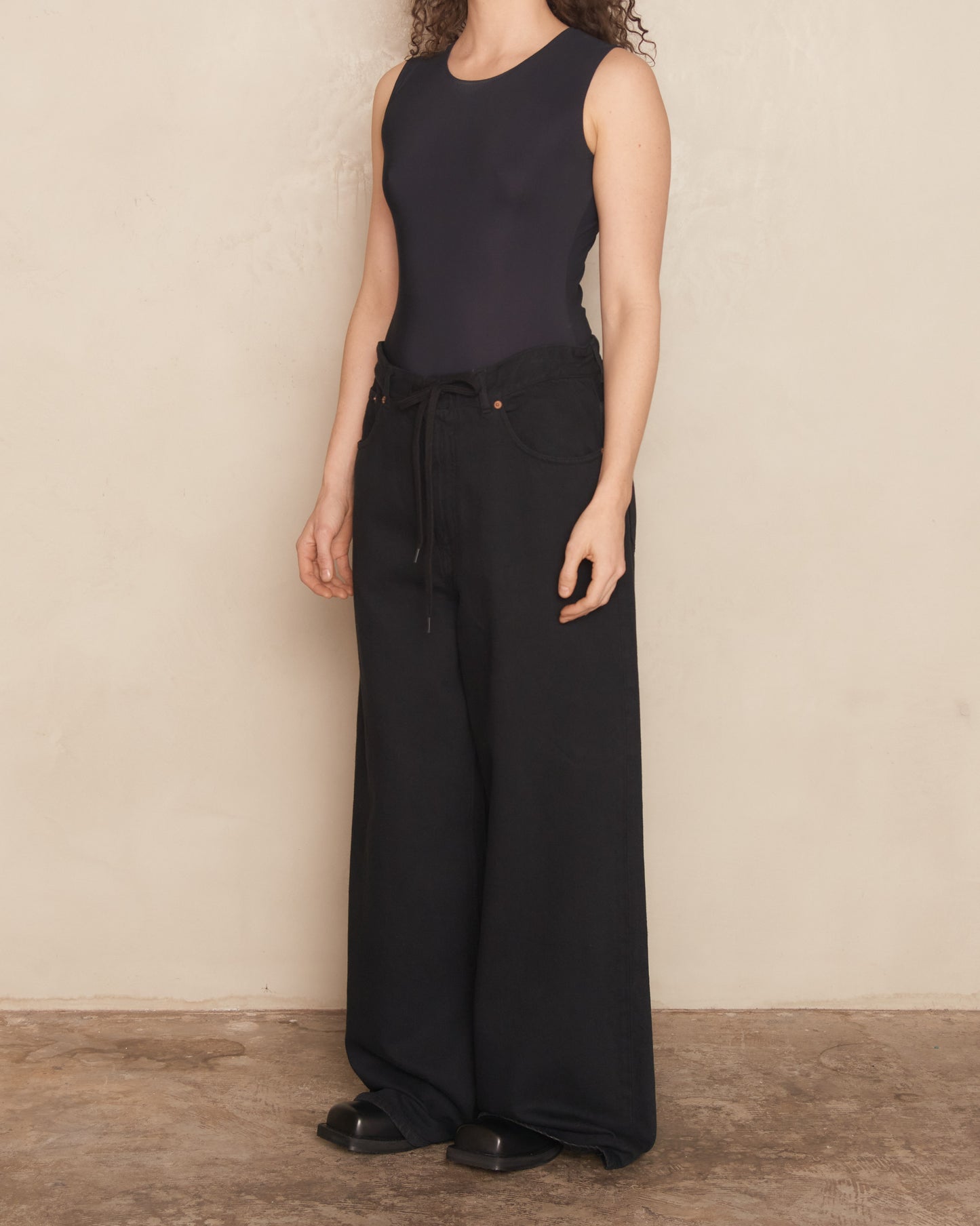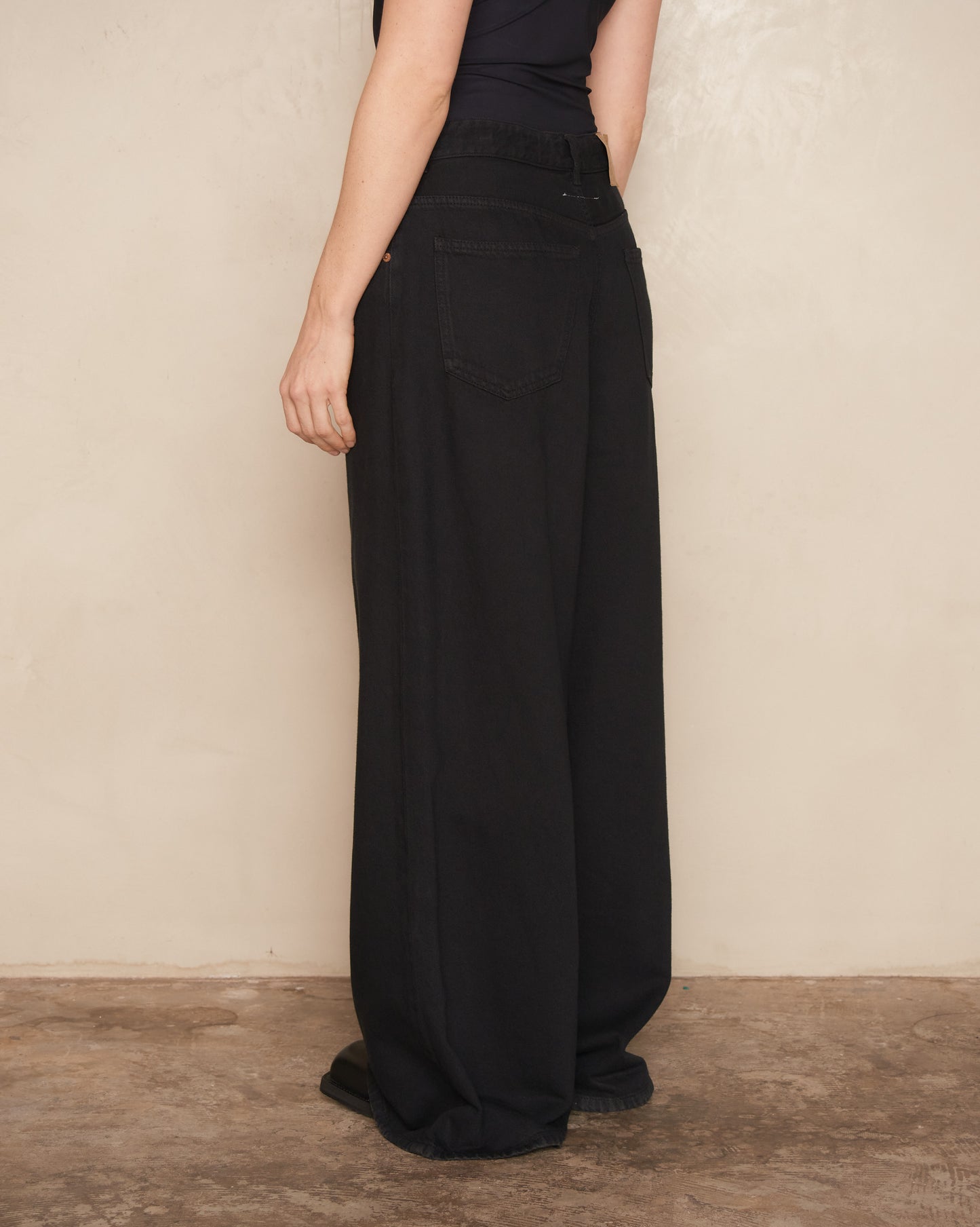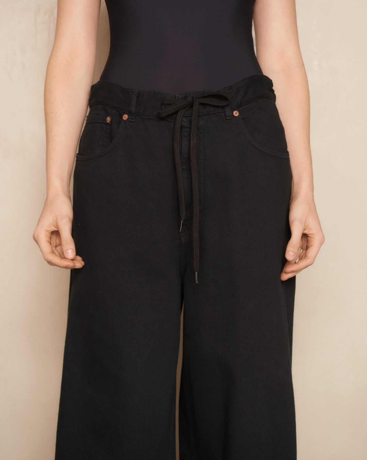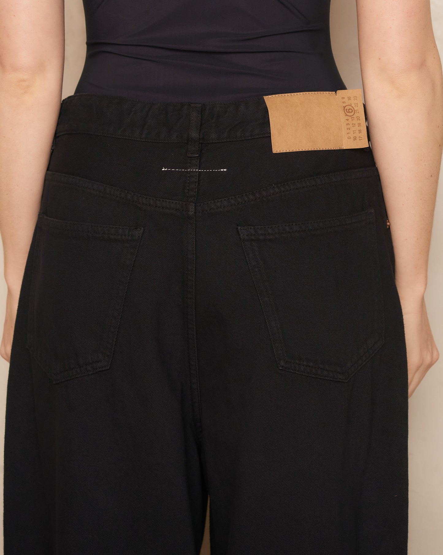 Wide leg jeans by MM6 Maison Margiela in black. Mid rise, full-length jeans with an inbuilt shoelace belt for easy waist adjustments.
