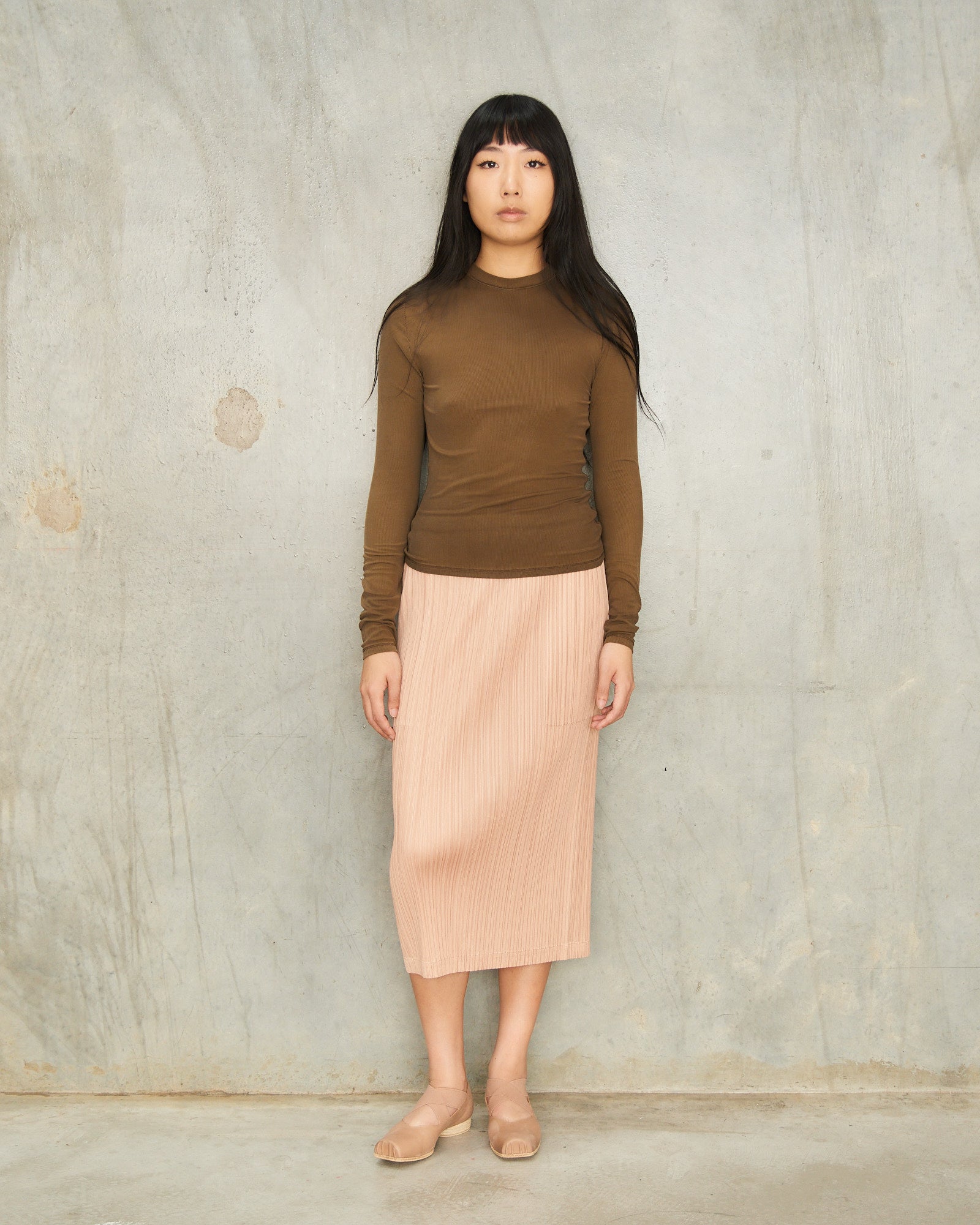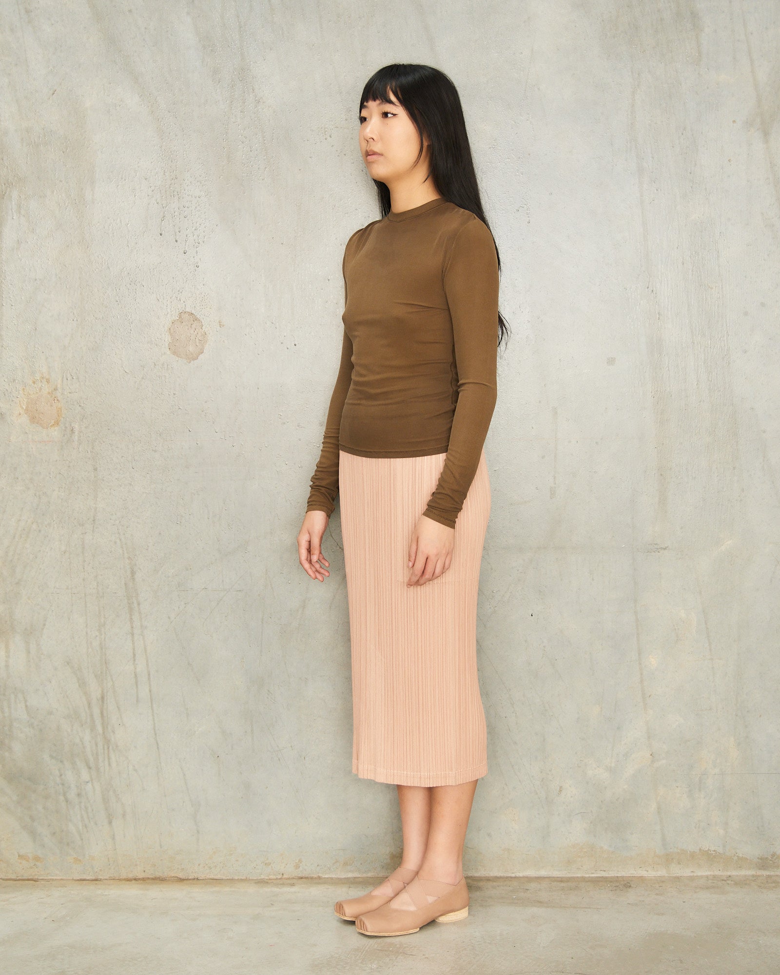 Classic skirt by Pleats Please Issey Miyake in beige. Signature mid-length skirt expressed in dynamic vertical pleats. Features an elastic waistband, two side pockets and rear central vent.