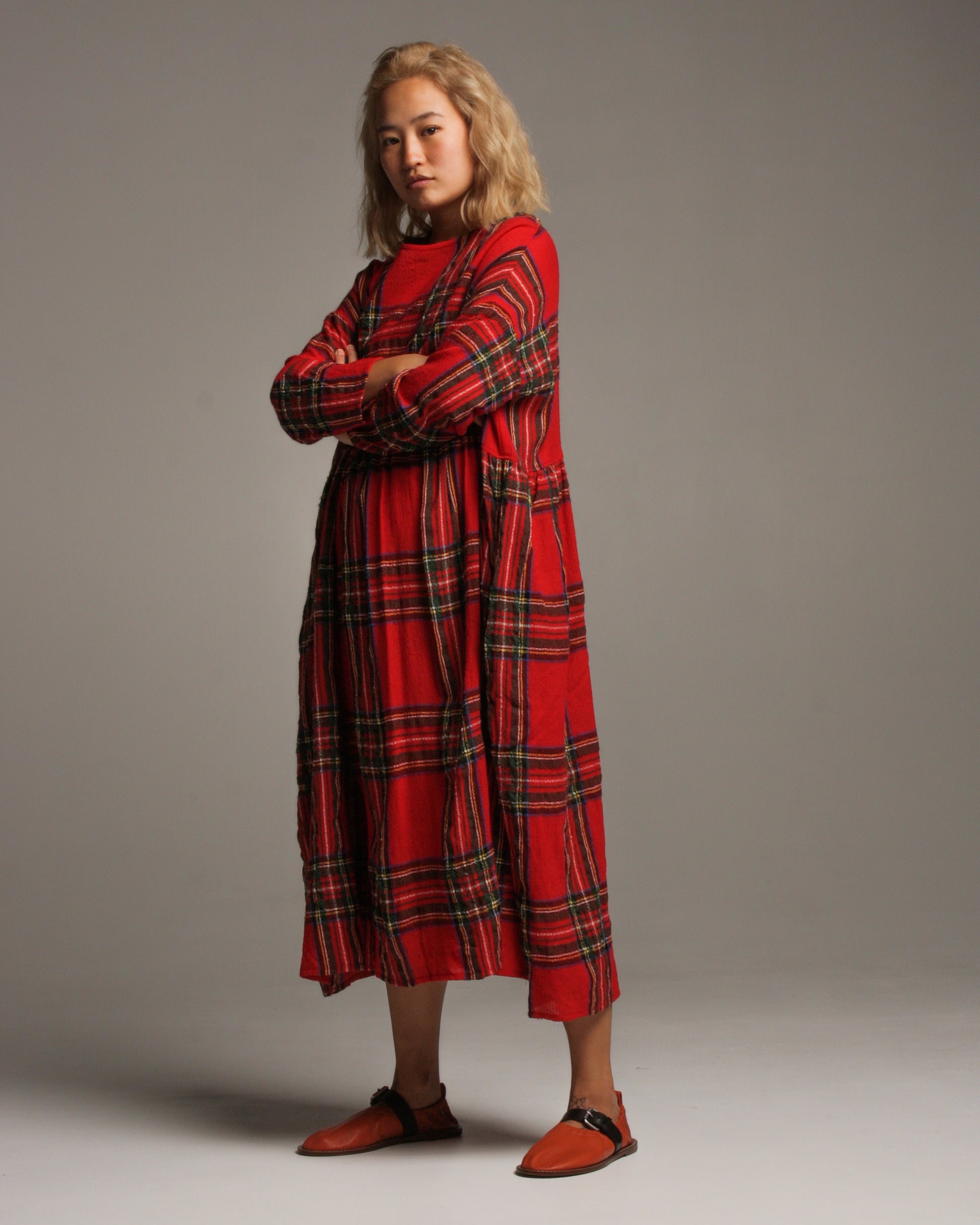 Tartan wool dress by Ichi Antiquités in red. Relaxed fitting dress in vivid red tartan patterning. Featuring a relaxed round neck and gathered detailing at a dropped waist. Weighty construction of wool and nylon provides an interesting point of texture within the tartan check. Voluminous and dignified with a provincial flair.