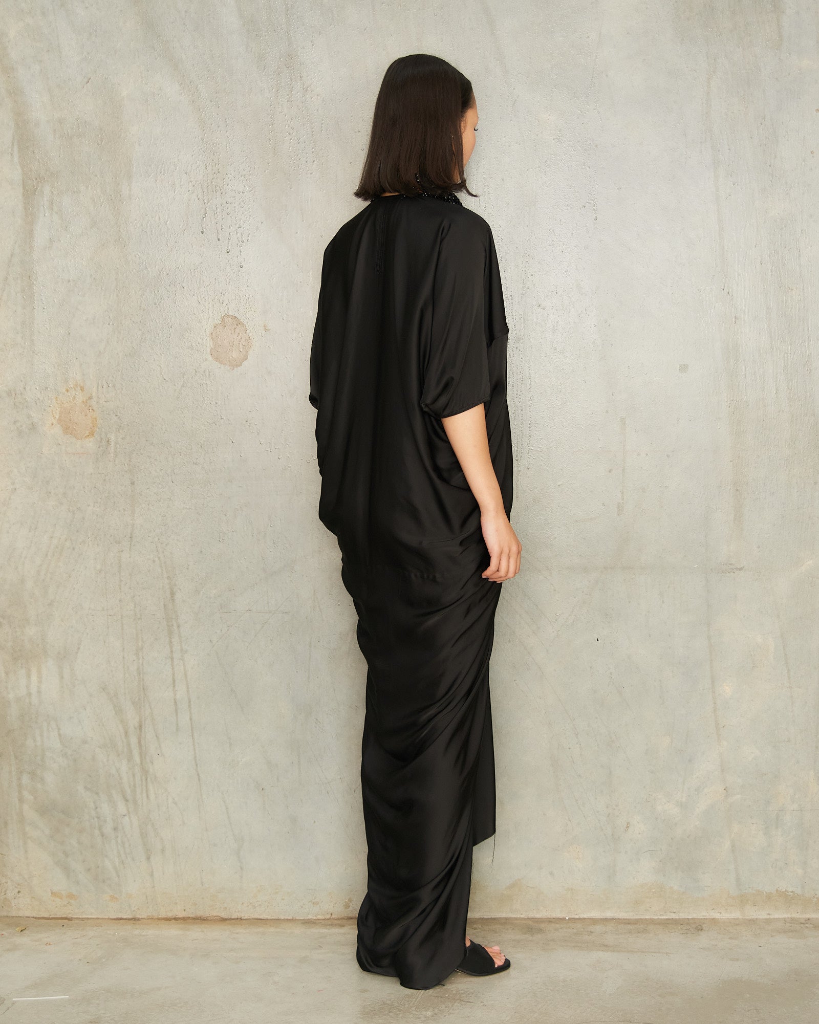 Kite gown by Rick Owens in black. Angelic kaftan-style gown in lustrous black. Luxuriously crafted in a viscose blend with flowing silhouette, featuring a V-neckline and draped long sleeves. Bias-cut panels converge at a single centre seam for an effortlessly fluid and ethereal effect.