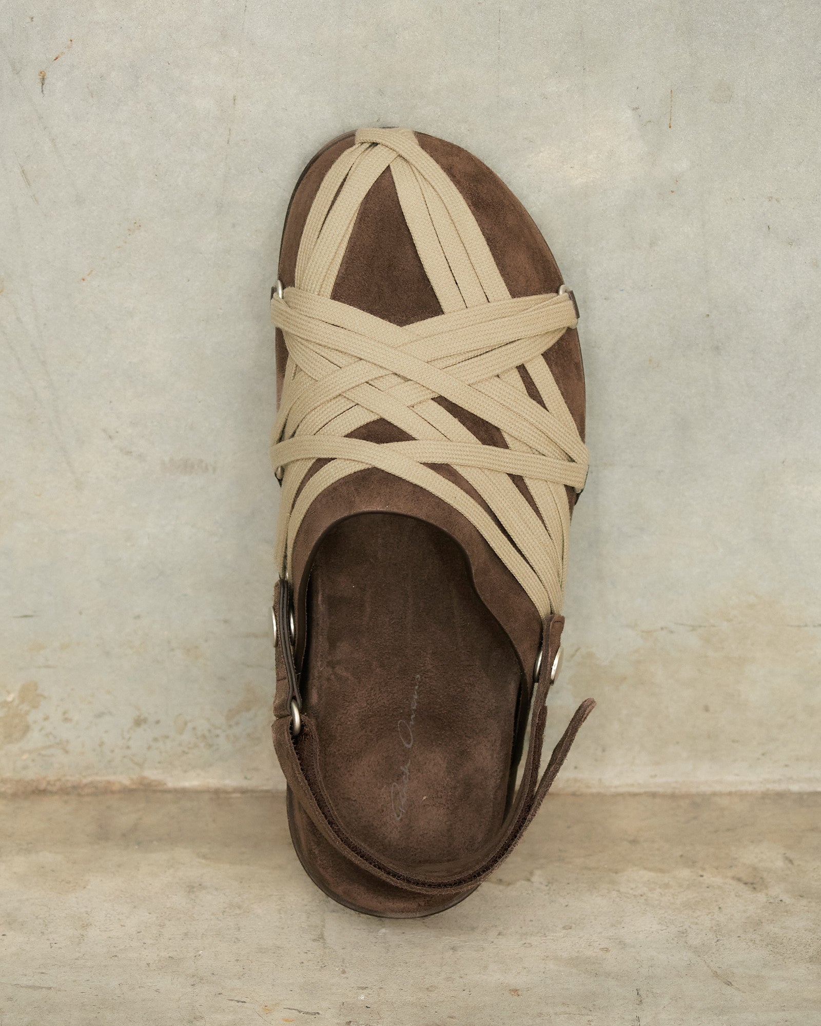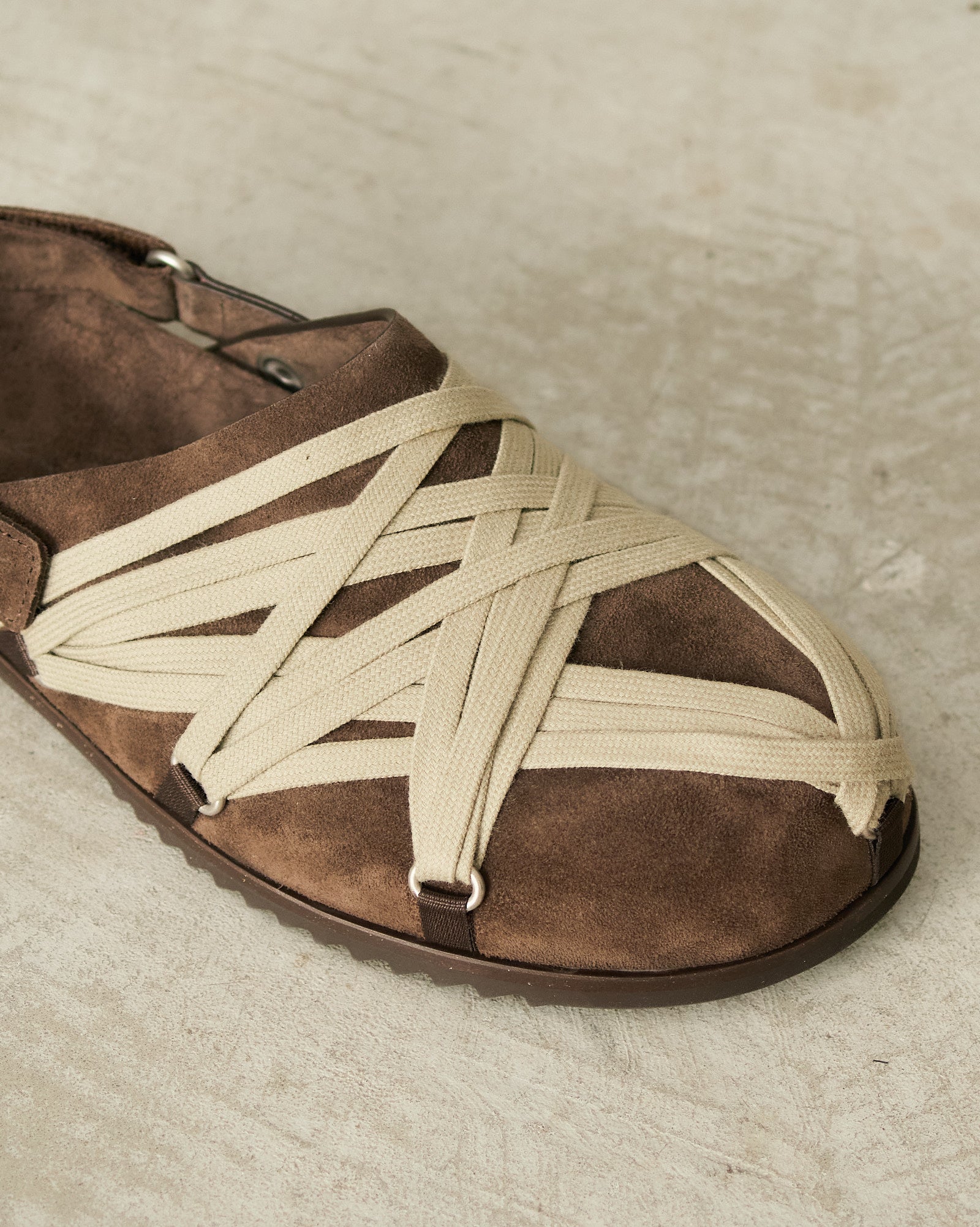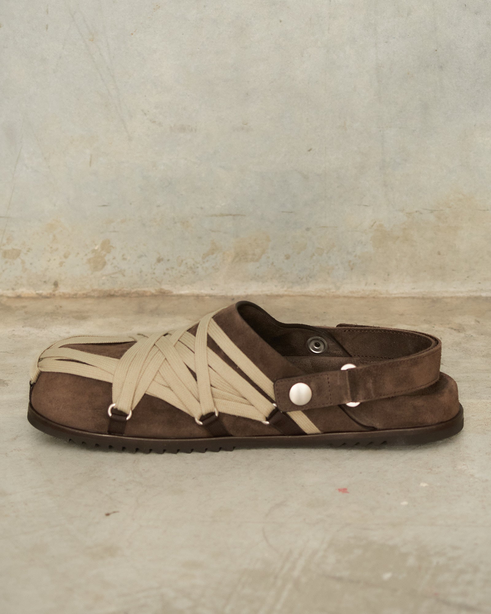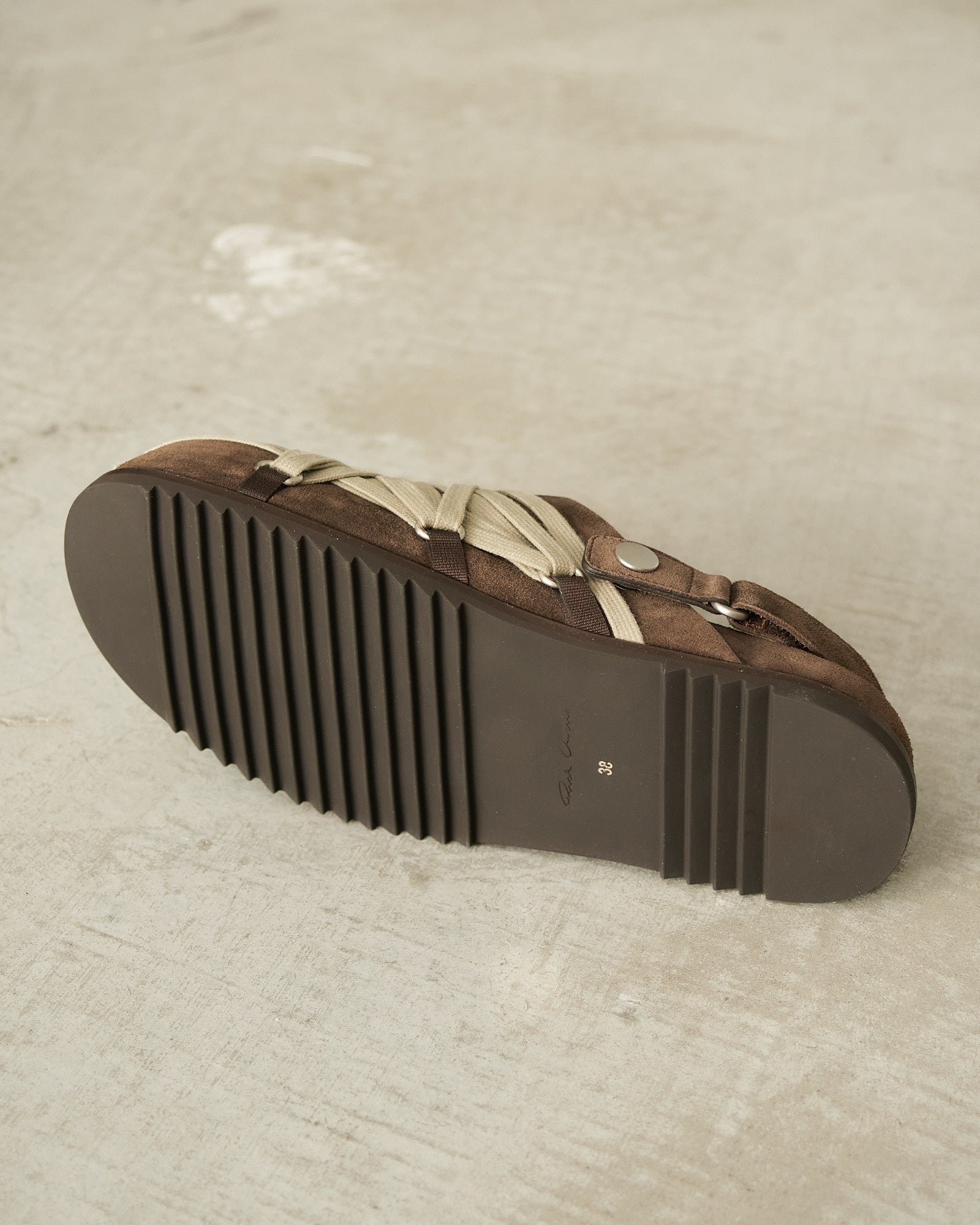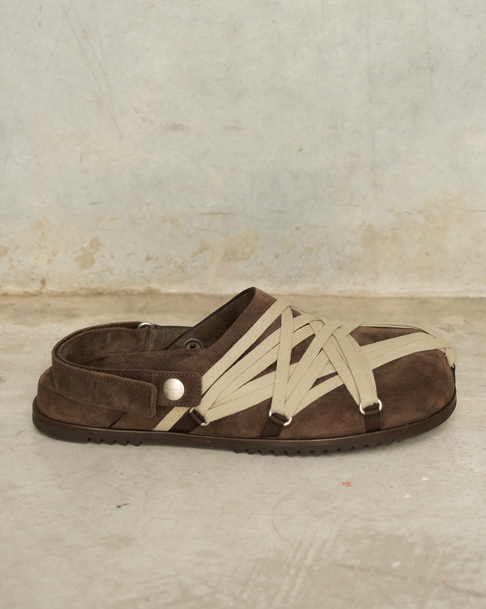 Megalace Granola mules by Rick Owens in brown. Slip-on mules with a sculpted footbed, shark-tooth sole, and pentagram-shaped mega-lacing detail across the front. Crafted from matte crosta suede leather with a natural, waxy hand feel.