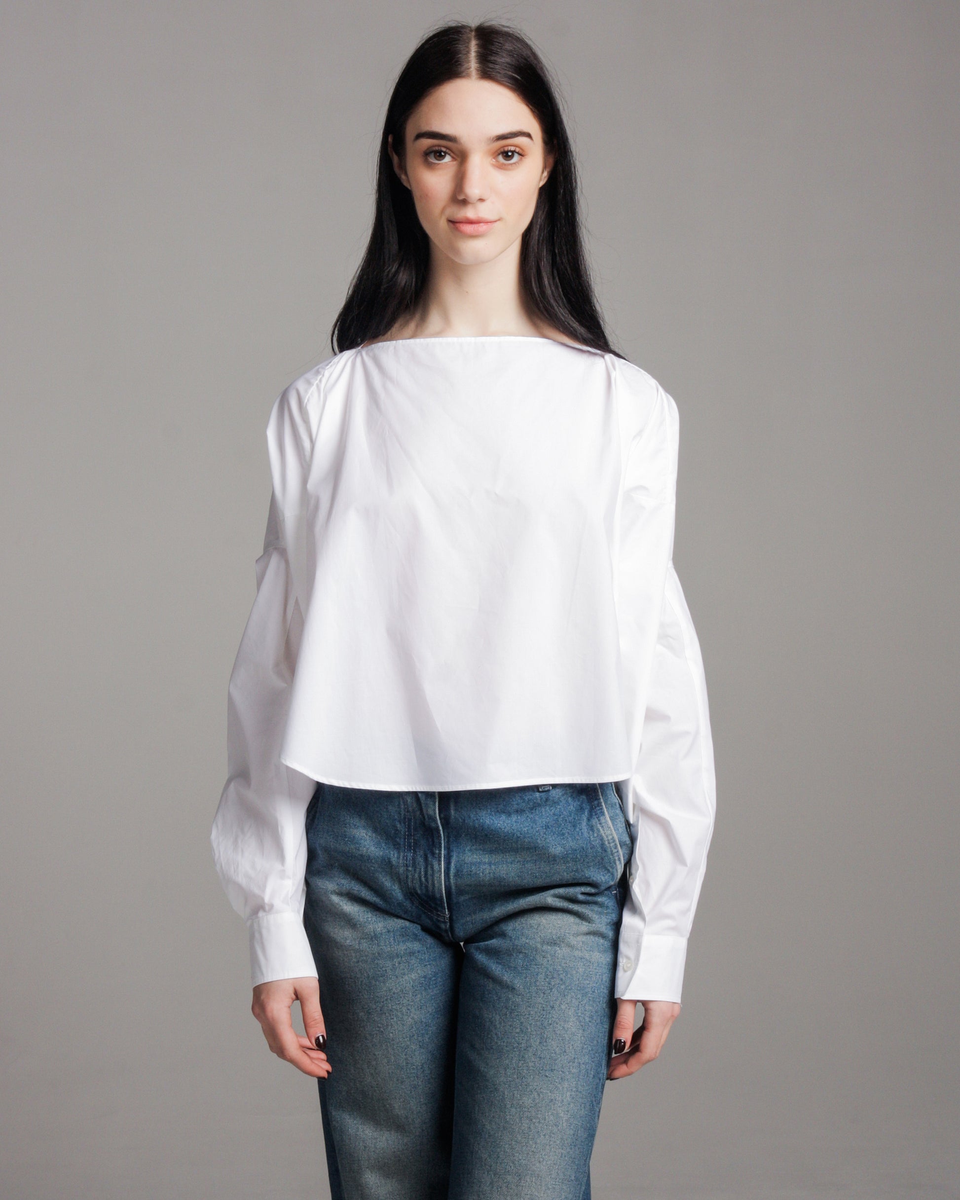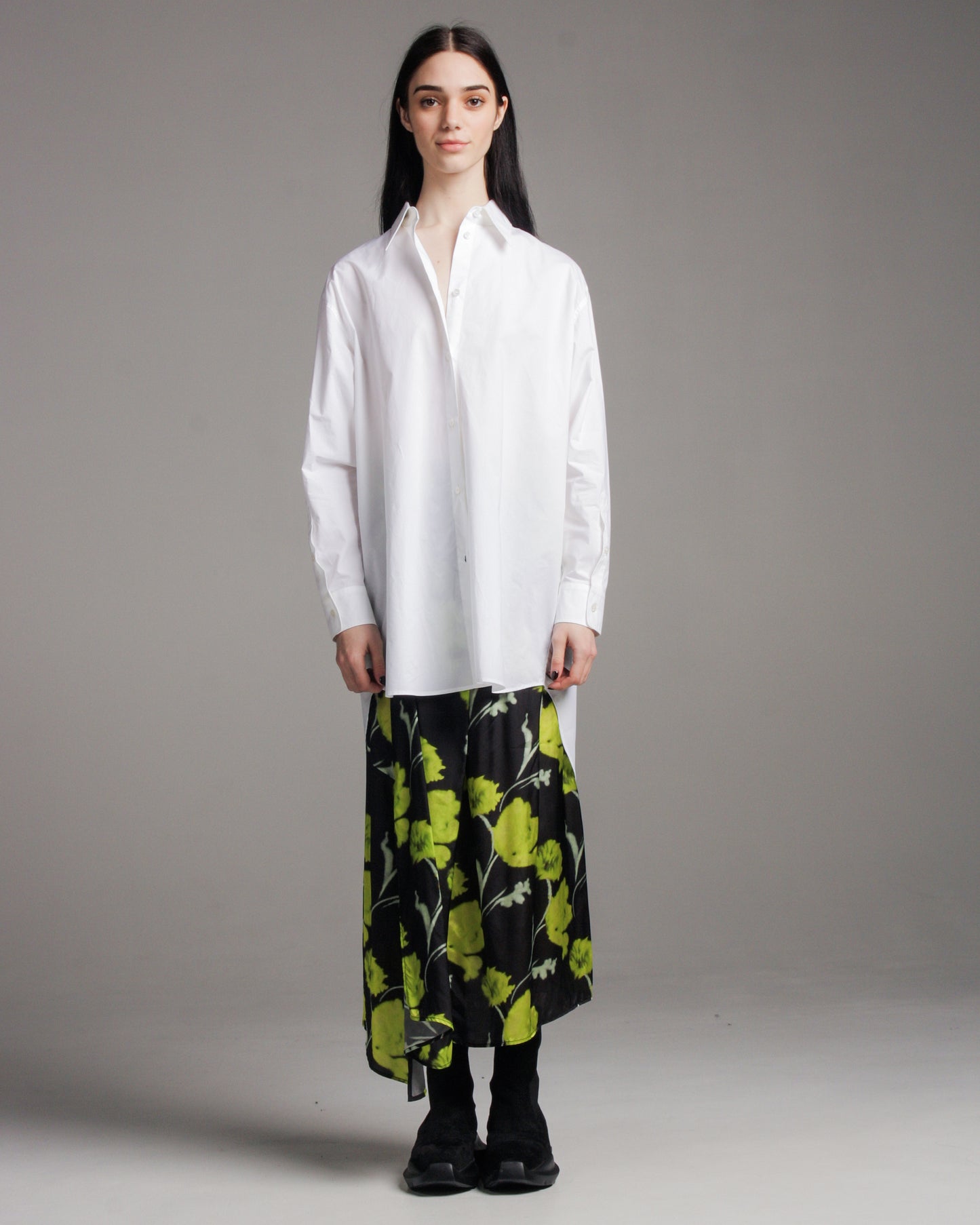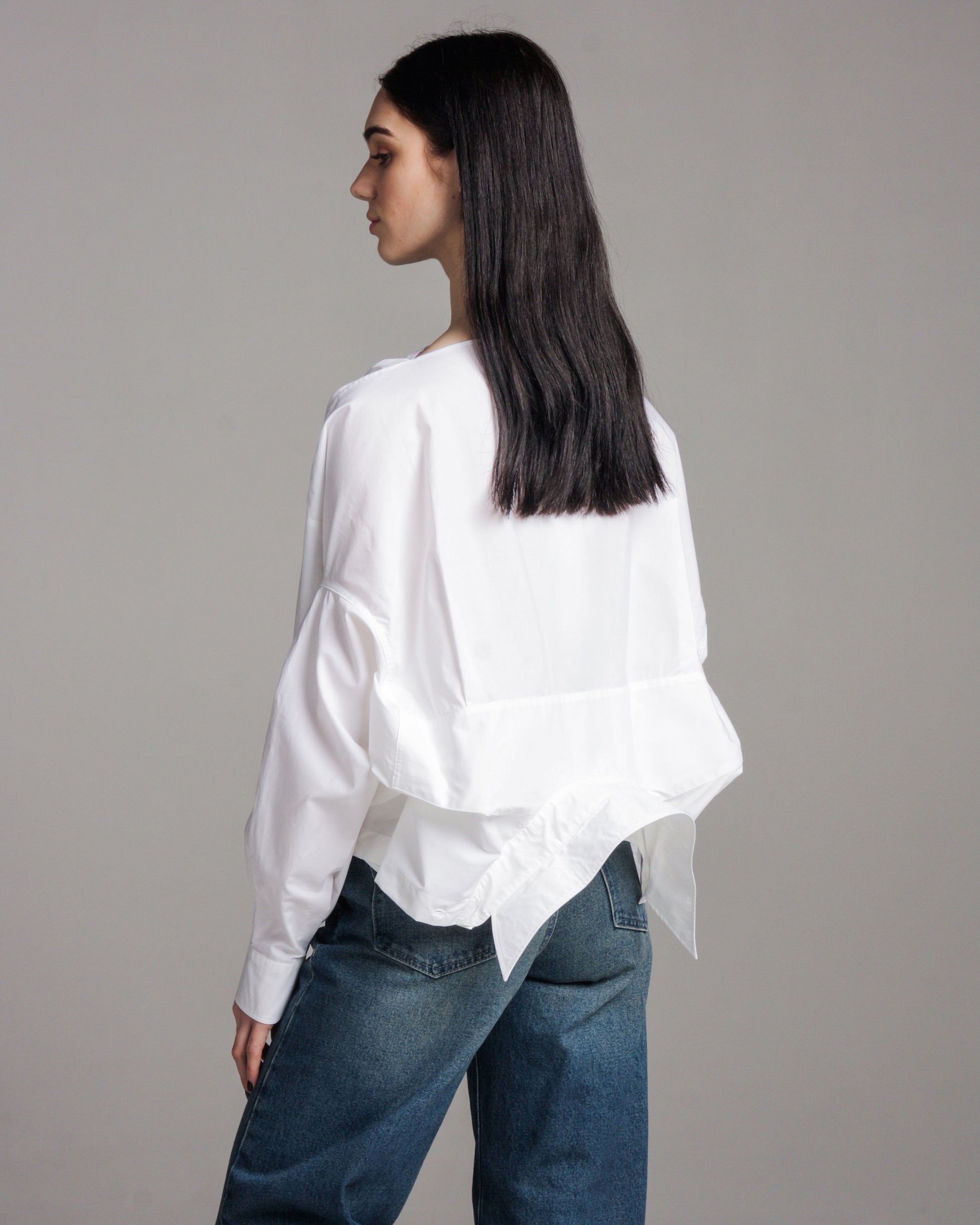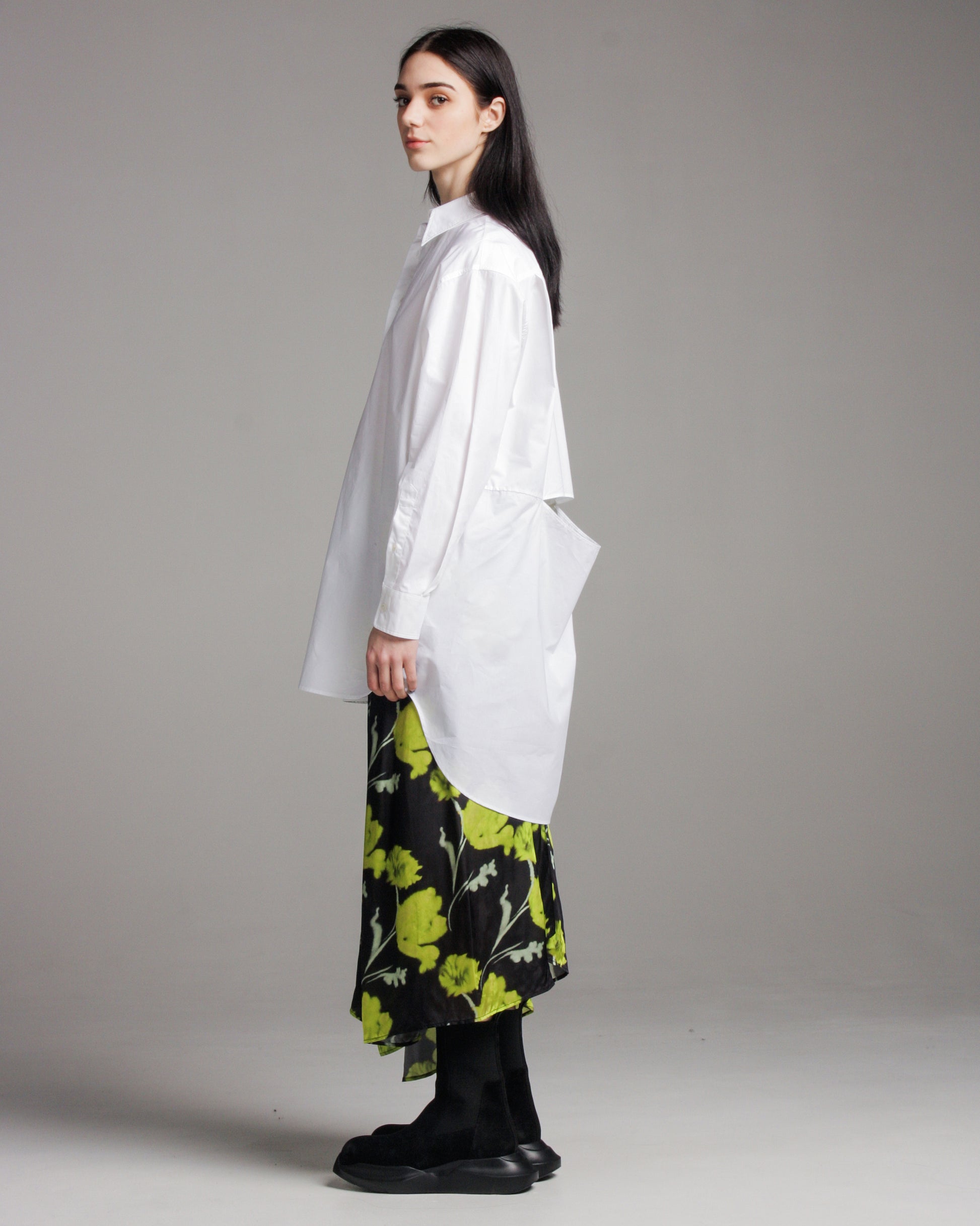 Long-line button-down shirt in crisp, optic white cotton, evoking the atmosphere of Maison Margiela's white-clad atelier. Signature oversized MM6 oversized silhouette with relaxed sleeve and dropped hem. Deconstructed horizontal slit at lower back provides architectural intrigue.