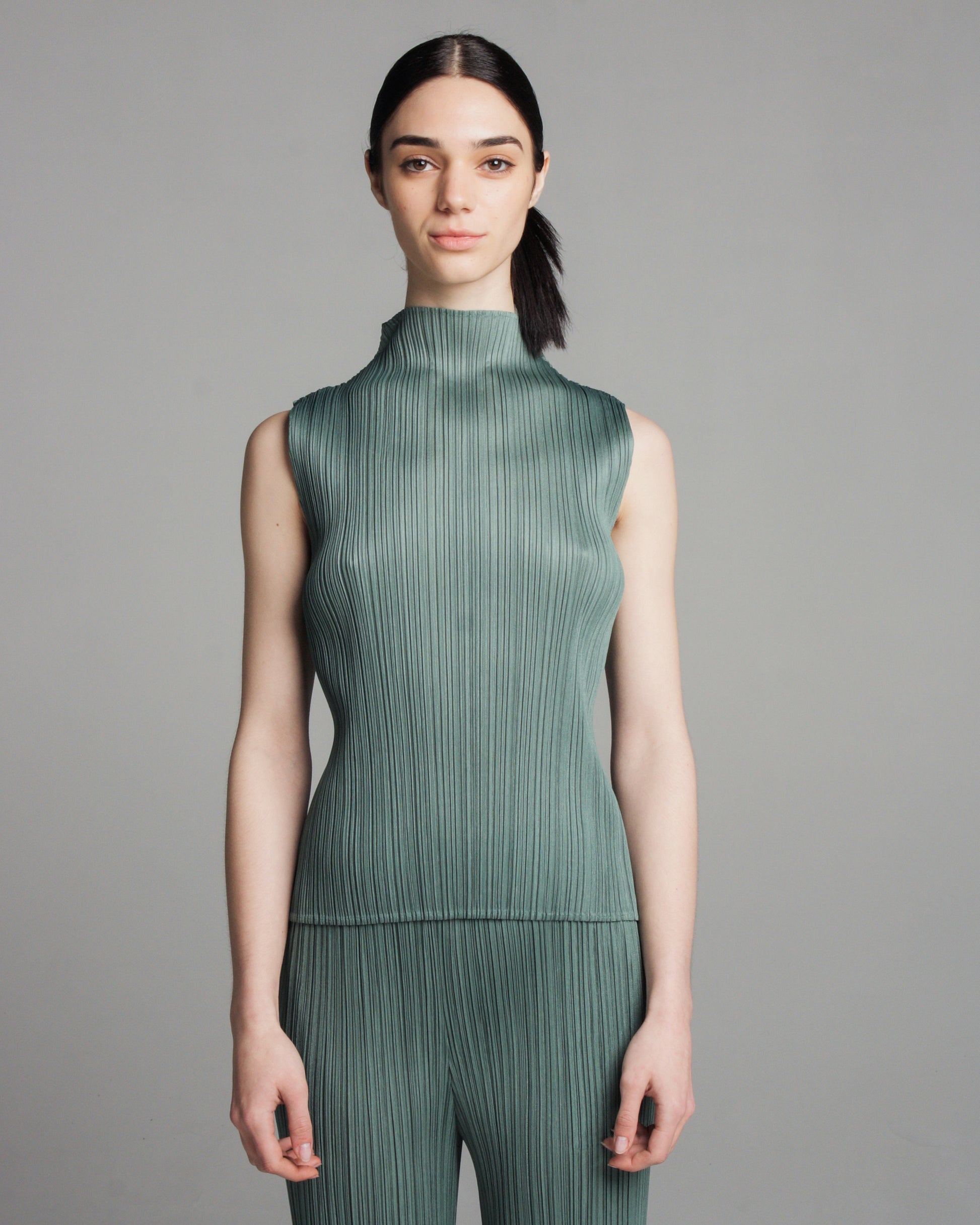High neck tank top by Pleats Please Issey Miyake in sage. Elegant raised neck tank in a tasteful tone of sage green. Signature crisp vertical pleating has a soft lustre and maintains its texture perfectly.