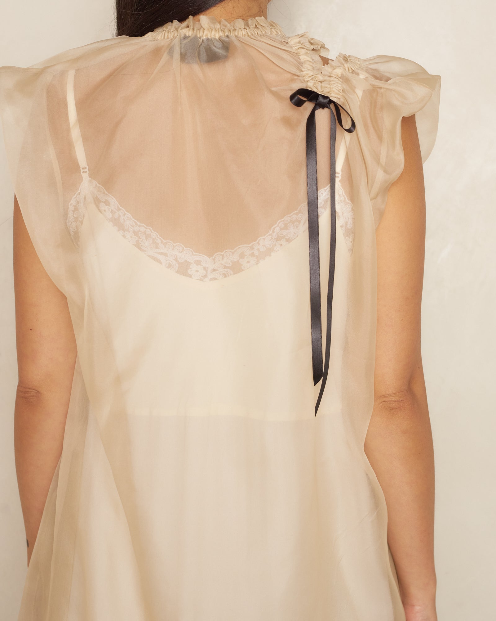 Silk organza midi dress by Simone Rocha. Embodying ethereal beauty and nostalgic elegance, this piece floats gently around the body with delicate sheerness. Crafted from silk organza in a soft biscuit hue, the V-neckline is complemented by an asymmetric shoulder slice, both adorned with black bow ribbons. An enchanting choice for any special occasion, capturing a delicate balance between sophistication and fantasy.