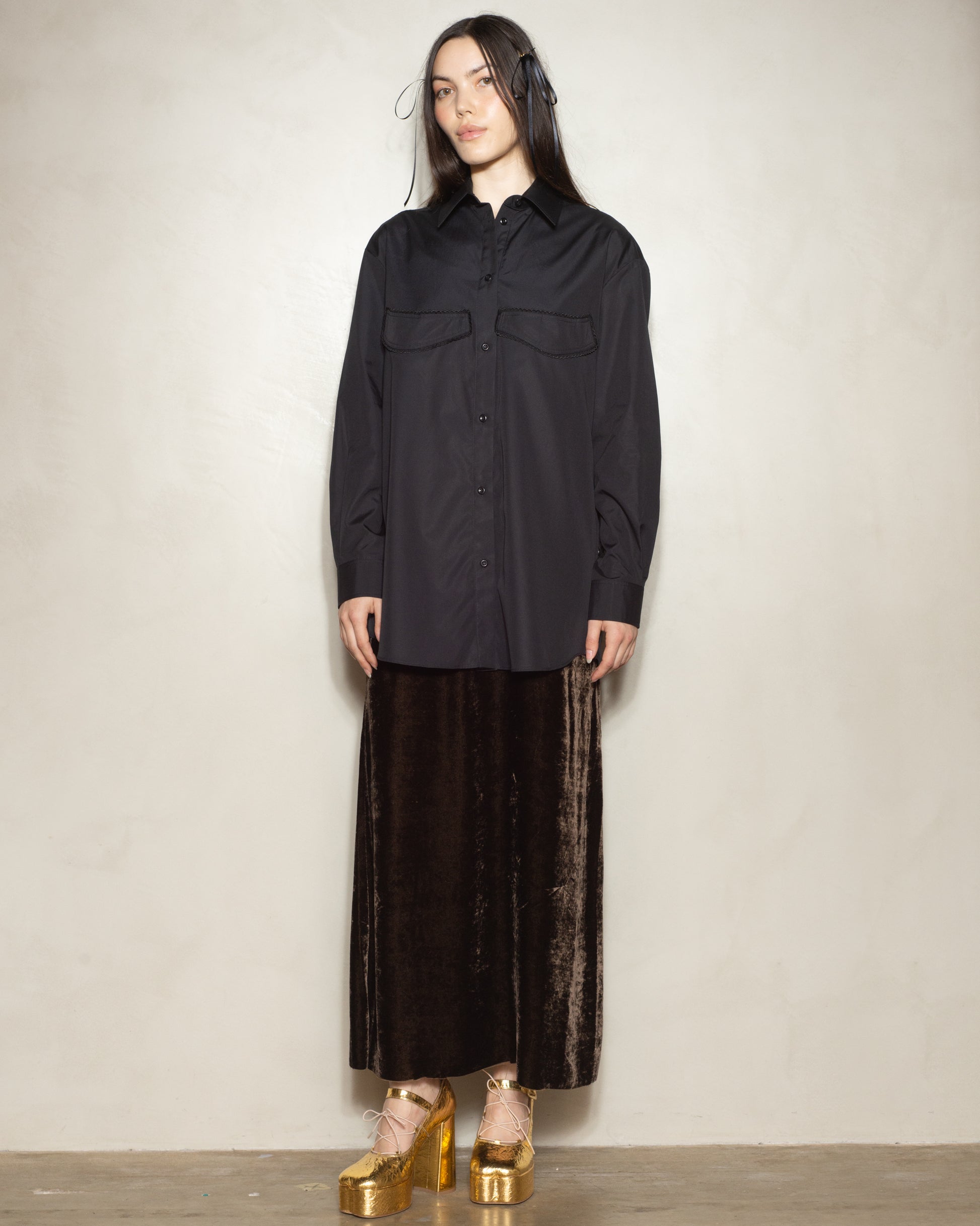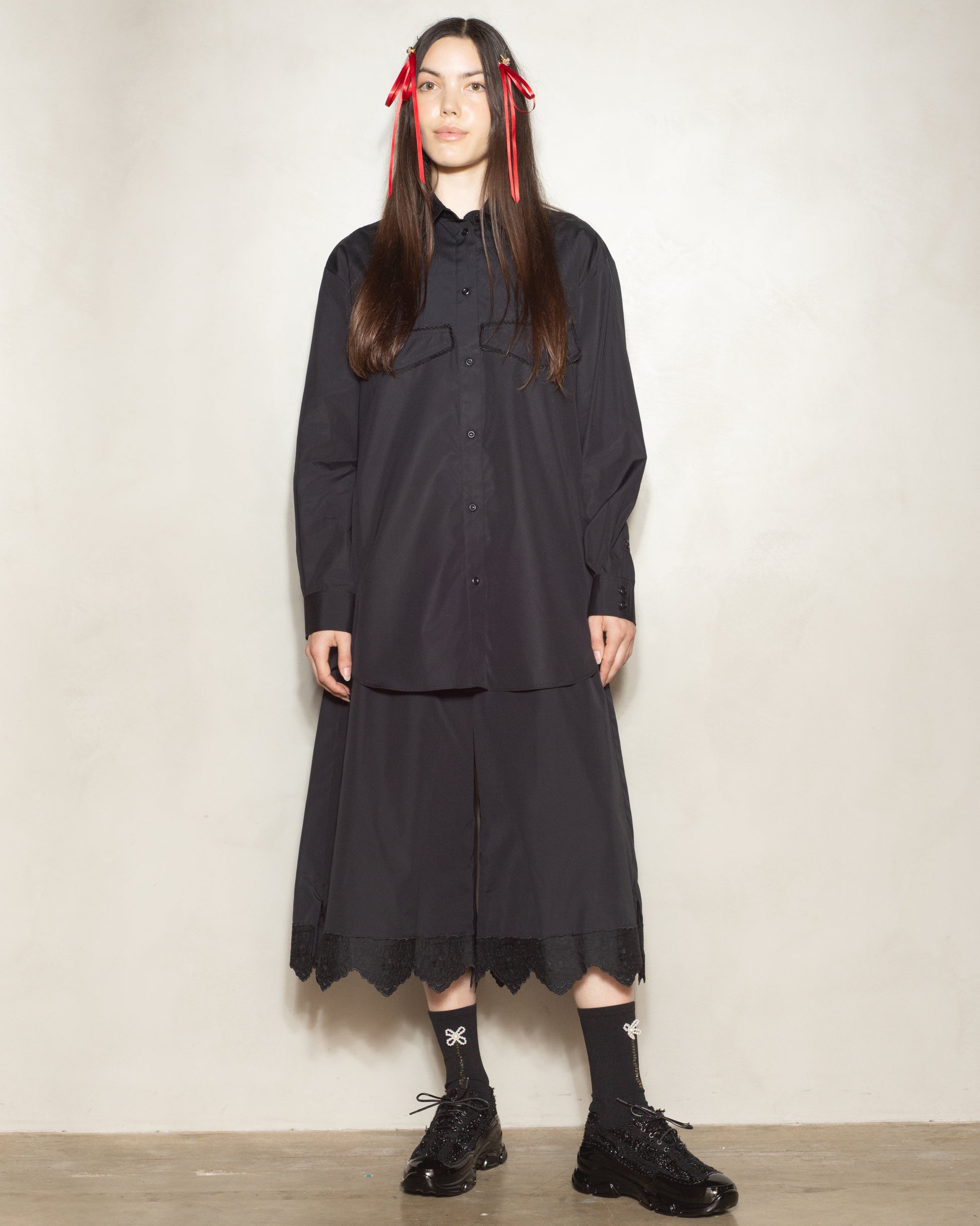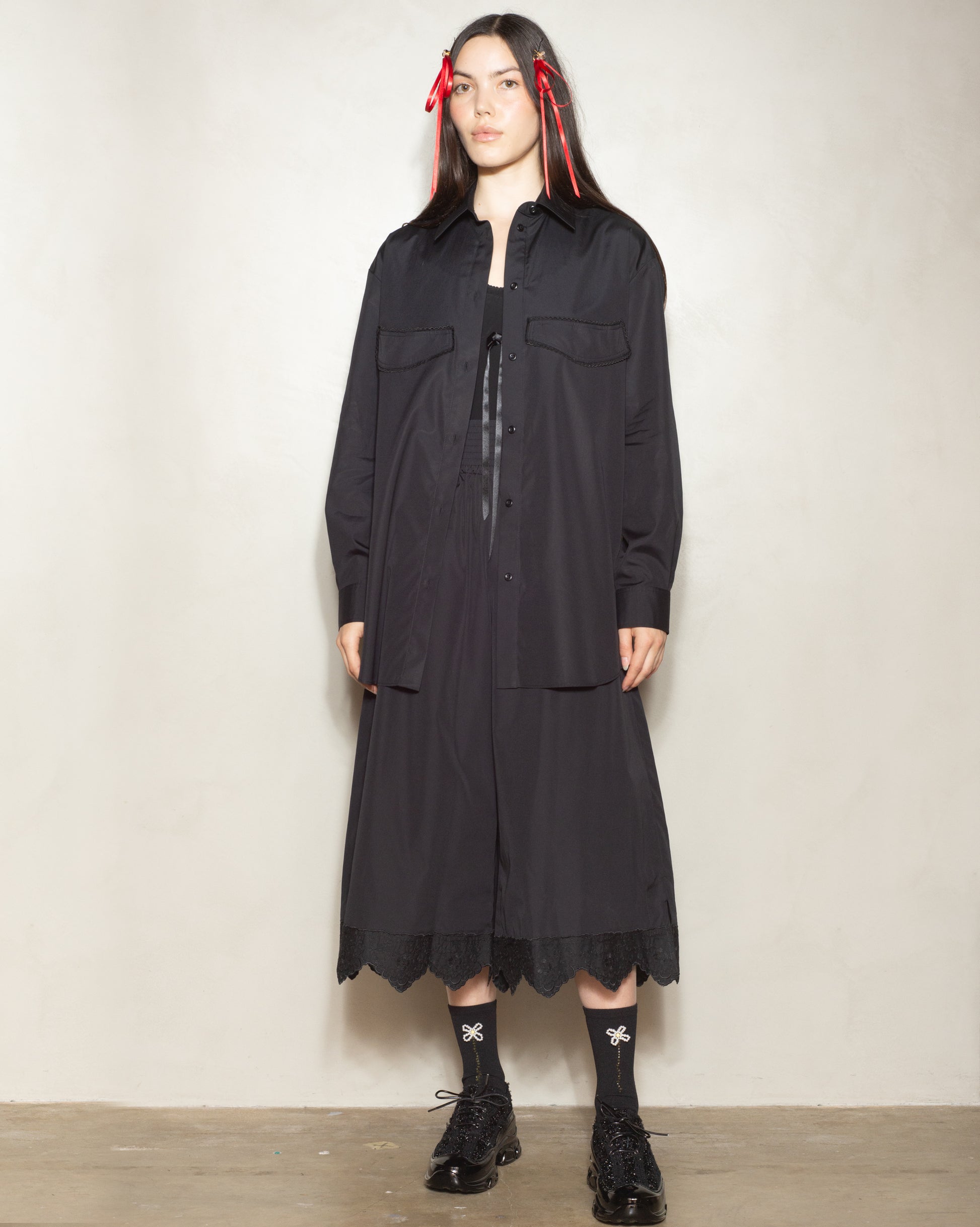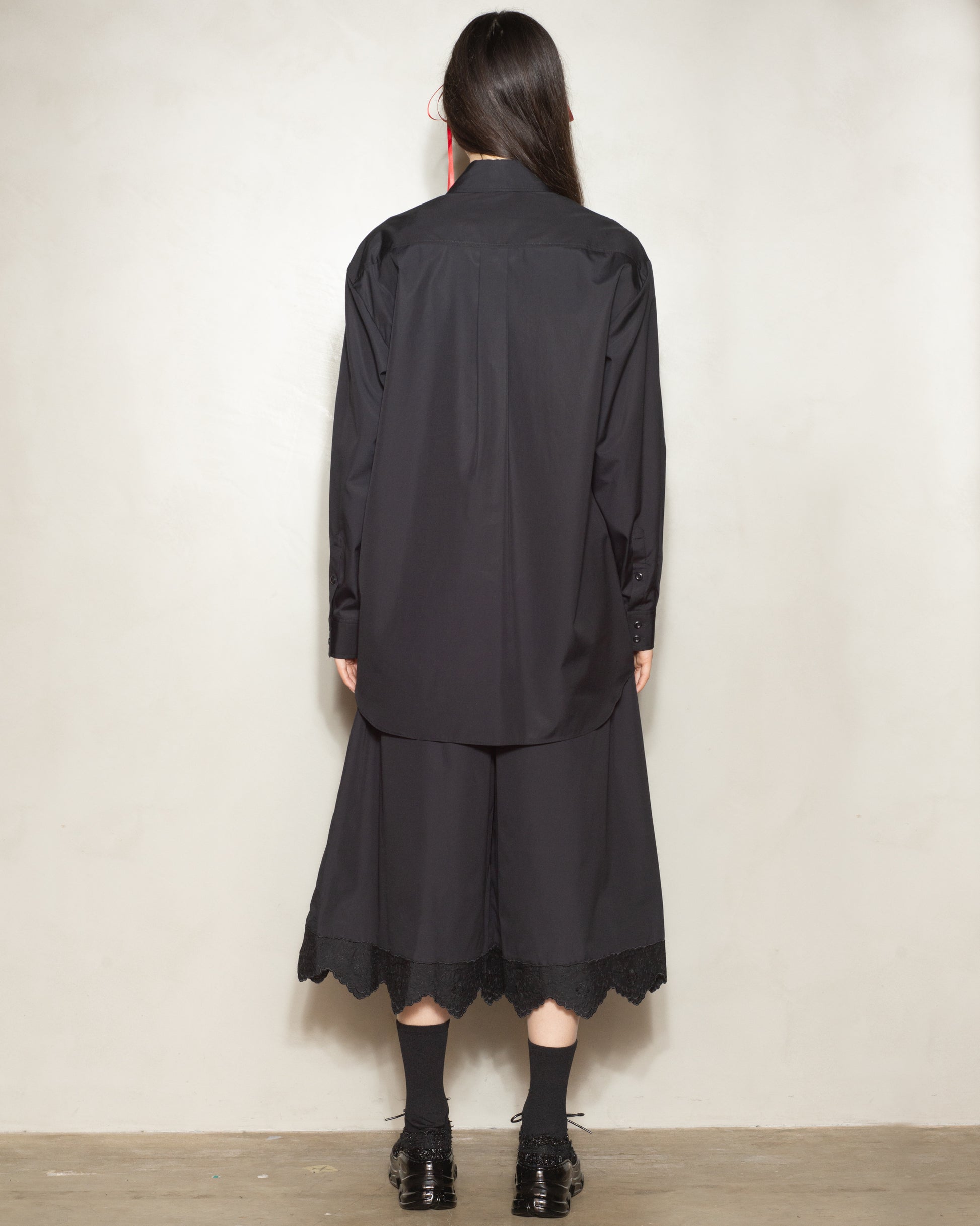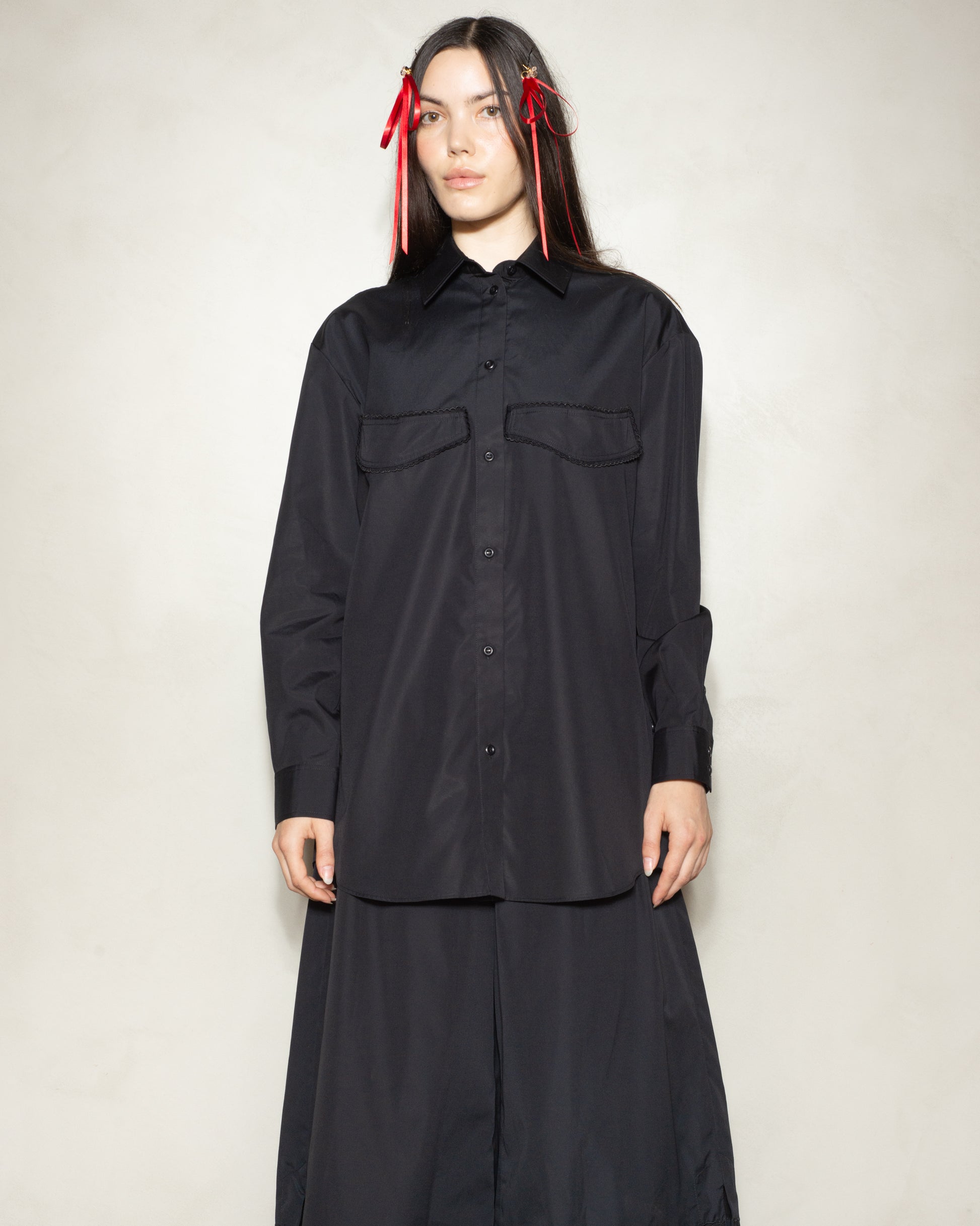 Black cup shirt by Simone Rocha. Black shirt in crisp cotton poplin. Classic style with pointed collar and button fastening, featuring embroidered cup detailing at the chest. A subtly romantic reinvention of a typically masculine style.