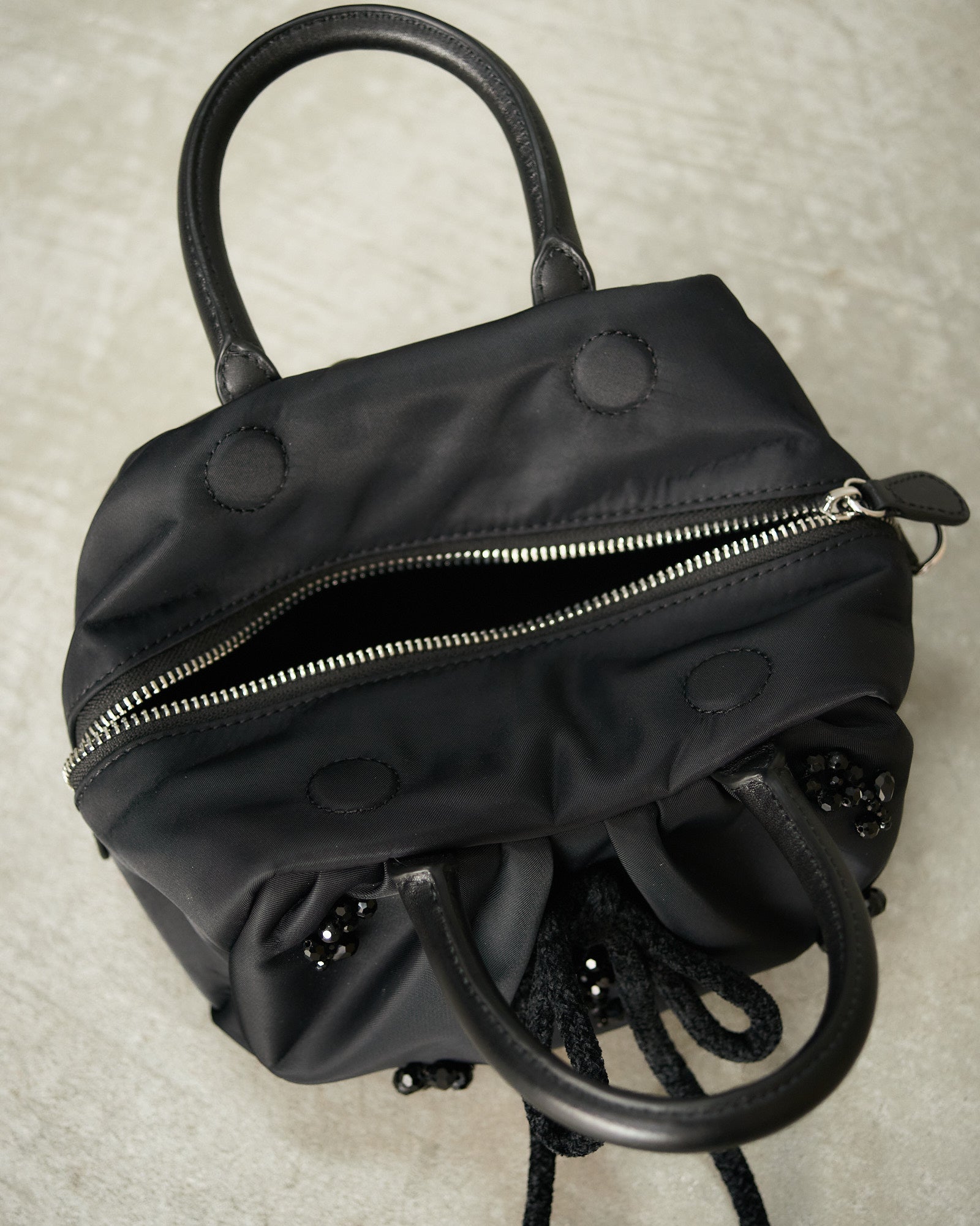 Mini gathered handle bag by Simone Rocha in black. Mini handbag in durable nylon finished with magnetic snap and zipped closure. The front is adorned with a fuzzy chenille bow and jet crystal beading for a signature finish.