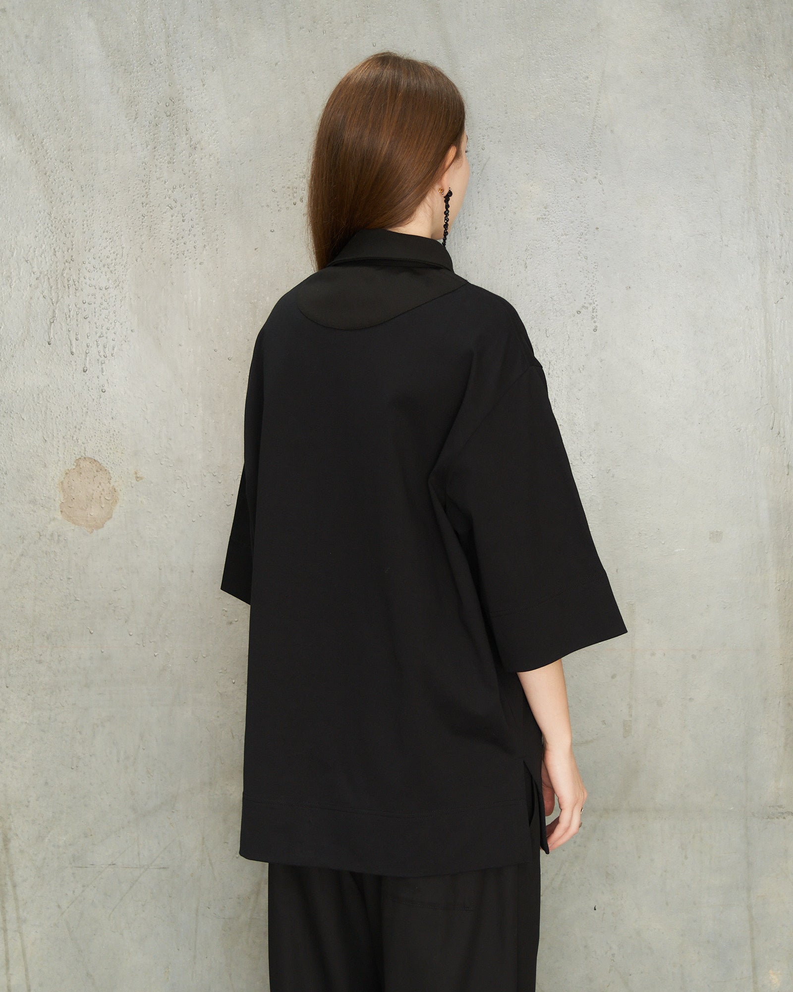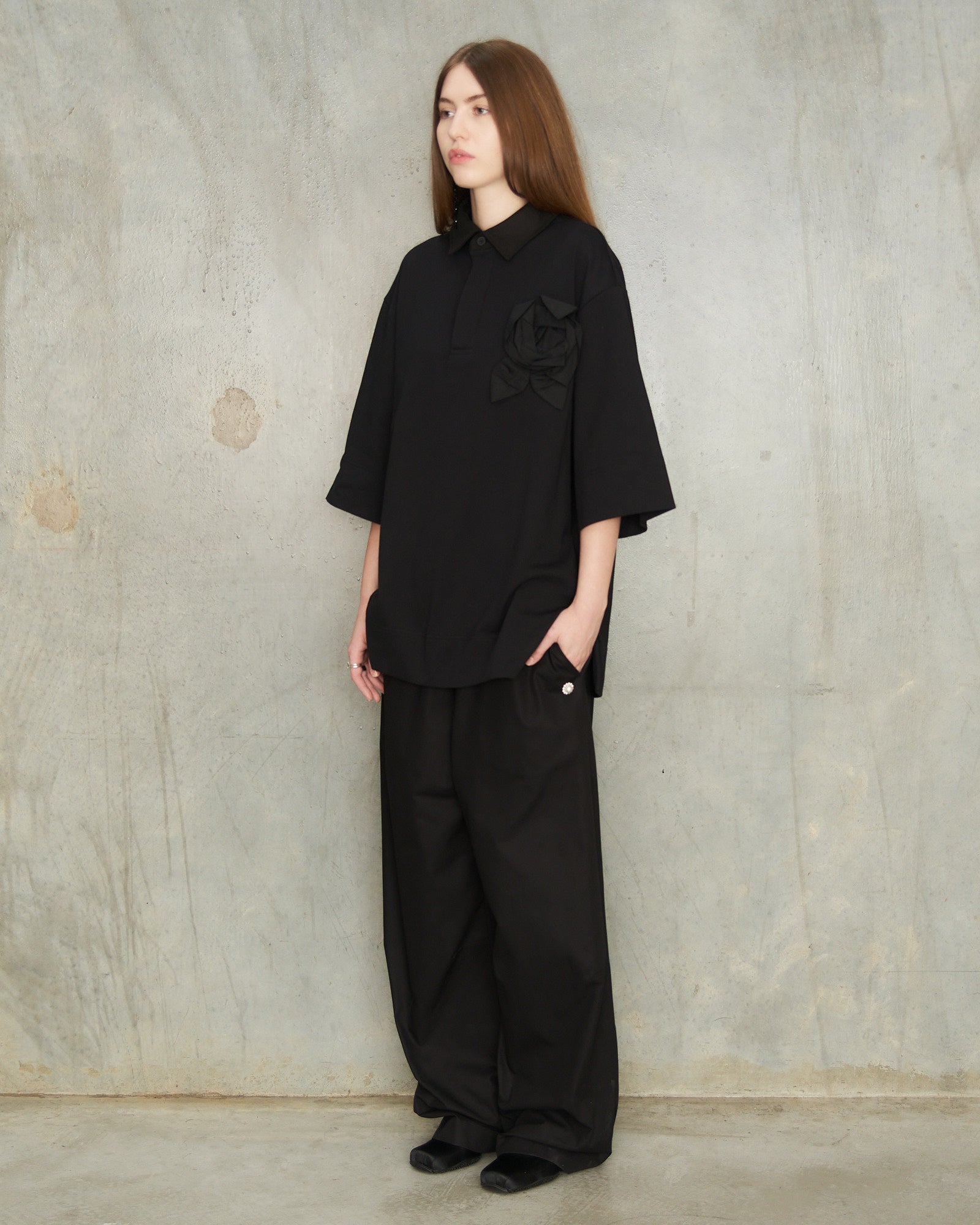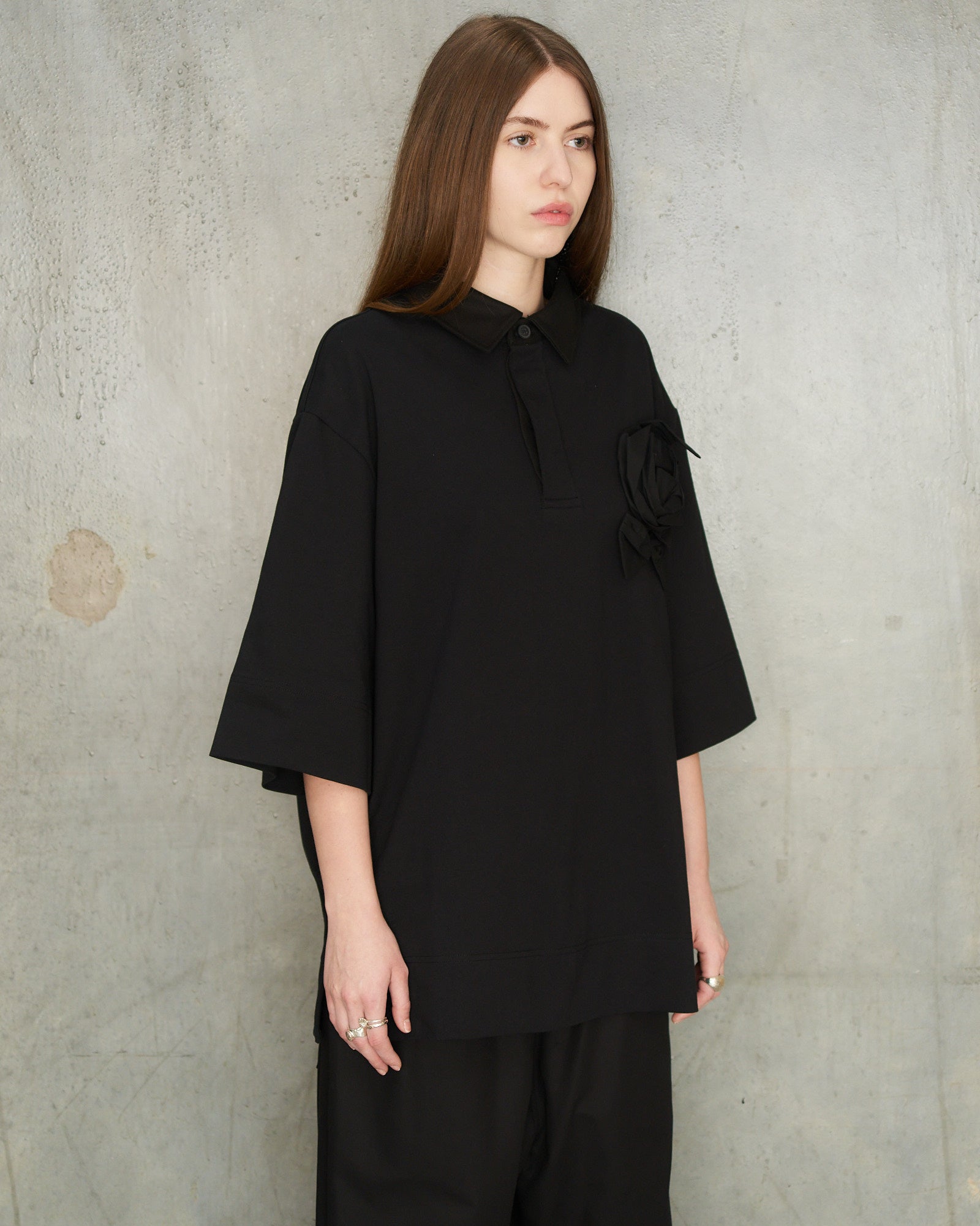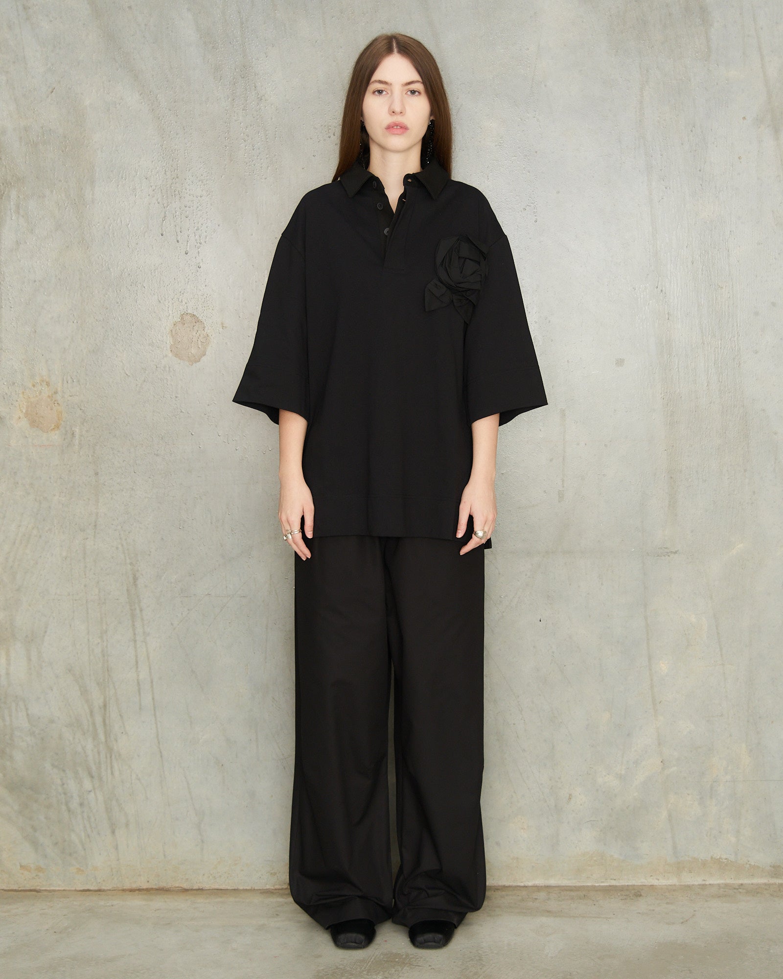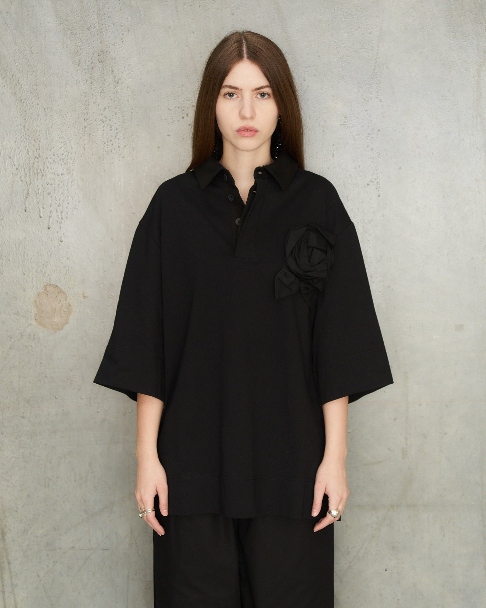 Pressed rosette rugby shirt by Simone Rocha in black. Taking inspiration from classic sporting polo shirts, this iteration in heavyweight structured jersey featured a crumpled and pressed rose adorning the chest.