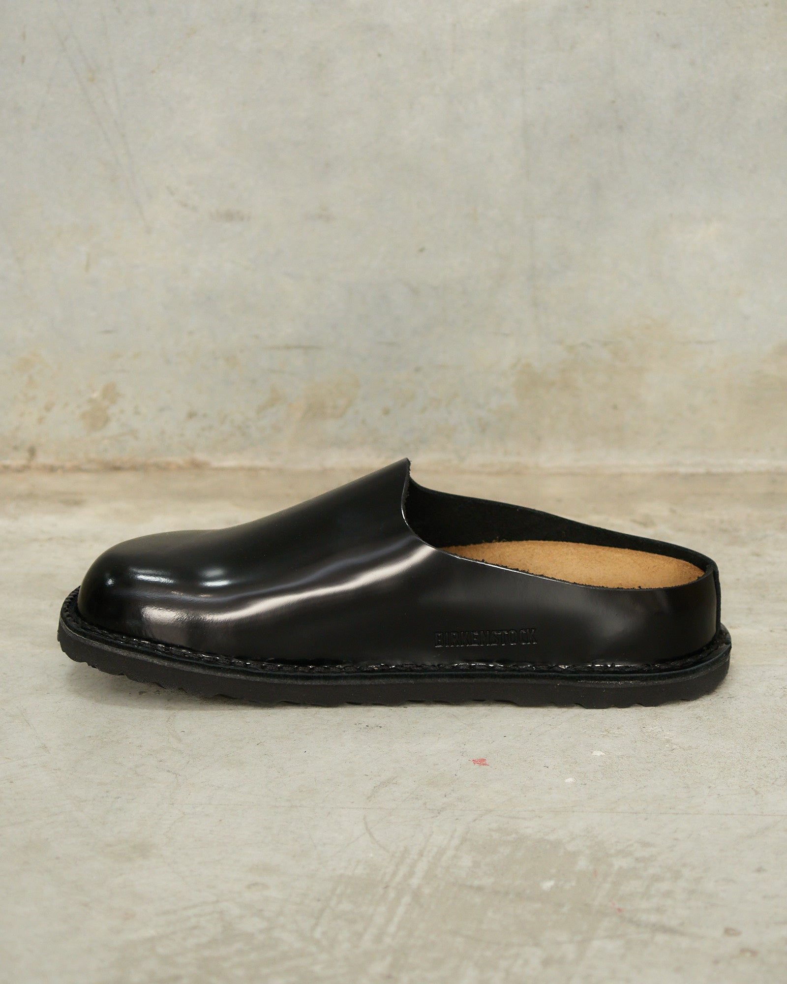 Amsterdam 'The Collector' clog by Song for the Mute x Birkenstock in black. A classic Amsterdam clog realised in polished leather, marked with a co-branded rivet. The anatomically shaped cork-latex footbed and exclusive stitch-down outsole ground the collaboration in Birkenstock's functional heritage — the result feeling quietly archival and entirely intentional.
