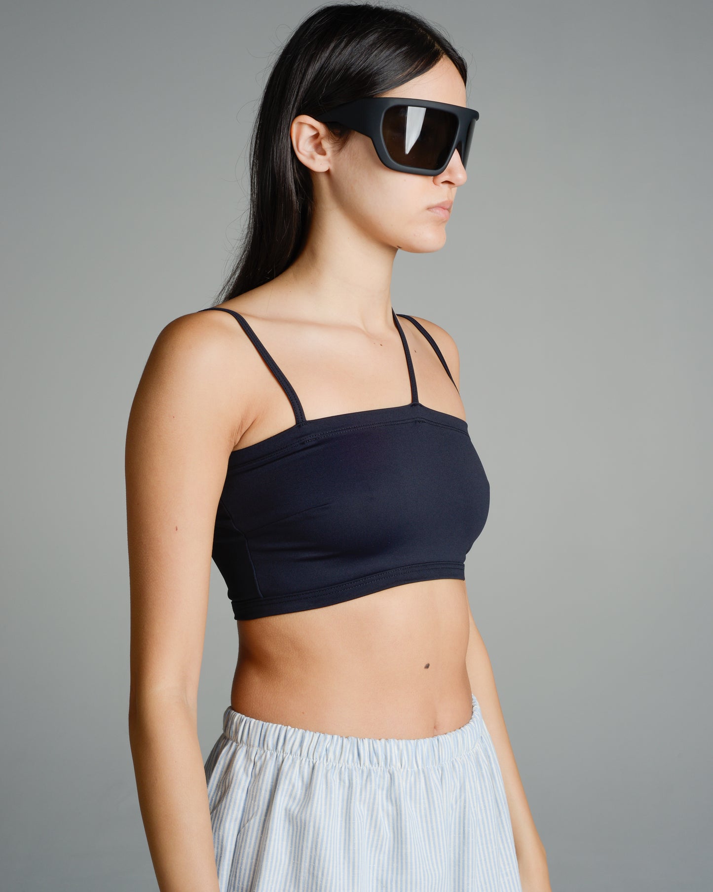 Nida swim top and bottom by Baserange. Signature three strap style remodelled as a svelte swimming top. Nylon blend swimming pants with thin elastic trims at the waist and legs. Additional detached straps add an alluring, decorative element.