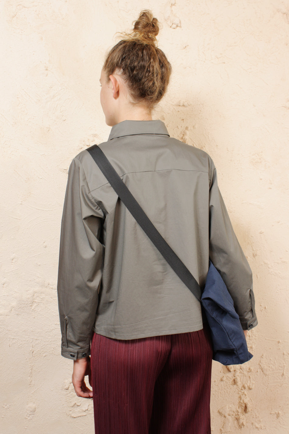 A new multi-handle tote from Man-tle. The longer shoulder strap is designed to wear across the body, the shorter is for wearing high on the shoulder. This signature Man-tle cloth is stiff and windproof. It has its own shape retaining memory which will soften with washing and use.