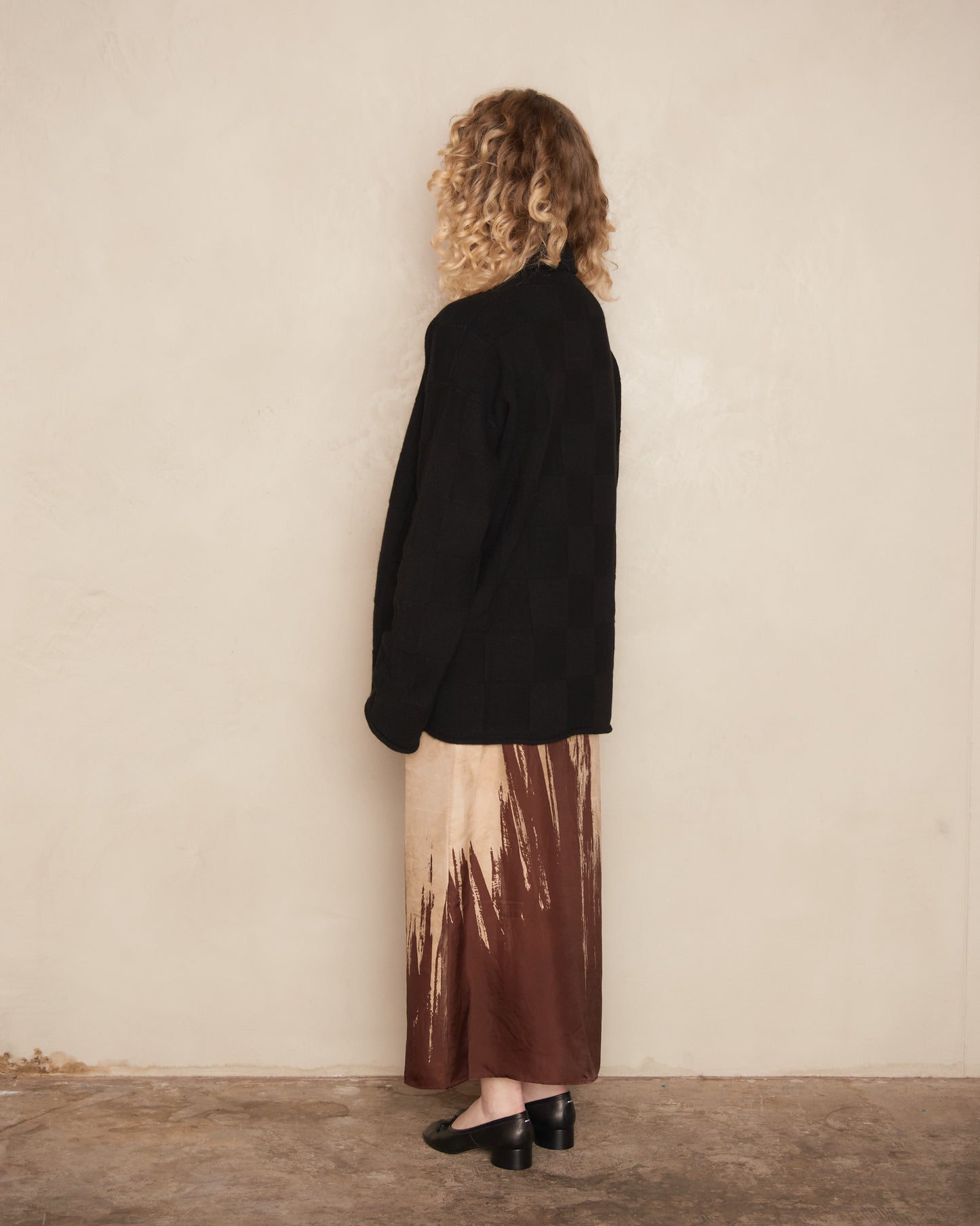 Open cardigan by Uma Wang in black. Shawl-style cardigan crafted in a thick wool and cashmere blend to ensure warmth and luxurious softness. A mesmirising checkered texture is knitted into the piece to introduce a subtle geometry to this comfortably enveloping silhouette.