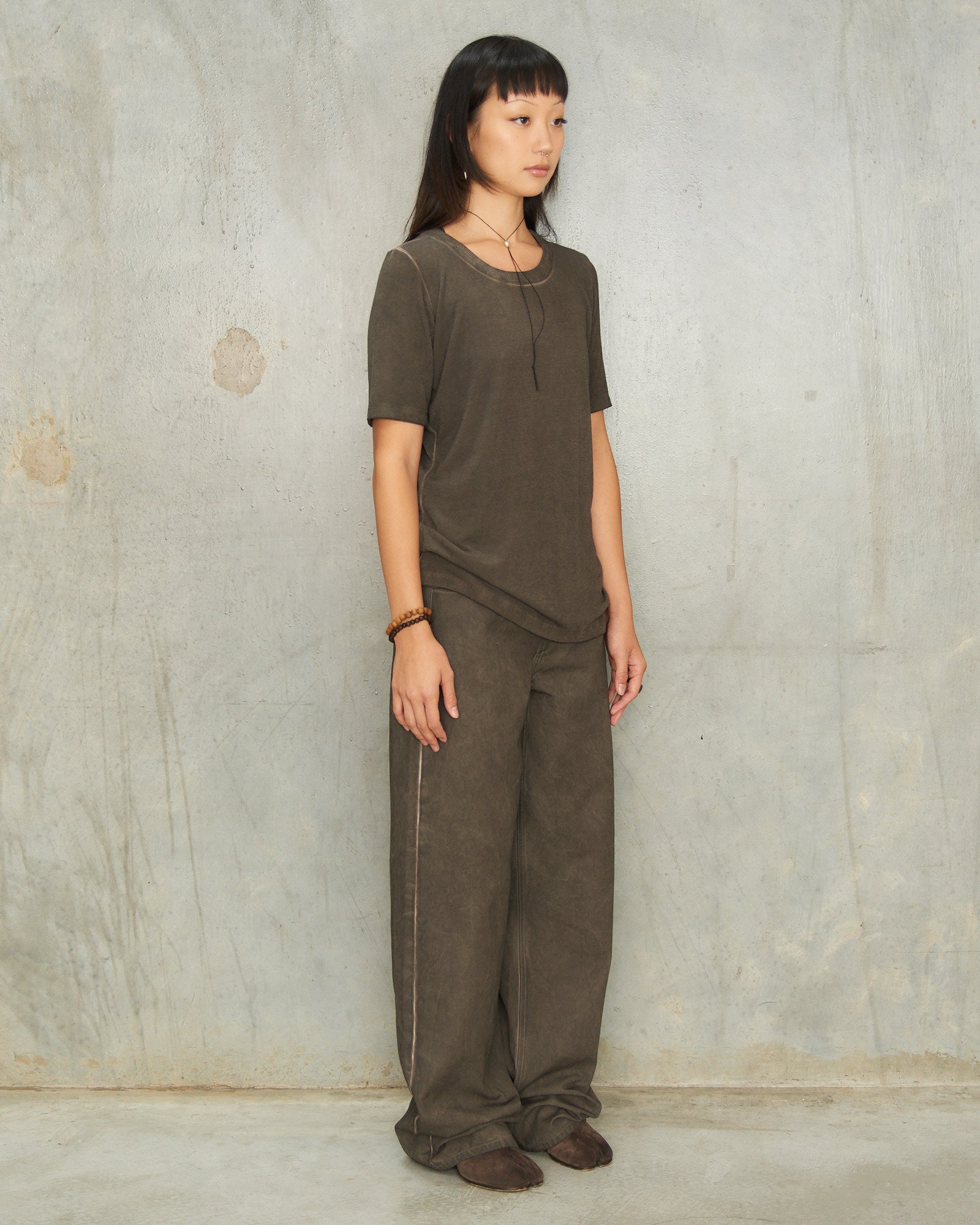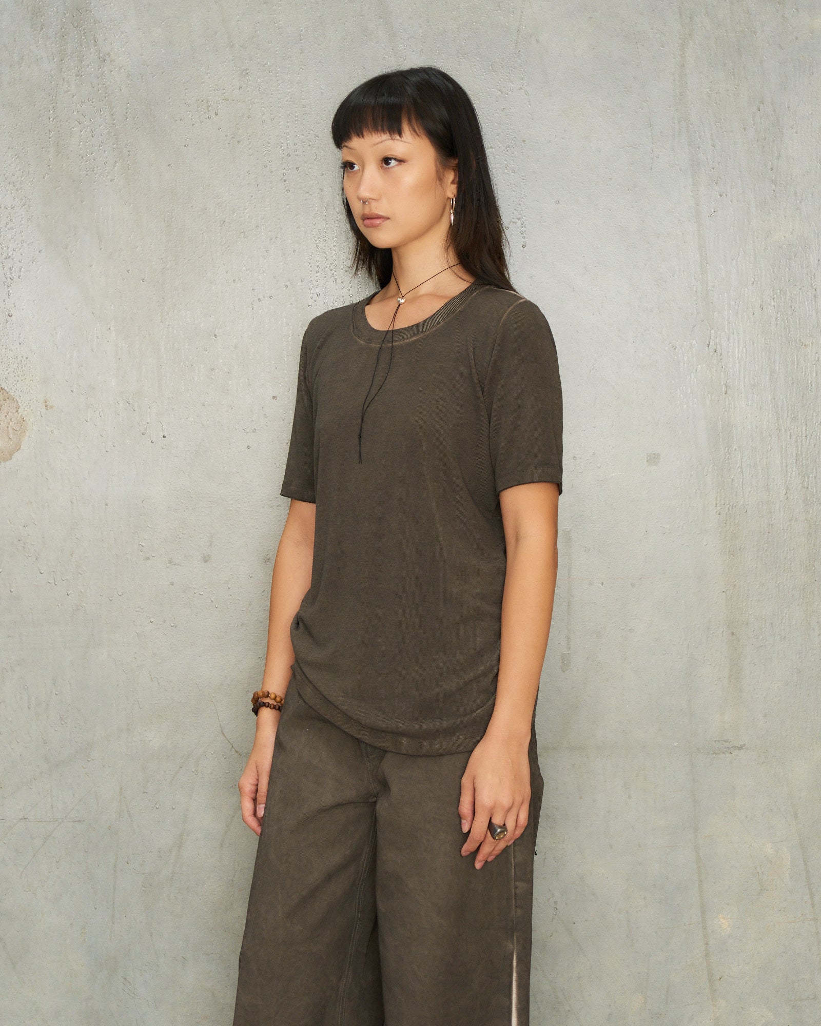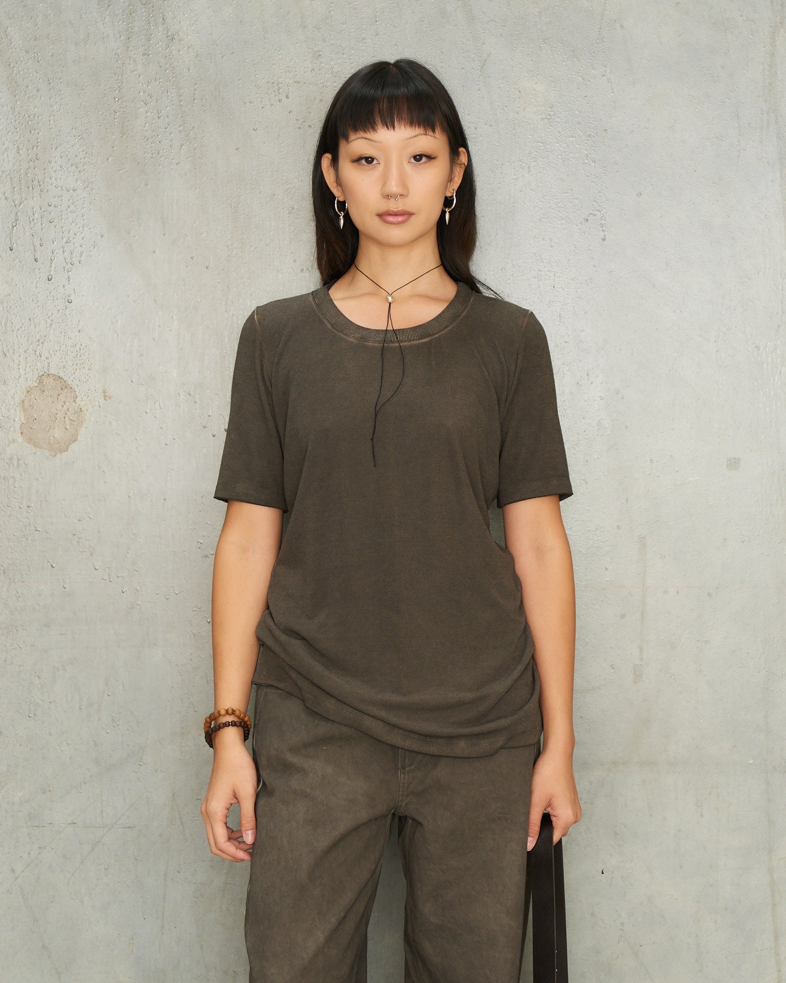 Tir top by Uma Wang in grey brown. Slender viscose top with fine-ribbed texture and supple fit. An exposed seam runs down the centre back, finished with raw detailing. Authentic dyeing process leaves subtle untouched seams, enhancing its rustic appeal.