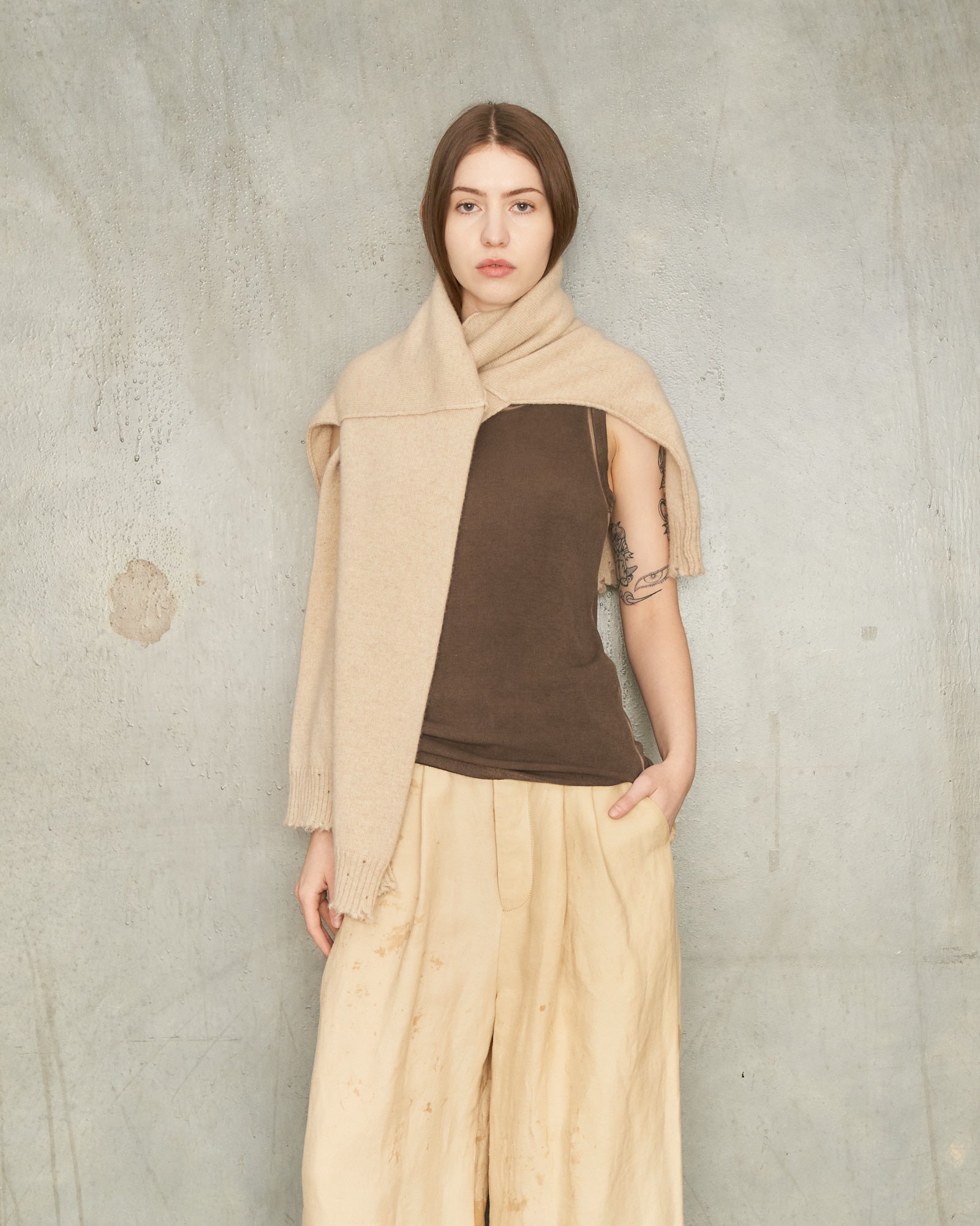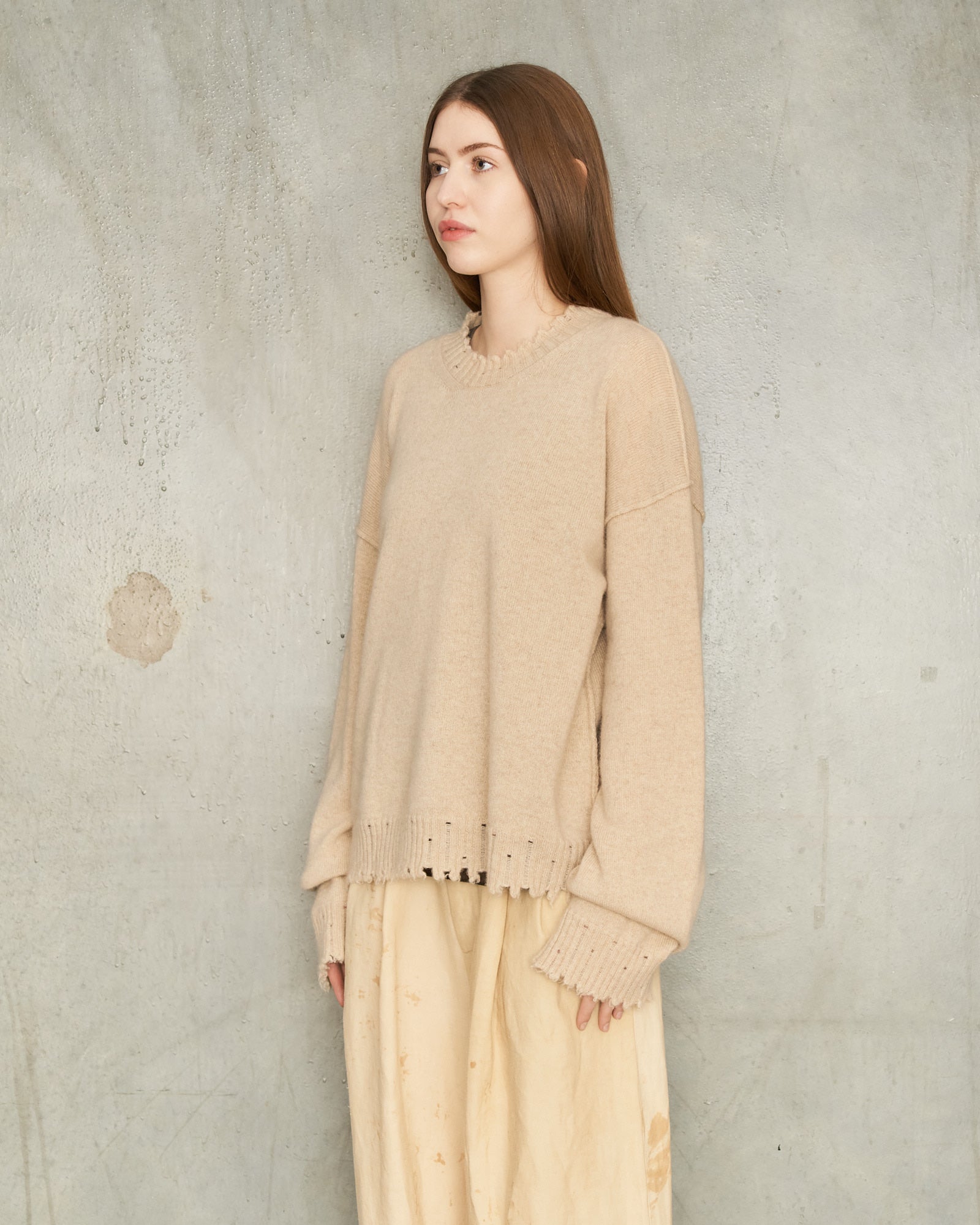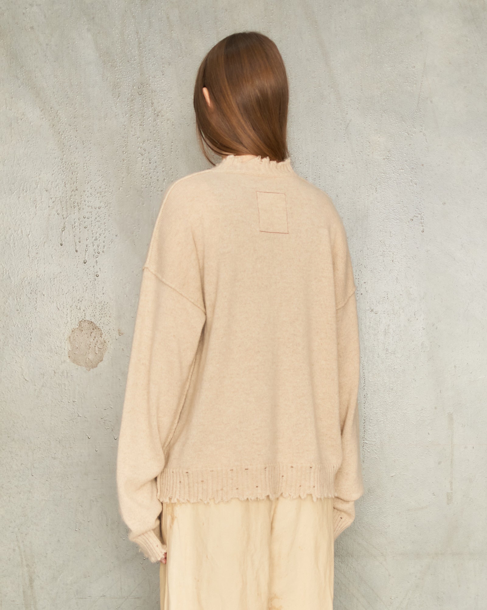Trim wool sweater by Uma Wang in tan. Crafted from soft cashmere, this sweater features dropped shoulders and draped, voluminous sleeves. Distressed hems add a subtle, handcrafted character.