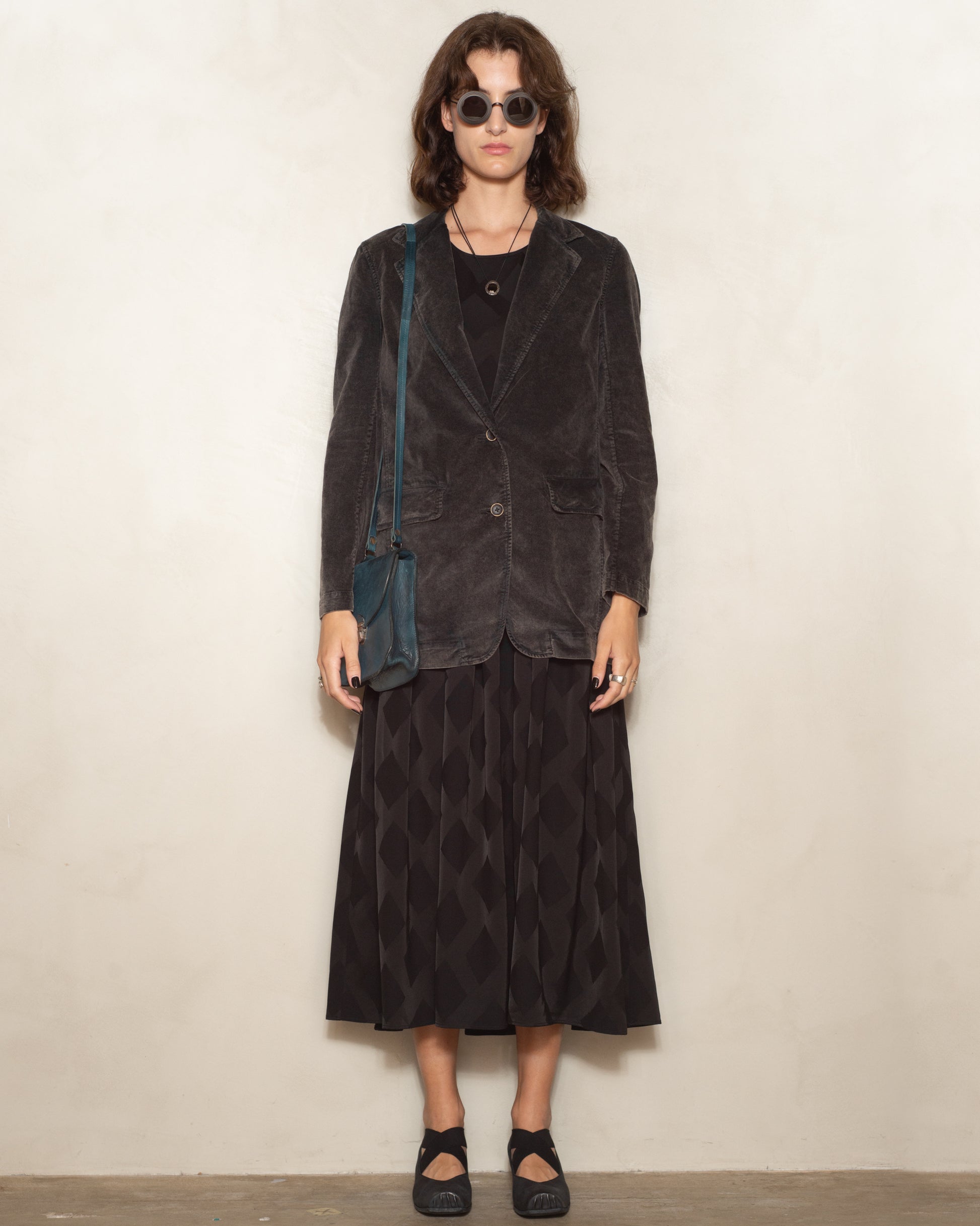 The Jane jacket by Uma Wang in dark grey. Single breasted tailored jacket in cotton modal blend. Tarnished buttons, notched lapels and flap pockets. Imperfect variations in tone give off an undisputedly rustic appearance in mottled grey velvet.