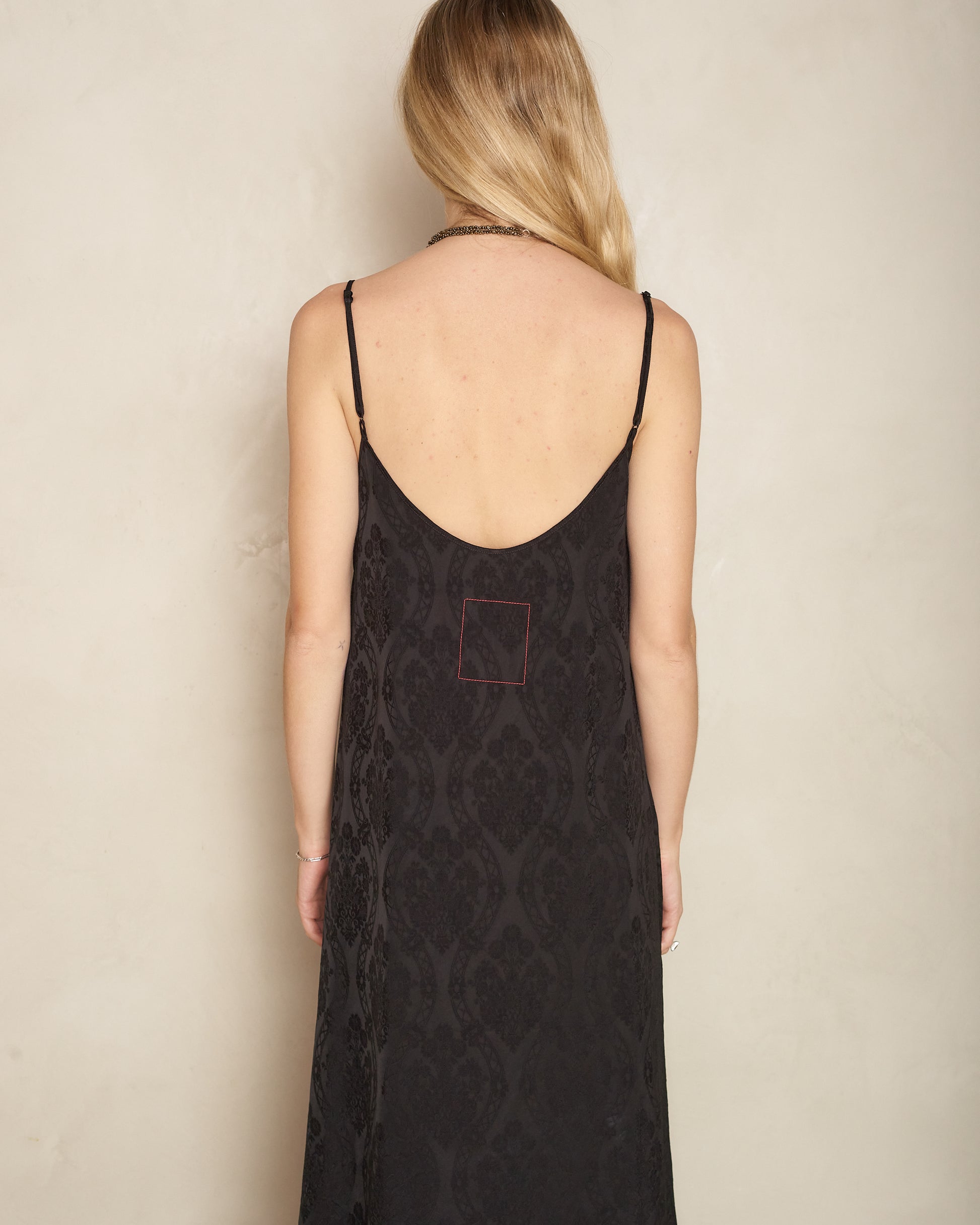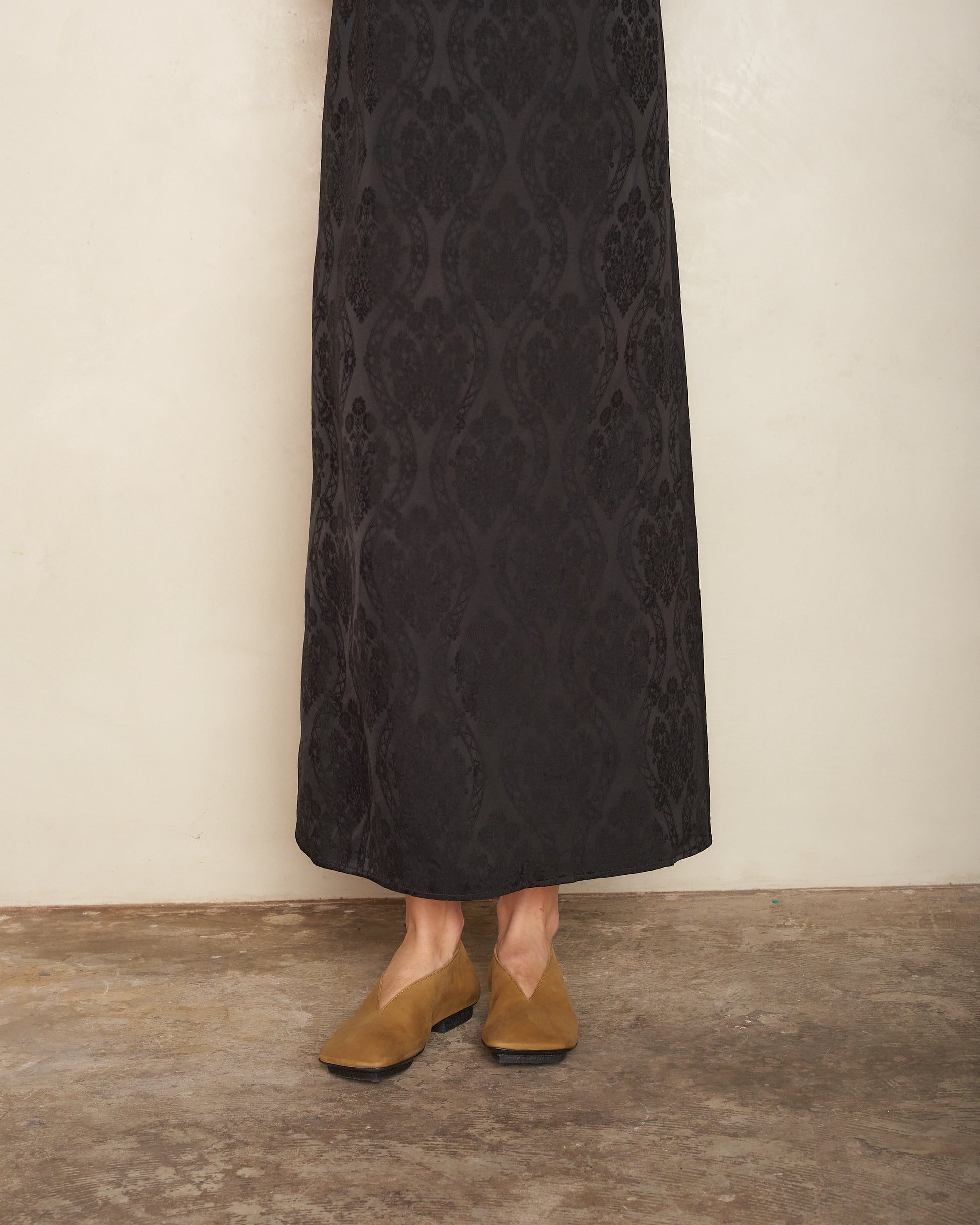 Anaya dress by Uma Wang. Slip dress crafted in an exquisitely draped blend of viscose, subtly patterned with an elegant floral jacquard. Adjustable straps and light darting at the bust, finishing with a straight hem. Intimate and darkly romantic.