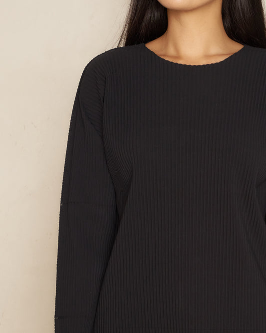 Black Fine Knit Pleated Long Sleeve Top