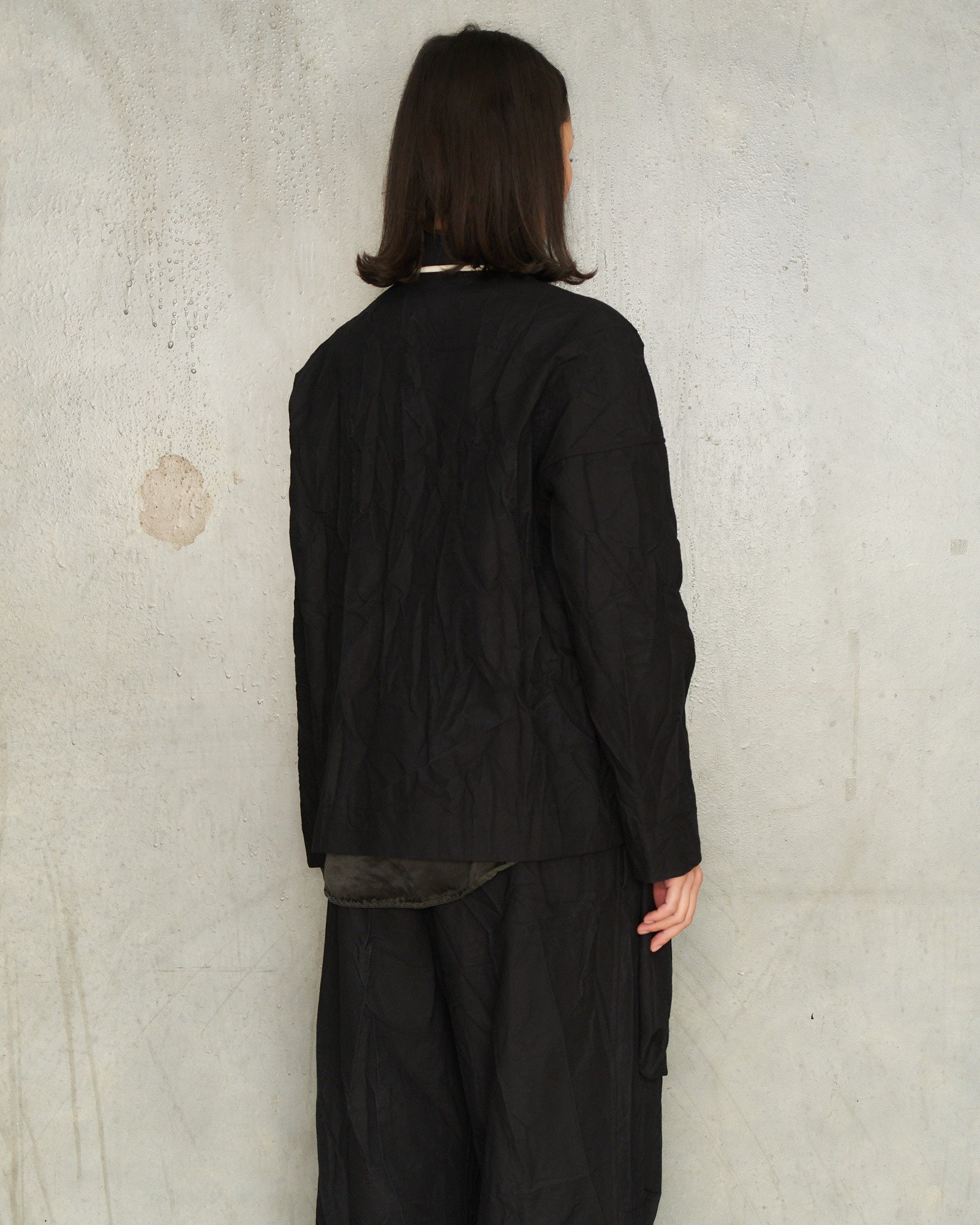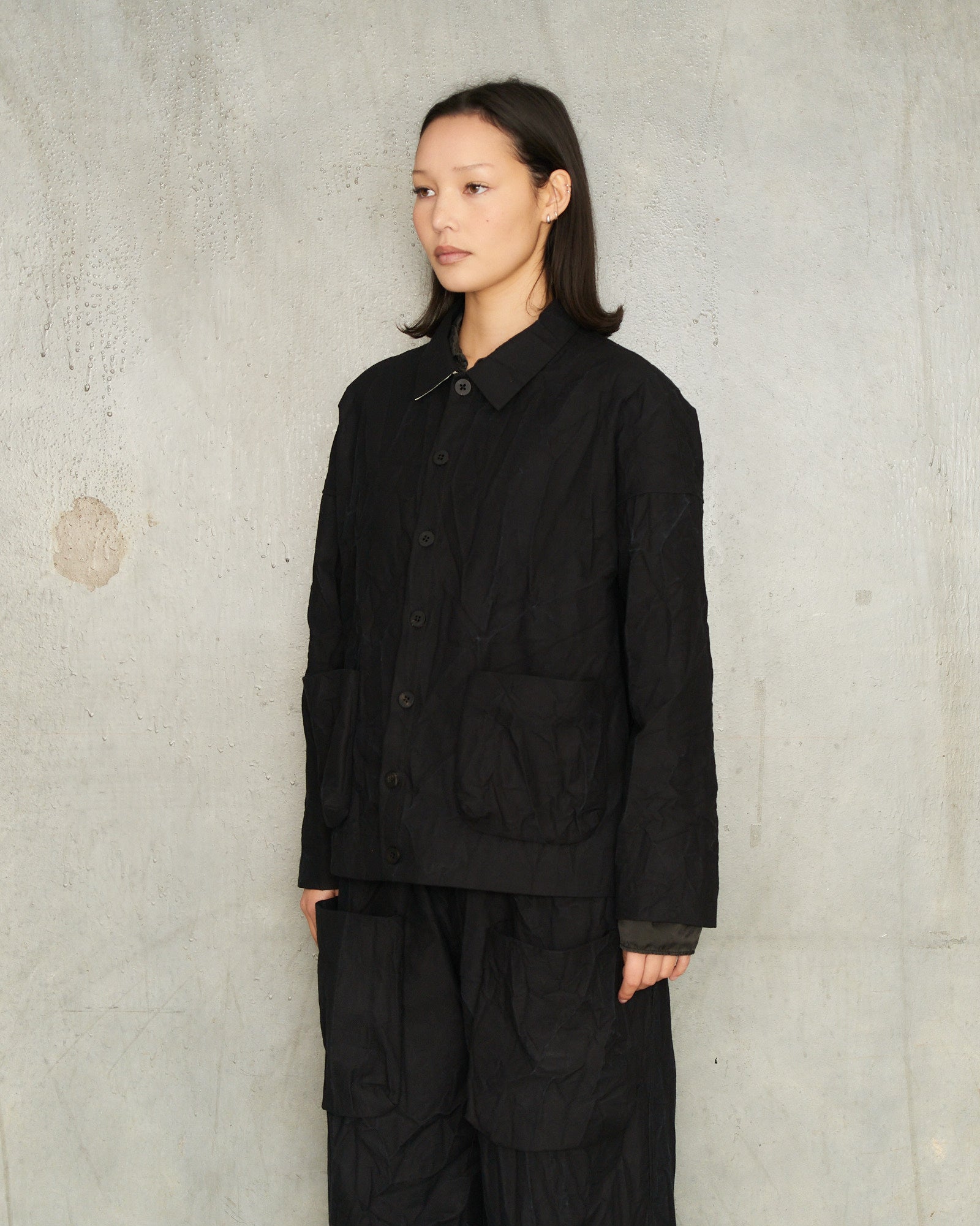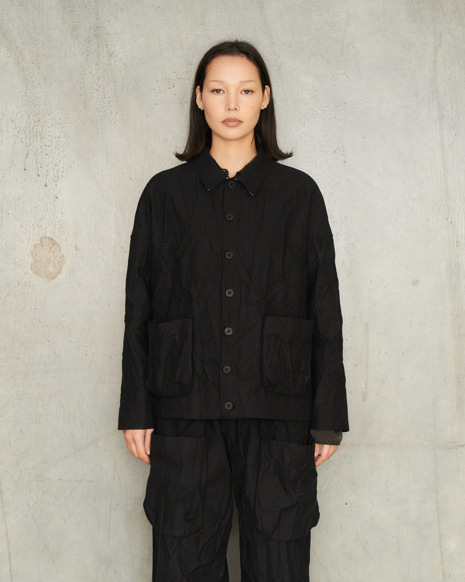 Crash overshirt by Album di Famiglia in black. Utilitarian shirt jacket in crumpled cotton, defined by a pointed collar and neat button fastening. Oversized patch pockets at the waist anchor its pragmatic, workwear spirit.