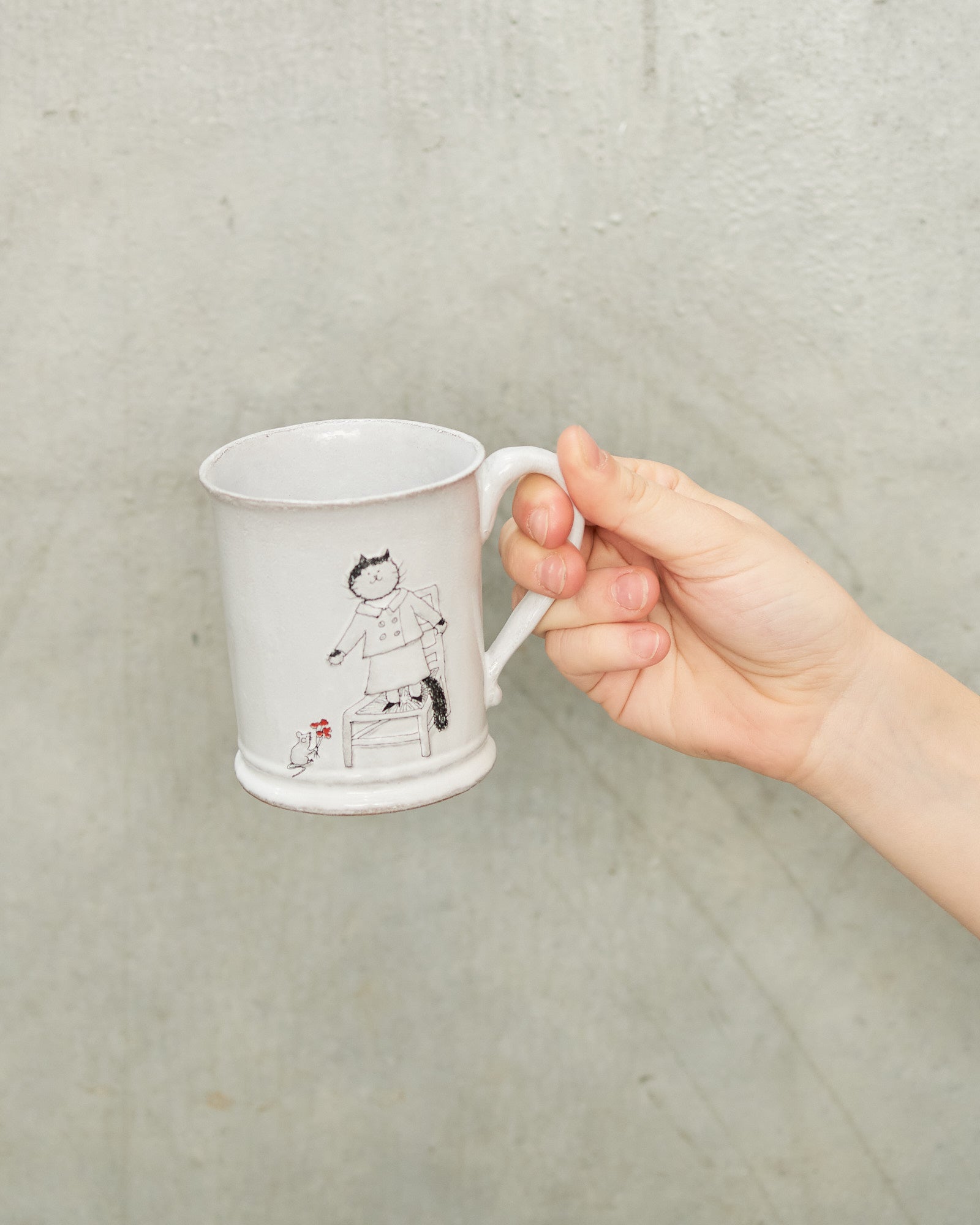 Blanket love Grace mug by Astier de Villatte. Handmade ceramic mug with intricate cat and mouse illustration.