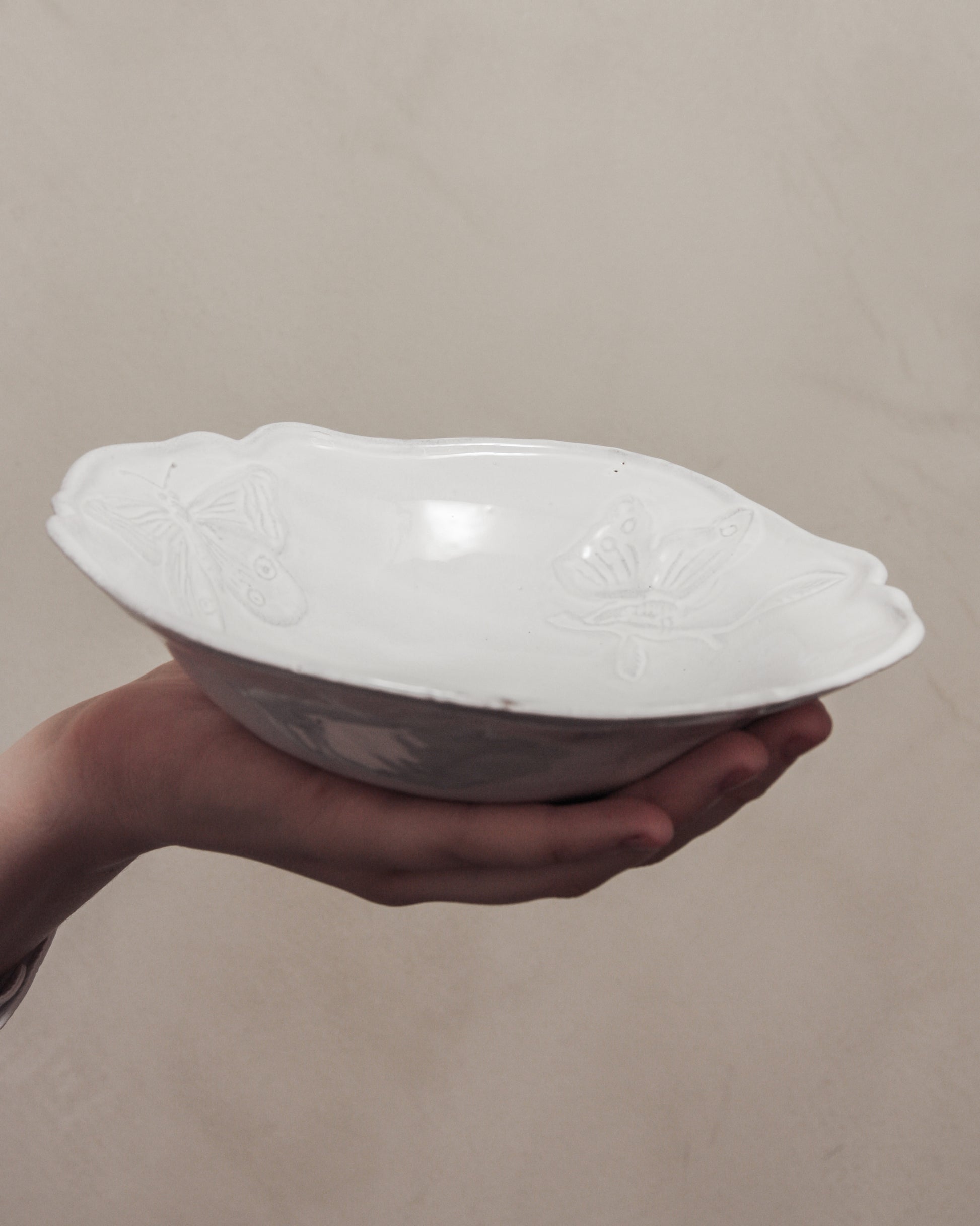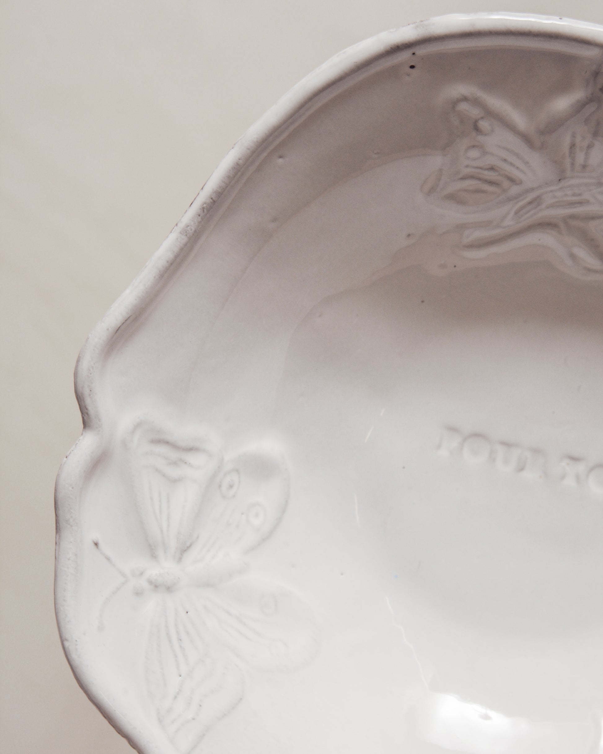 Small Fleurs soup plate by Astier de Villatte. Medium sized dish adorned with butterflies and flowers, inscribed in the centre with "pour toi," - for you.
