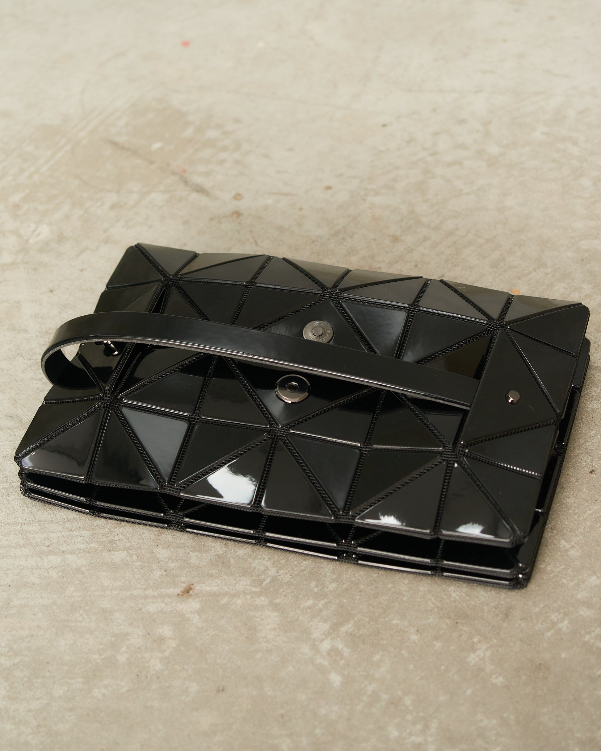 Beyond shoulder bag by Bao Bao Issey Miyake in black, featuring signature triangular tiling and an accordion-like structure that expands into sculptural diamond forms when opened.